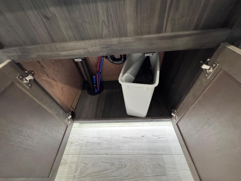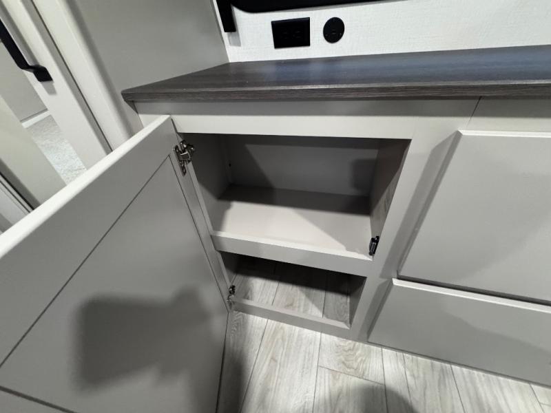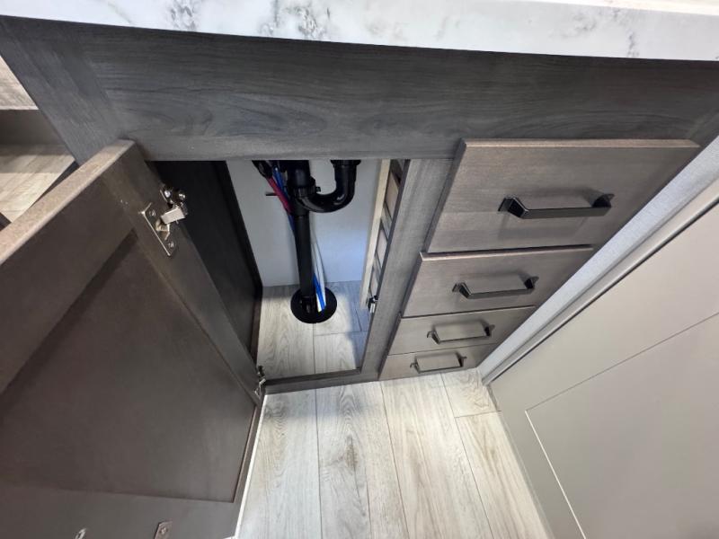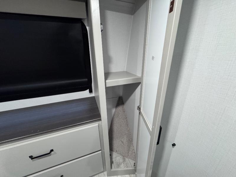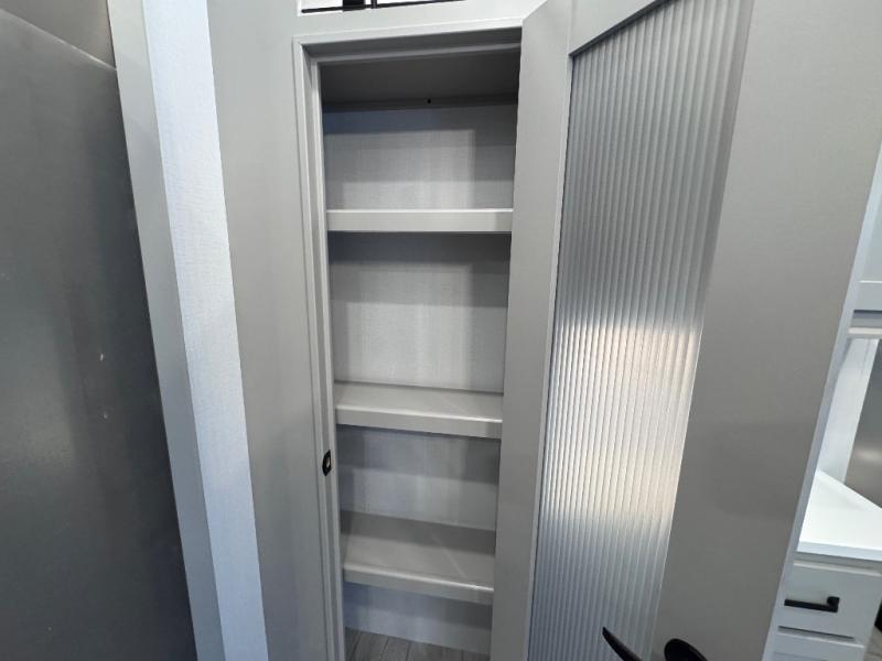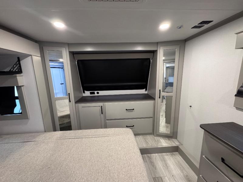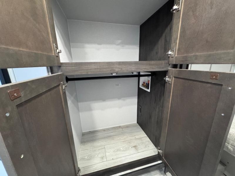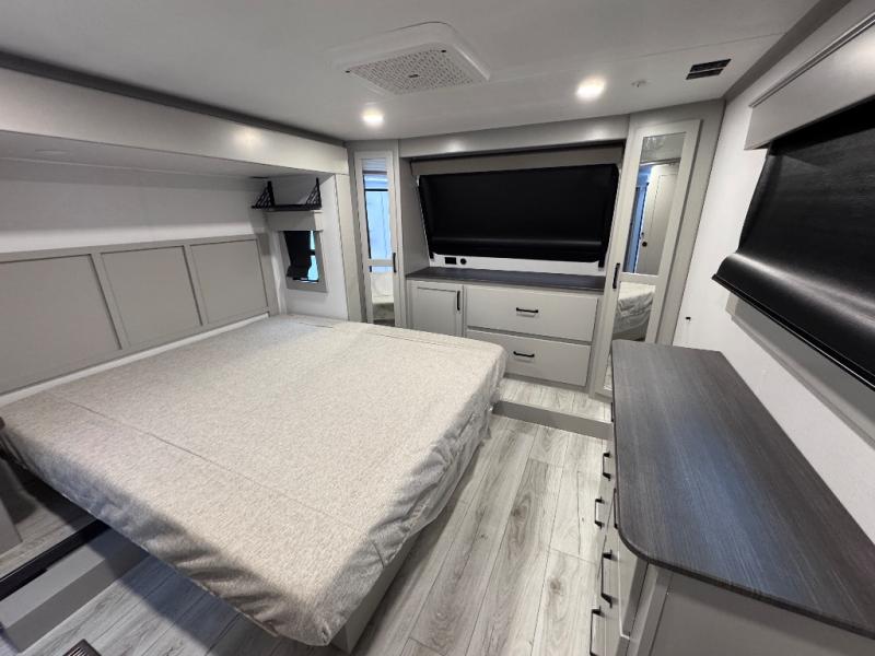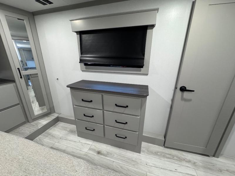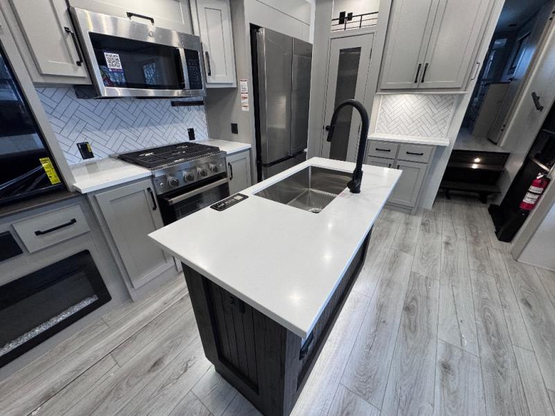 You will be living in true luxury with this Montana High Country fifth wheel! First of all, you'll have your own master suite up at the front with a king bed slide out. The bedroom also has great storage space for your clothes with the two dressers and two wardrobes. Second, there is a great sleeping area in the back for the extra travelers you have with you. The RV queen-size bunks allow four adults to sleep comfortably each night in this area, and there is even a hide-a-bed sofa next to the bunks for yet another set of sleepy campers. The power theater seating sits directly across from the fireplace and 50" LED TV, and the kitchen island has a countertop extension for even more prep space in the kitchen.
