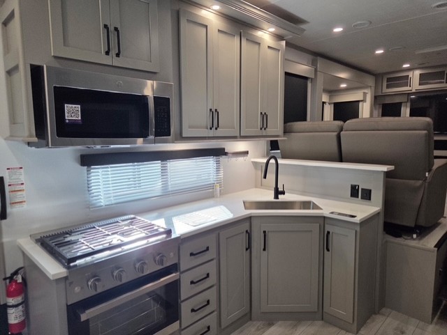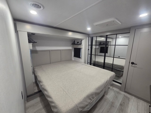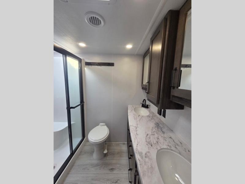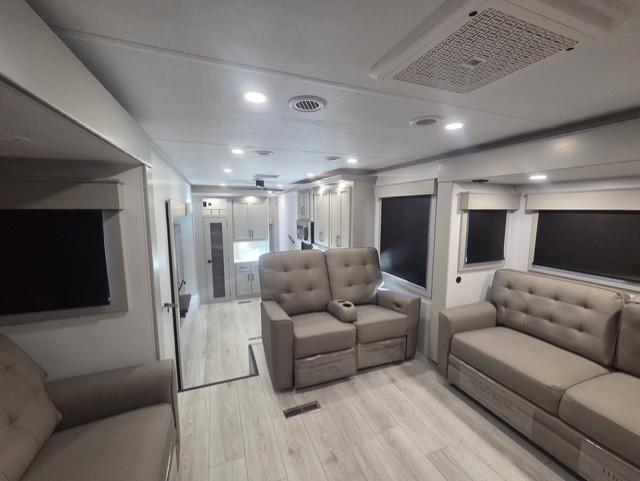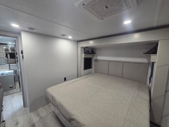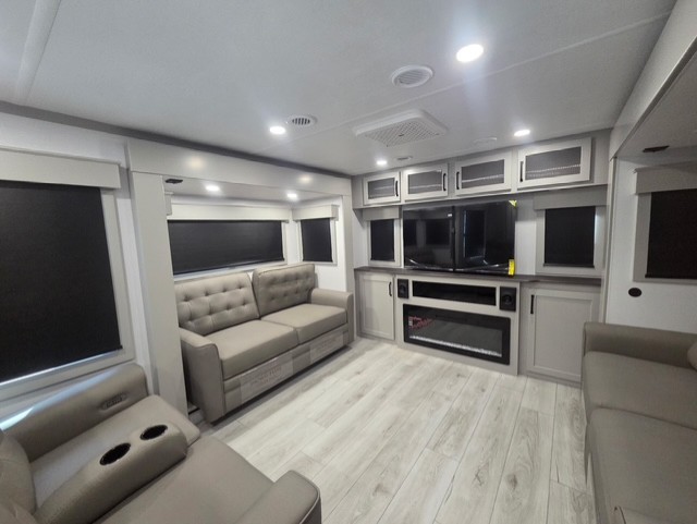 You'll be able to love this Montana High Country fifth wheel for years and years and years! The separated living room in the back feels just like your living room at home with its power theater seating, two hide-a-bed sofas, fireplace, and 50" LED Smart TV. The kitchen is also very residential with its three-burner range with glass top, residential microwave, residential refrigerator, pantry, and coffee station. When you enter this unit, there is a coat closet for you to place your boots and hats in, and for more clothing storage, just use the under-bed storage up in the private bedroom.