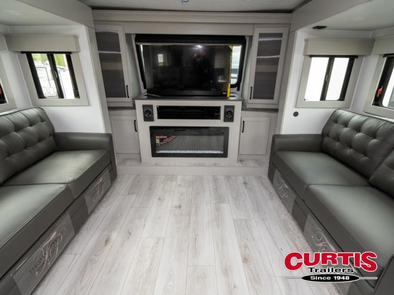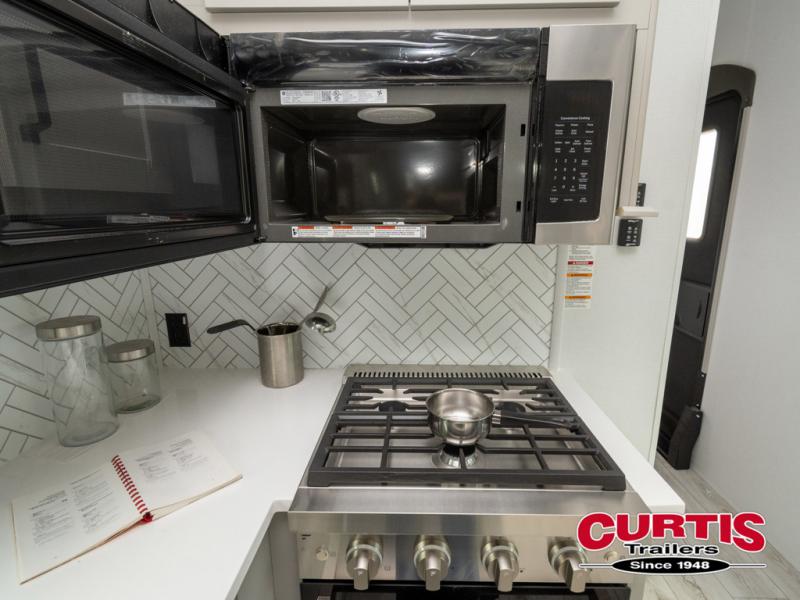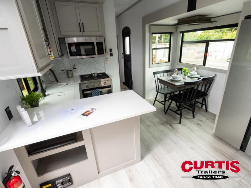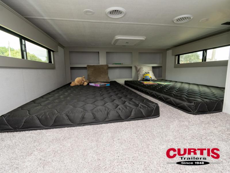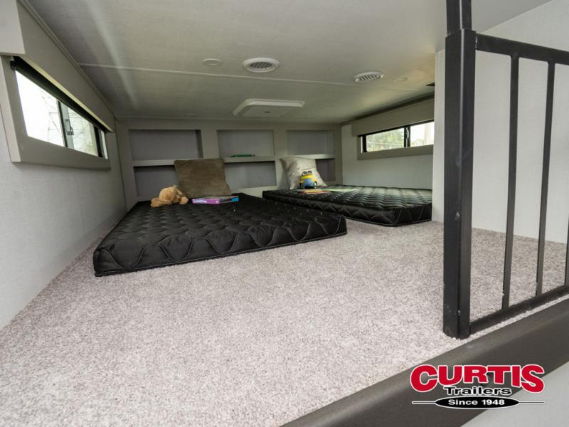 Include all of your favorite people on your next adventure in this Montana High Country fifth wheel! Not only is there a rear private bedroom with a king-size bed for you, but there is also a loft above with stairs that take you to the bunk mats. Now your kids will have their own space too. You can even host a few other travelers up front in the separate living room on the two hide-a-bed sofas. This area will be perfect for cozy sleeping because of the fireplace, and you can even watch a movie as you drift off to sleep because of the 50" LED TV too. The full bathroom has a 48" x 30" shower with seat, and the kitchen has a breakfast bar that you can sit at to eat your cereal each morning