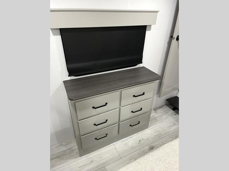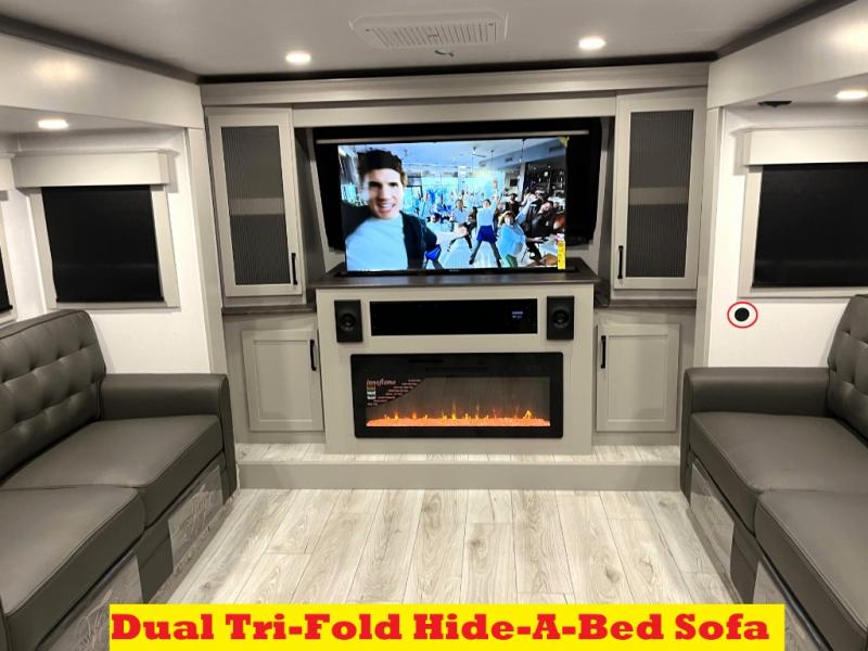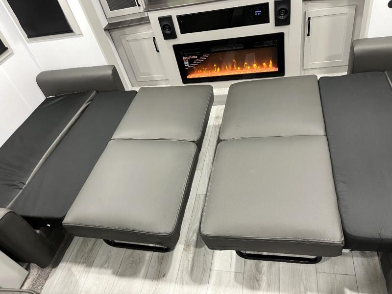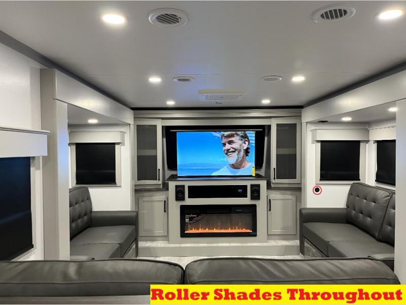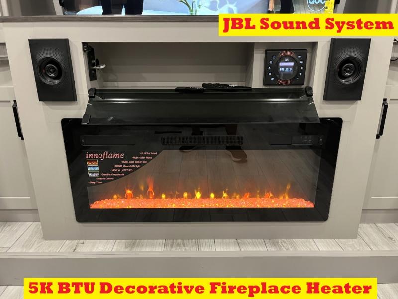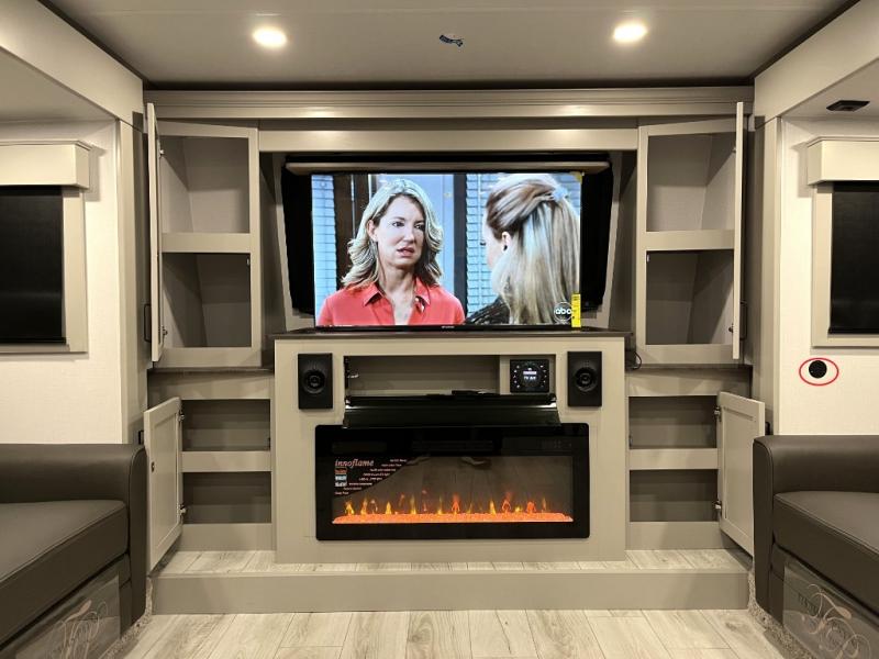Include all of your favorite people on your next adventure in this Montana High Country fifth wheel! Not only is there a rear private bedroom with a king-size bed for you, but there is also a loft above with stairs that take you to the bunk mats. Now your kids will have their own space too. You can even host a few other travelers up front in the separate living room on the two hide-a-bed sofas. This area will be perfect for cozy sleeping because of the fireplace, and you can even watch a movie as you drift off to sleep because of the 50" LED TV too. The full bathroom has a 48" x 30" shower with seat, and the kitchen has a breakfast bar that you can sit at to eat your cereal each morning