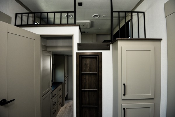 Two full bathrooms and two private bedrooms make this fifth wheel perfect for camping with friends and family. The front bedroom includes a king bed with a queen bed option, a large front wardrobe, plus stackable washer and dryer prep. The rear master bedroom has two closets plus a dresser and underbed storage, plus its own full bath with an exterior entry door for convenience. There is even a loft above the rear bedroom for even more sleeping space! Everyone can meet in the main living area/kitchen to relax on the power theater seat as the chef cooks dinner, and you can watch a show on the Smart HDTV to pass the time. The kitchen island will provide more counter space, along with the hutch that includes overhead cabinets as well. Don't let this luxury fifth wheel slip away!