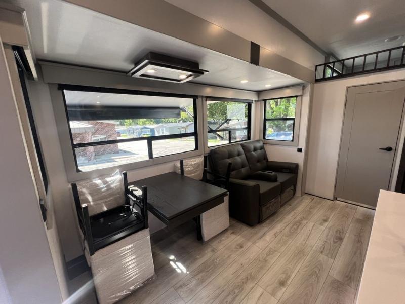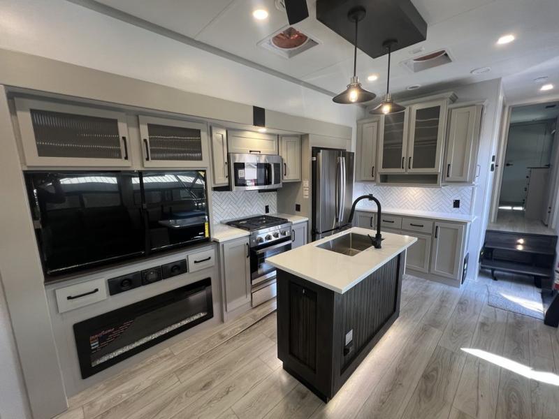 Two full bathrooms and two private bedrooms make this fifth wheel perfect for camping with friends and family. The front bedroom includes a king bed with a queen bed option, a large front wardrobe, plus stackable washer and dryer prep. The rear master bedroom has two closets plus a dresser and underbed storage, plus its own full bath with an exterior entry door for convenience. There is even a loft above the rear bedroom for even more sleeping space! Everyone can meet in the main living area/kitchen to relax on the power theater seat as the chef cooks dinner, and you can watch a show on the Smart HDTV to pass the time. The kitchen island will provide more counter space, along with the hutch that includes overhead cabinets as well. Don't let this luxury fifth wheel slip away!