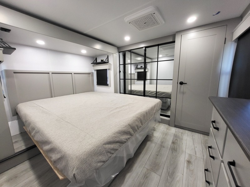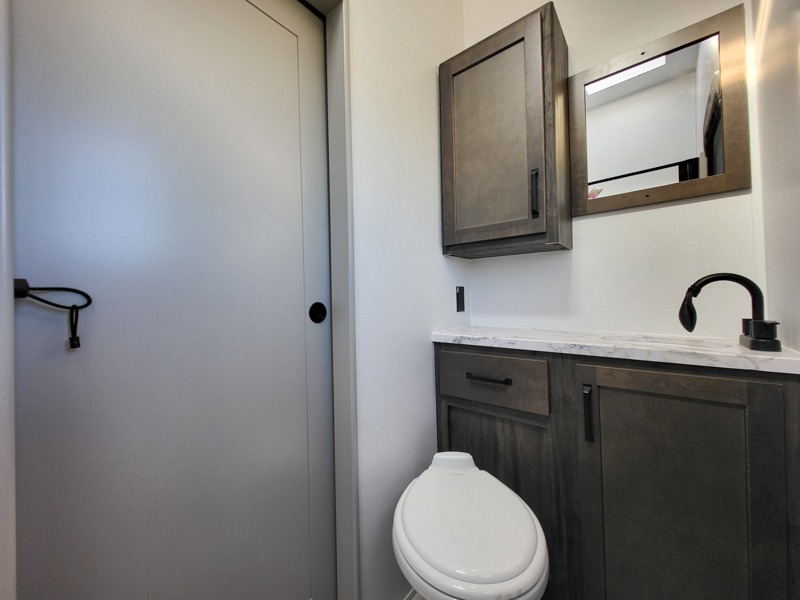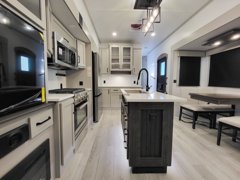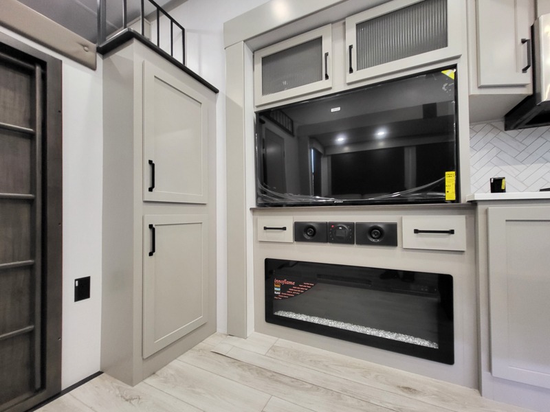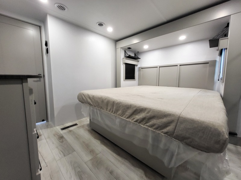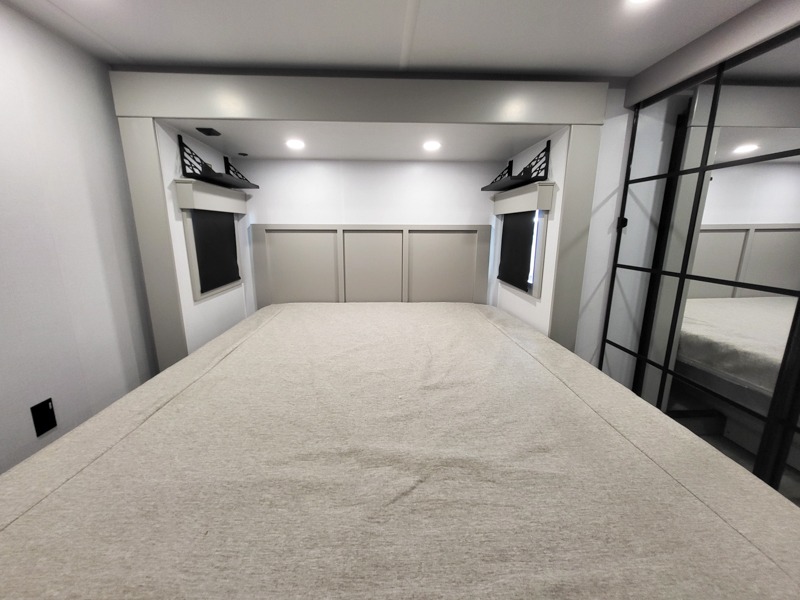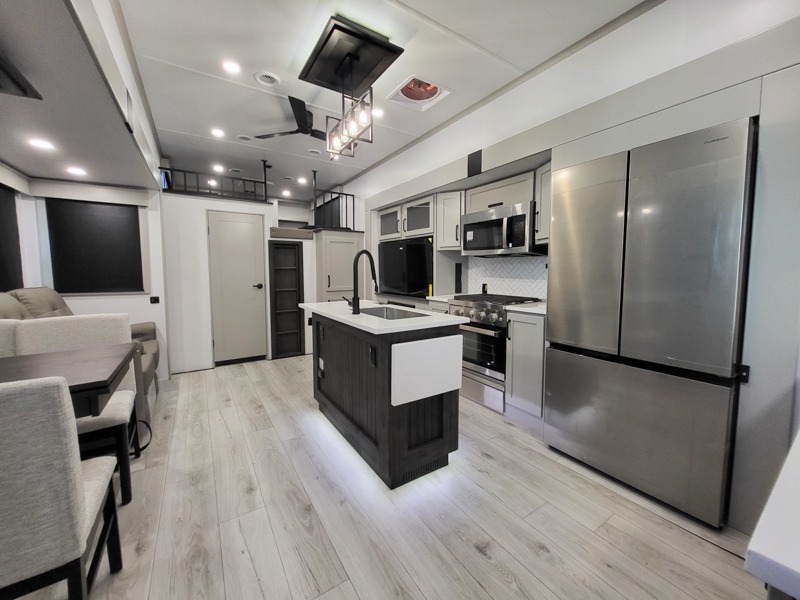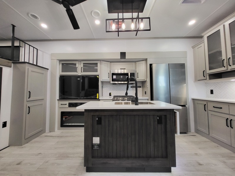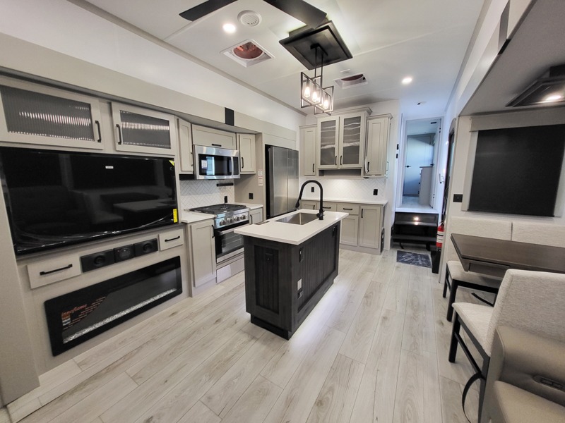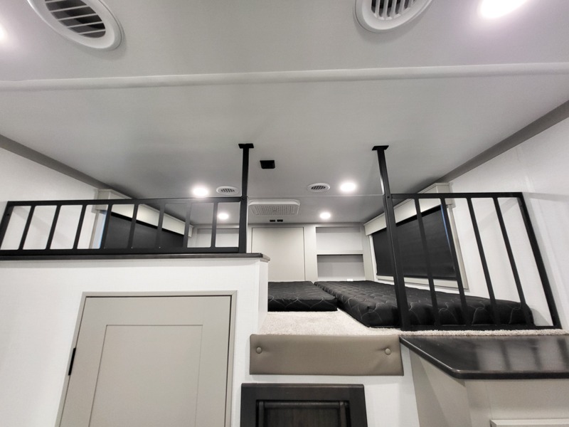 Two full bathrooms and two private bedrooms make this fifth wheel perfect for camping with friends and family. The front bedroom includes a king bed with a queen bed option, a large front wardrobe, plus stackable washer and dryer prep. The rear master bedroom has two closets plus a dresser and underbed storage, plus its own full bath with an exterior entry door for convenience. There is even a loft above the rear bedroom for even more sleeping space! Everyone can meet in the main living area/kitchen to relax on the power theater seat as the chef cooks dinner, and you can watch a show on the Smart HDTV to pass the time. The kitchen island will provide more counter space, along with the hutch that includes overhead cabinets as well. Don't let this luxury fifth wheel slip away!