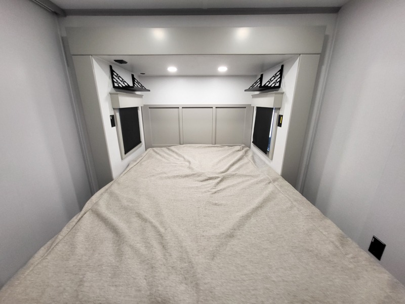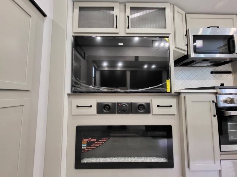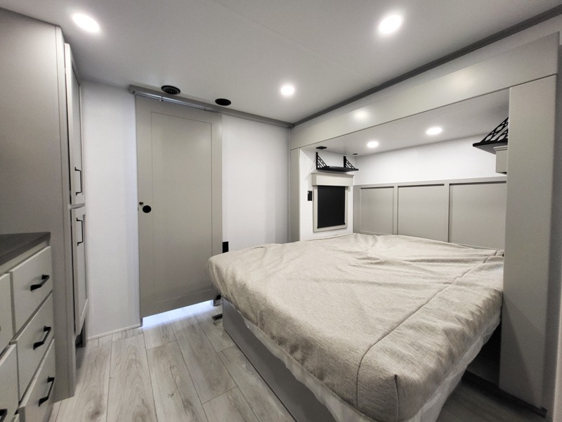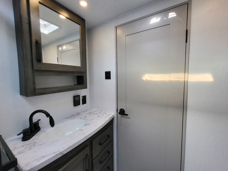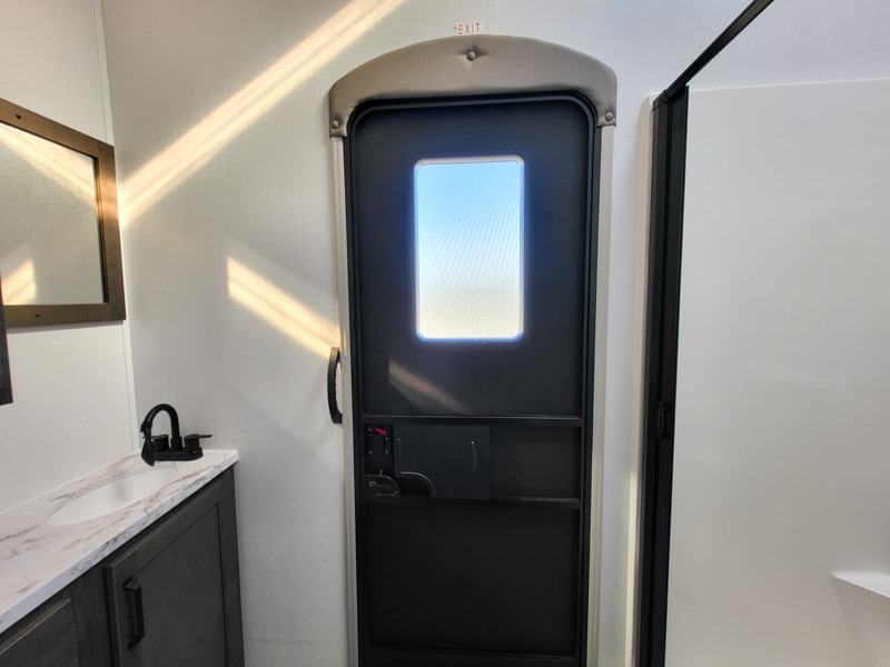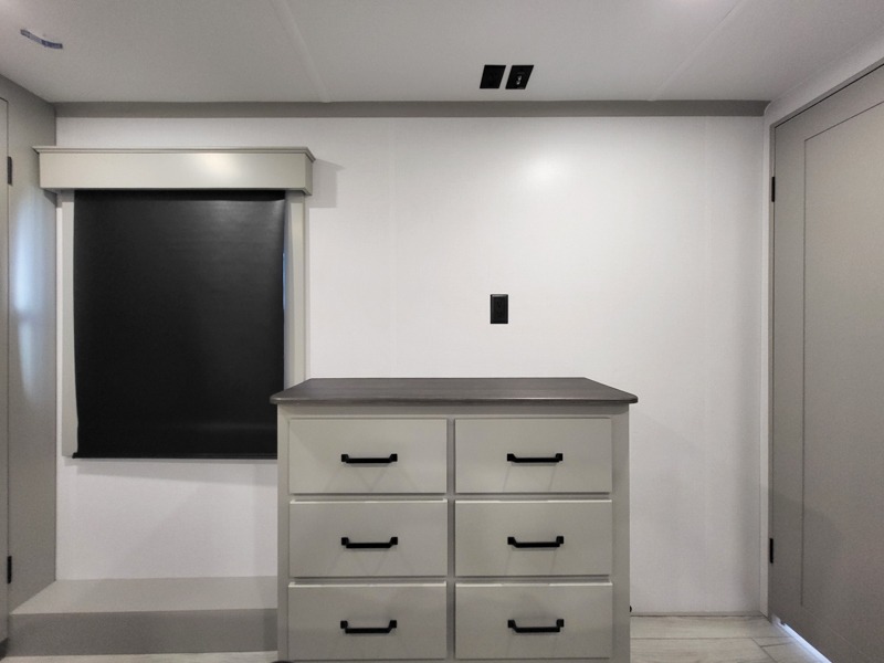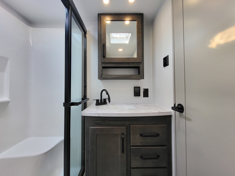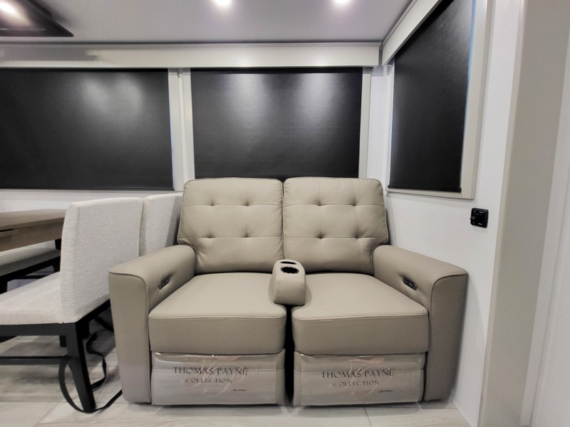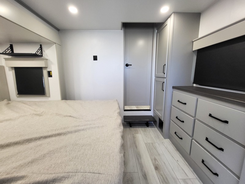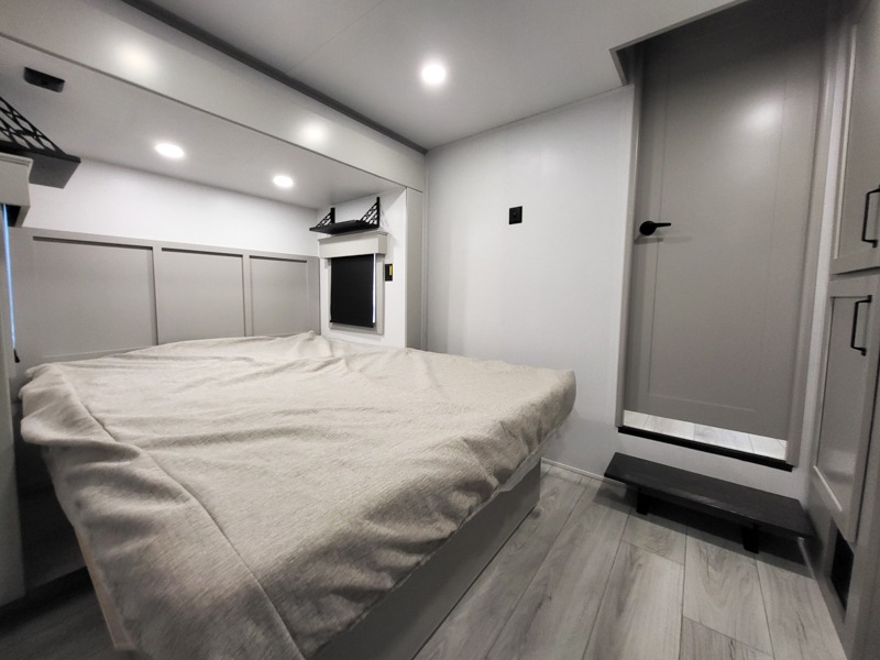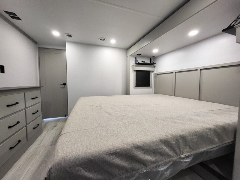 Two full bathrooms and two private bedrooms make this fifth wheel perfect for camping with friends and family. The front bedroom includes a king bed with a queen bed option, a large front wardrobe, plus stackable washer and dryer prep. The rear master bedroom has two closets plus a dresser and underbed storage, plus its own full bath with an exterior entry door for convenience. There is even a loft above the rear bedroom for even more sleeping space! Everyone can meet in the main living area/kitchen to relax on the power theater seat as the chef cooks dinner, and you can watch a show on the Smart HDTV to pass the time. The kitchen island will provide more counter space, along with the hutch that includes overhead cabinets as well. Don't let this luxury fifth wheel slip away!