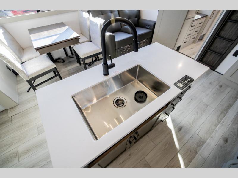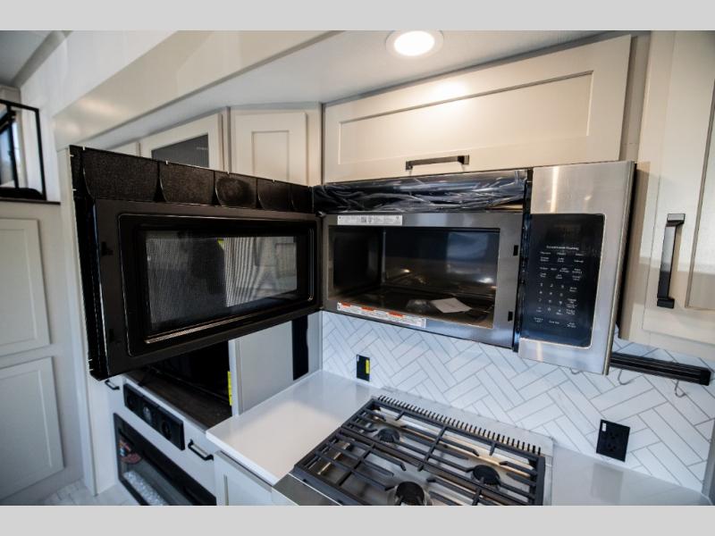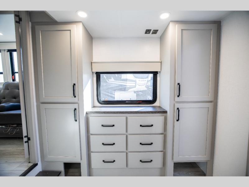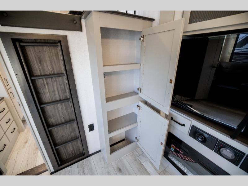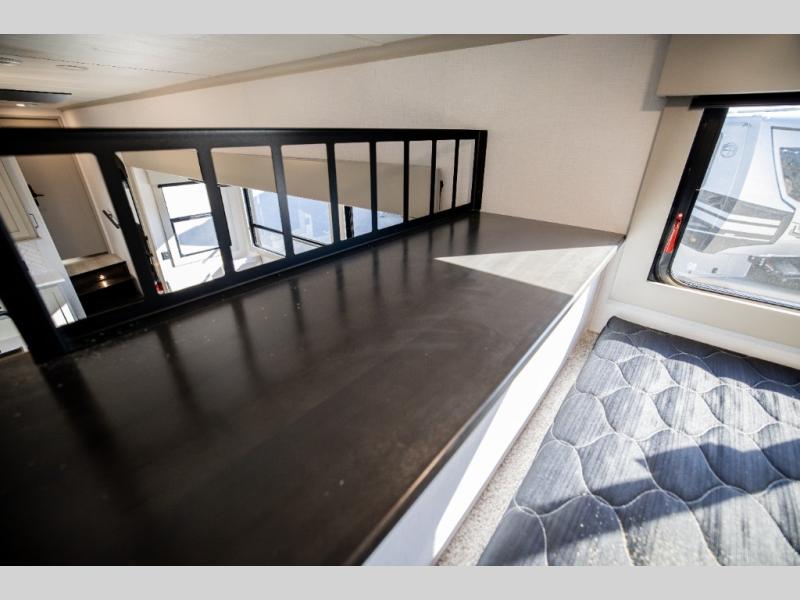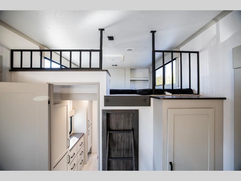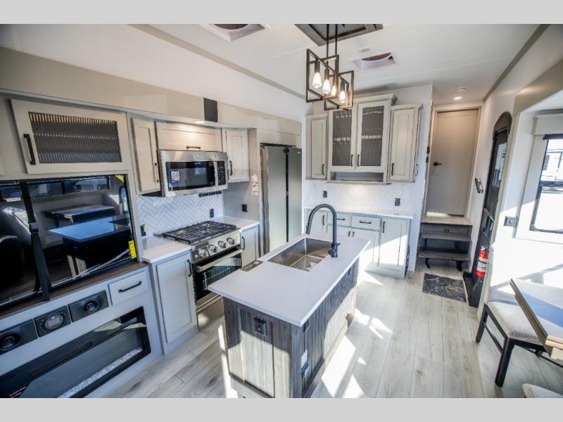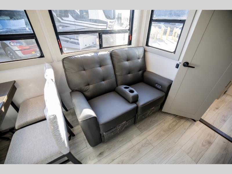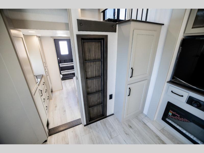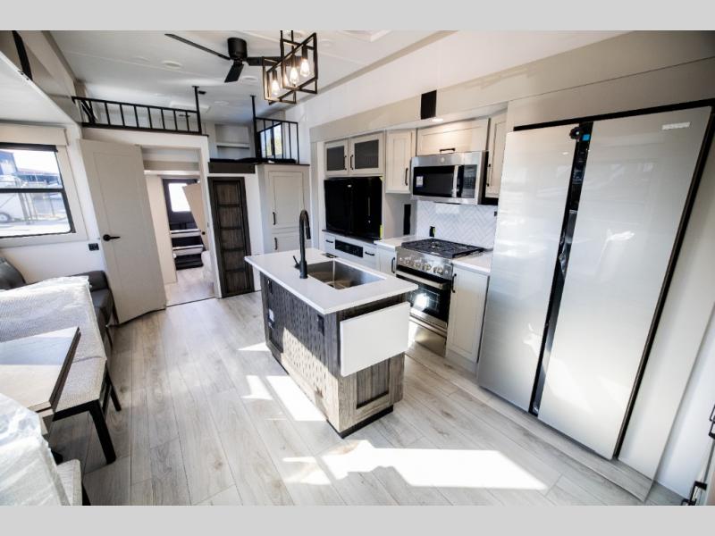 Two full bathrooms and two private bedrooms make this fifth wheel perfect for camping with friends and family. The front bedroom includes a king bed with a queen bed option, a large front wardrobe, plus stackable washer and dryer prep. The rear master bedroom has two closets plus a dresser and underbed storage, plus its own full bath with an exterior entry door for convenience. There is even a loft above the rear bedroom for even more sleeping space! Everyone can meet in the main living area/kitchen to relax on the power theater seat as the chef cooks dinner, and you can watch a show on the Smart HDTV to pass the time. The kitchen island will provide more counter space, along with the hutch that includes overhead cabinets as well. Don't let this luxury fifth wheel slip away!