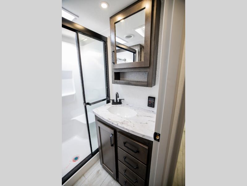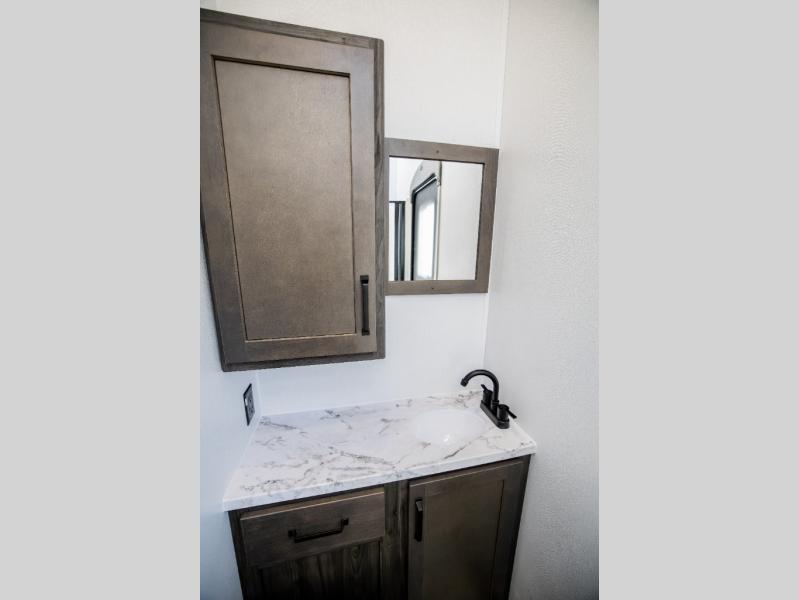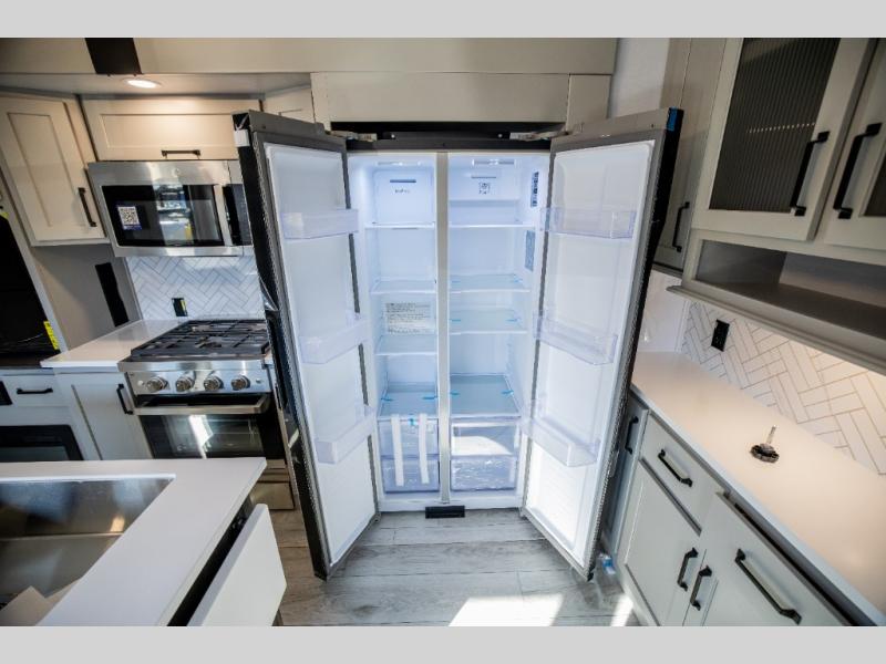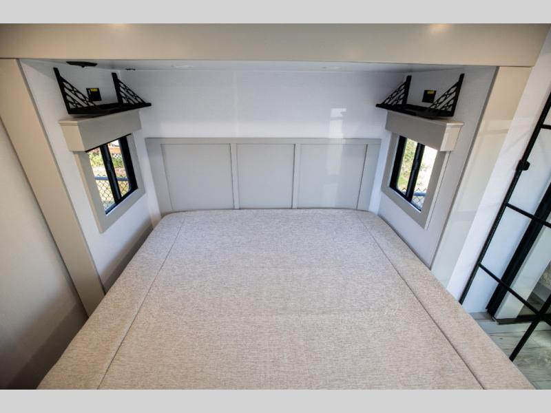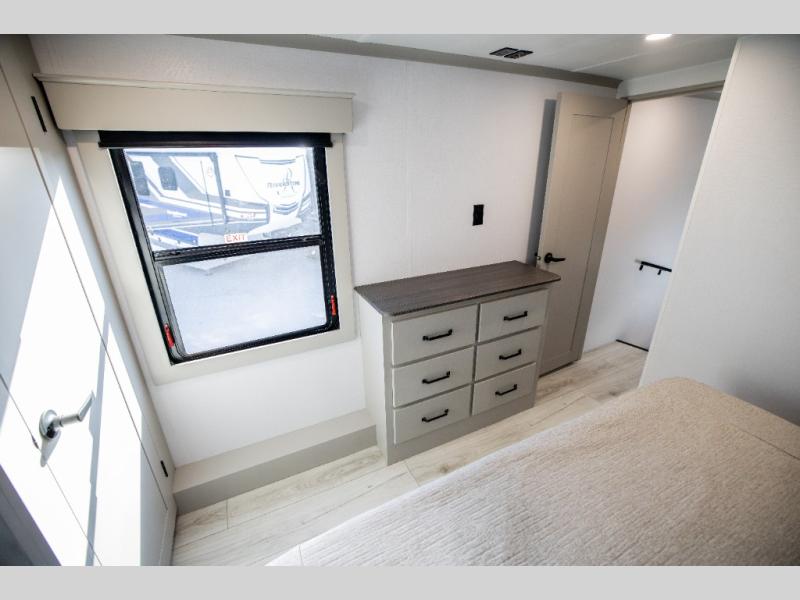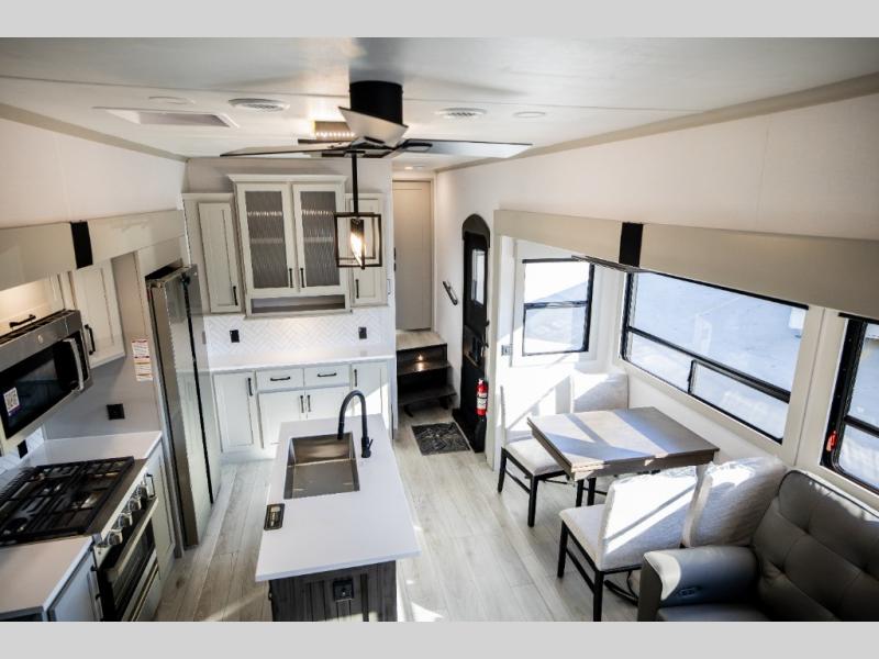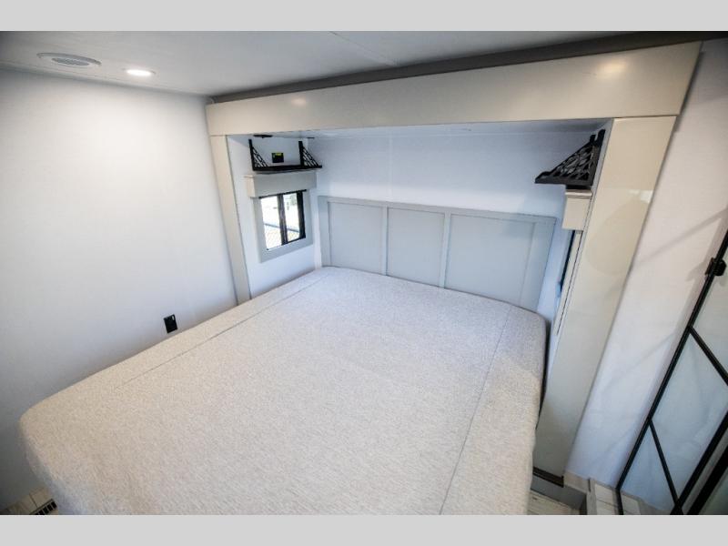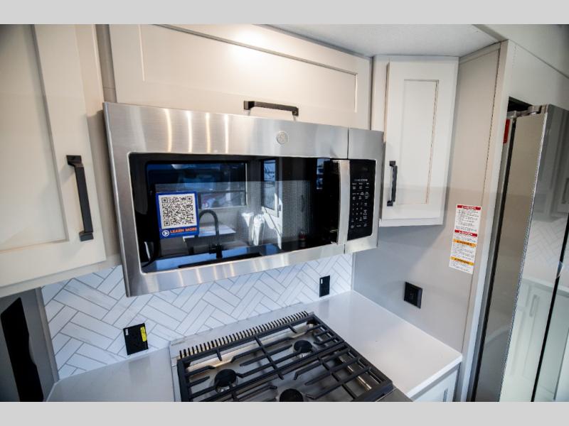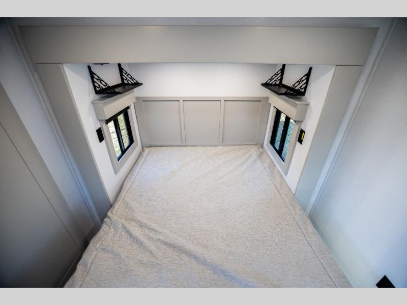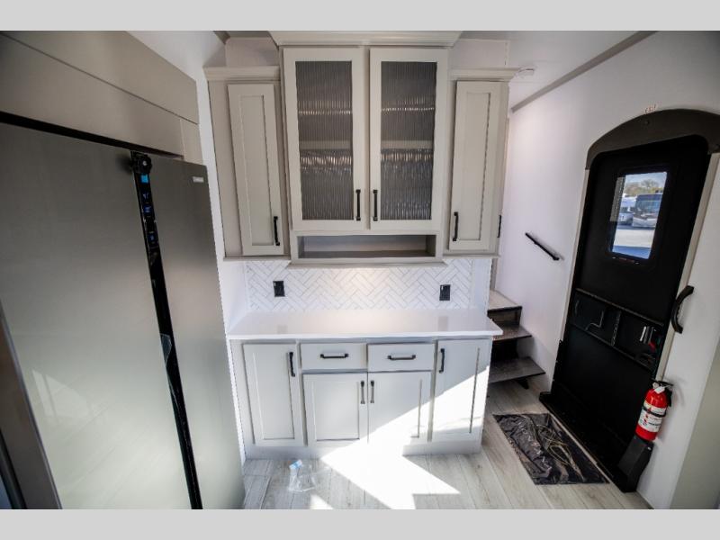 Two full bathrooms and two private bedrooms make this fifth wheel perfect for camping with friends and family. The front bedroom includes a king bed with a queen bed option, a large front wardrobe, plus stackable washer and dryer prep. The rear master bedroom has two closets plus a dresser and underbed storage, plus its own full bath with an exterior entry door for convenience. There is even a loft above the rear bedroom for even more sleeping space! Everyone can meet in the main living area/kitchen to relax on the power theater seat as the chef cooks dinner, and you can watch a show on the Smart HDTV to pass the time. The kitchen island will provide more counter space, along with the hutch that includes overhead cabinets as well. Don't let this luxury fifth wheel slip away!