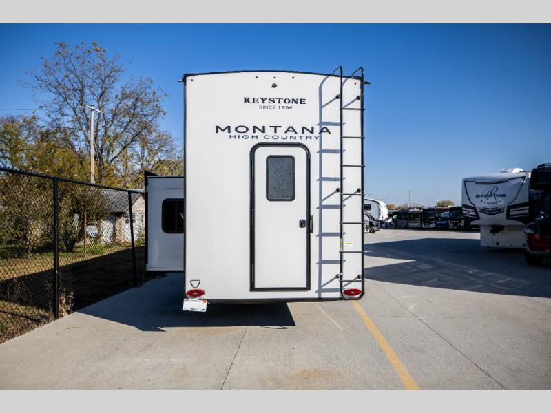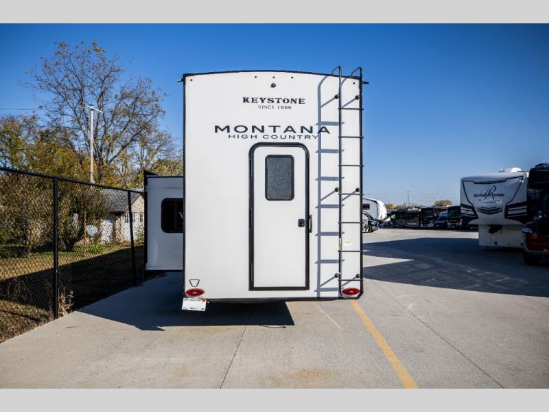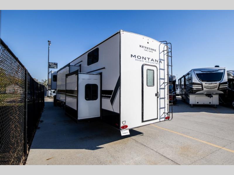 Live the high life with a Keystone Montana High Country fifth wheel! You'll have all the luxury you need with these units. They come with a MaxTurn™ front cap with KeyShield™ automotive-grade paint, a fully walkable roof with Alpha seamless TPO membrane system, and an insulated underbelly with forced hot air and electric tank heaters. The MORryde CRE3000 suspension with wet bolts helps provide a smooth tow, and the Ground Control® four-point electric auto-leveling with hitch memory will make set-up quite easy. The interior is elegantly appointed with the Thomas Payne Collection furniture, hardwood decorative slide-out fascia, Beauflor® vinyl throughout, accent crown molding, and premium solid surface kitchen countertops.
