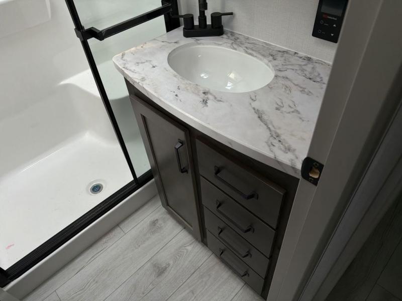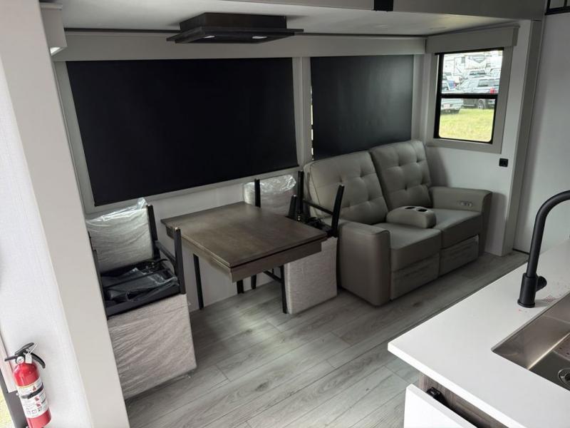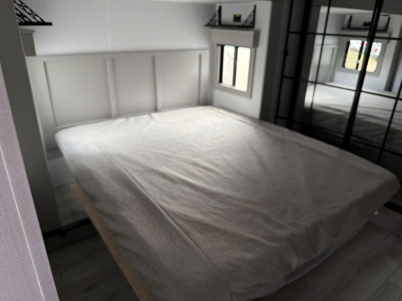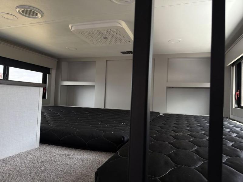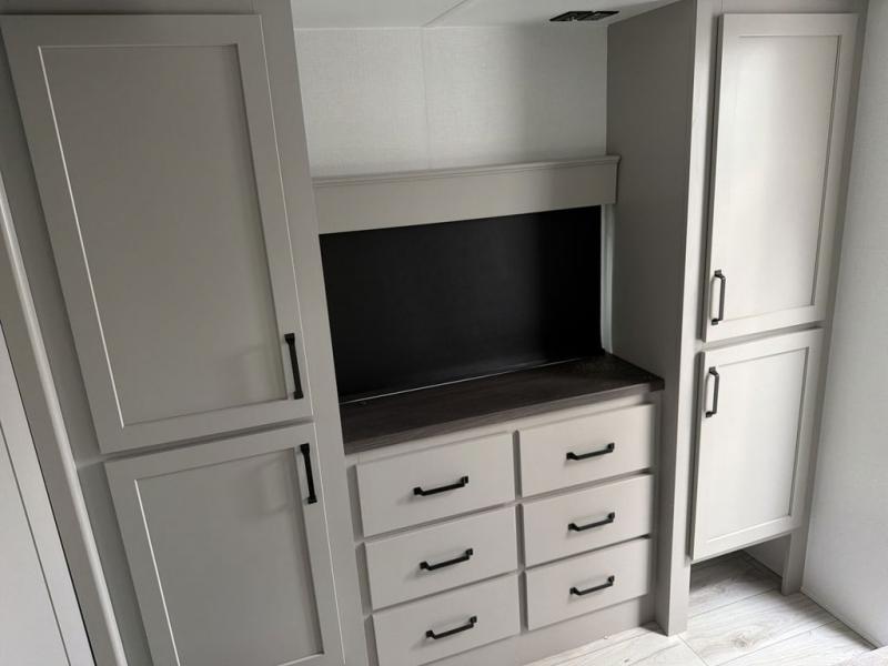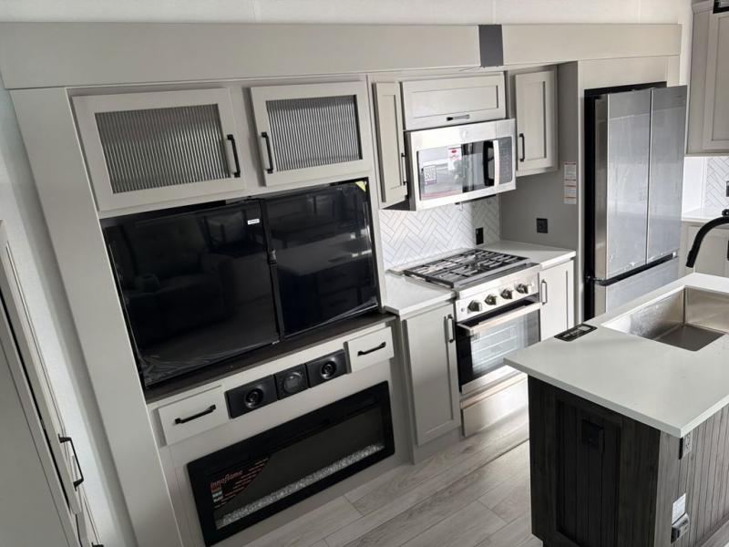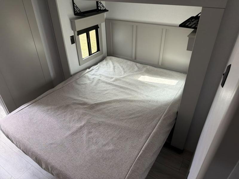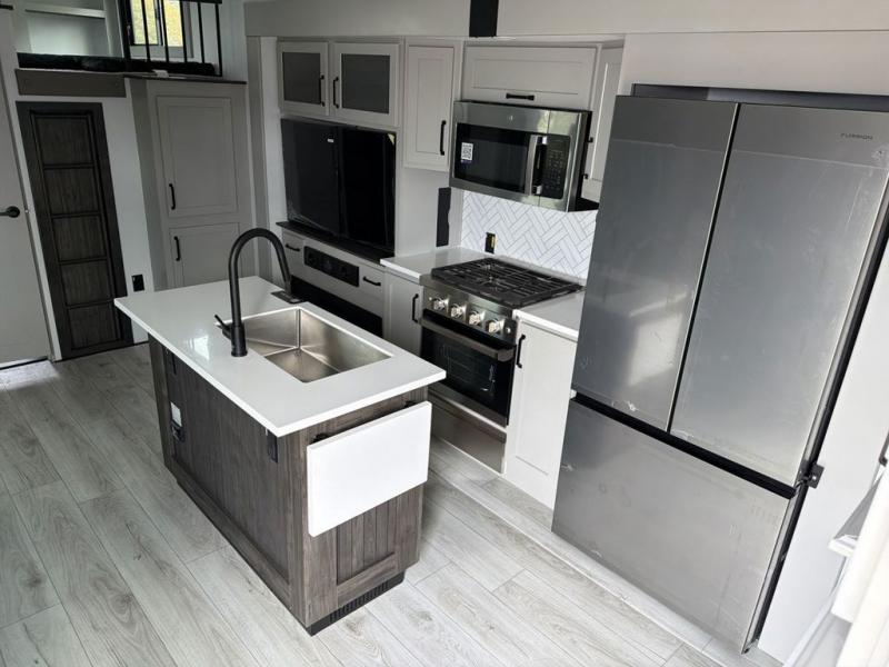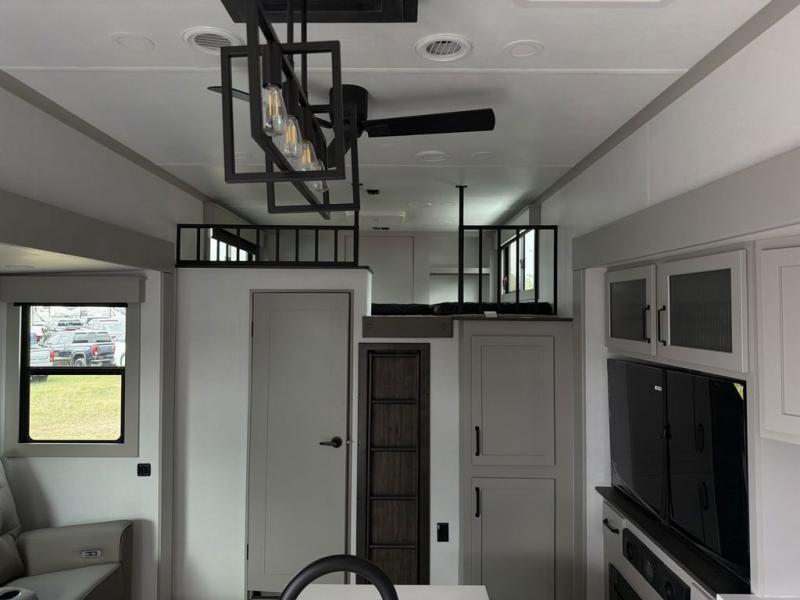 Two full bathrooms and two private bedrooms make this fifth wheel perfect for camping with friends and family. The front bedroom includes a king bed with a queen bed option, a large front wardrobe, plus stackable washer and dryer prep. The rear master bedroom has two closets plus a dresser and underbed storage, plus its own full bath with an exterior entry door for convenience. There is even a loft above the rear bedroom for even more sleeping space! Everyone can meet in the main living area/kitchen to relax on the power theater seat as the chef cooks dinner, and you can watch a show on the Smart HDTV to pass the time. The kitchen island will provide more counter space, along with the hutch that includes overhead cabinets as well. Don't let this luxury fifth wheel slip away!