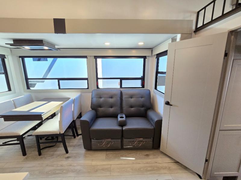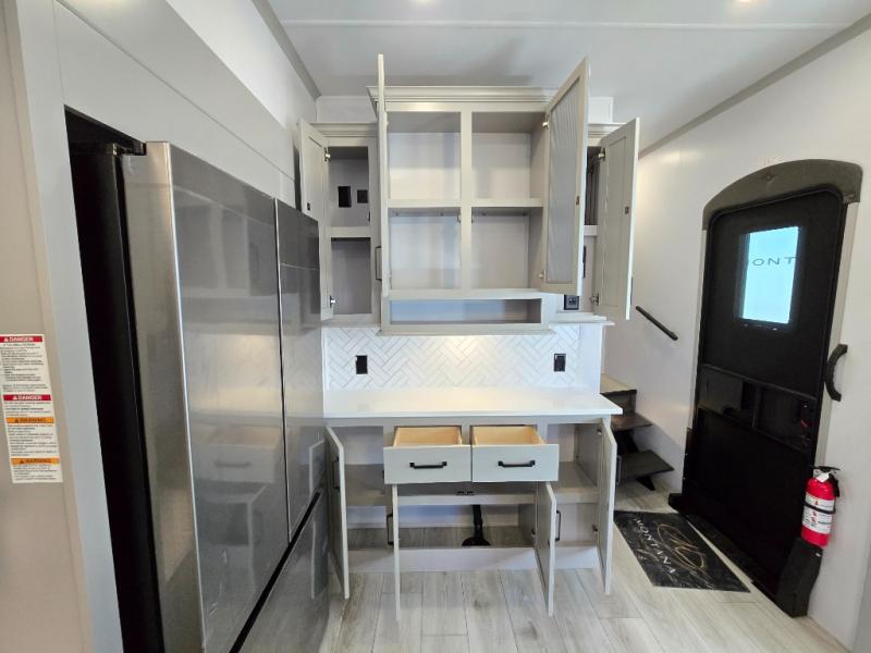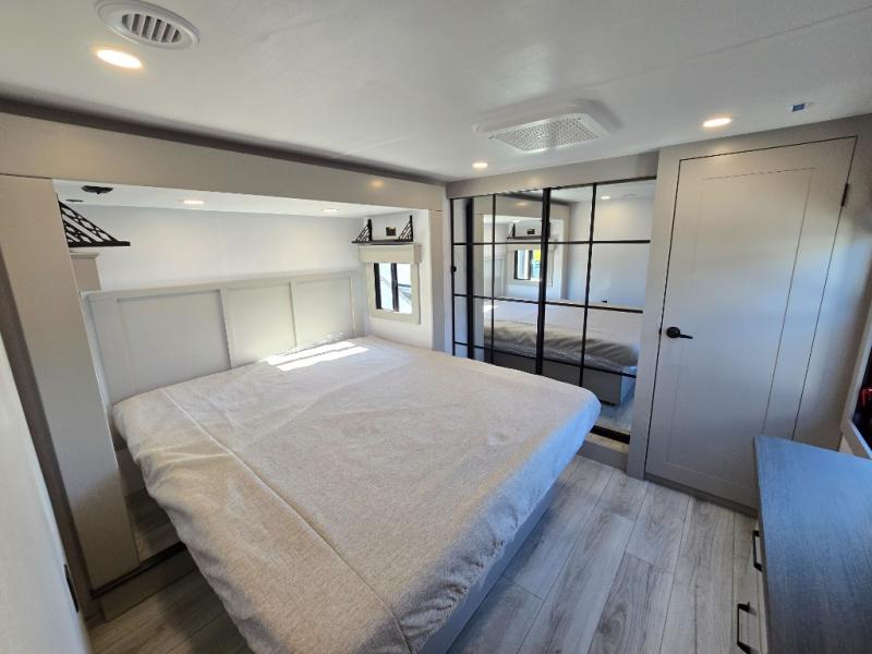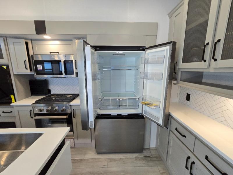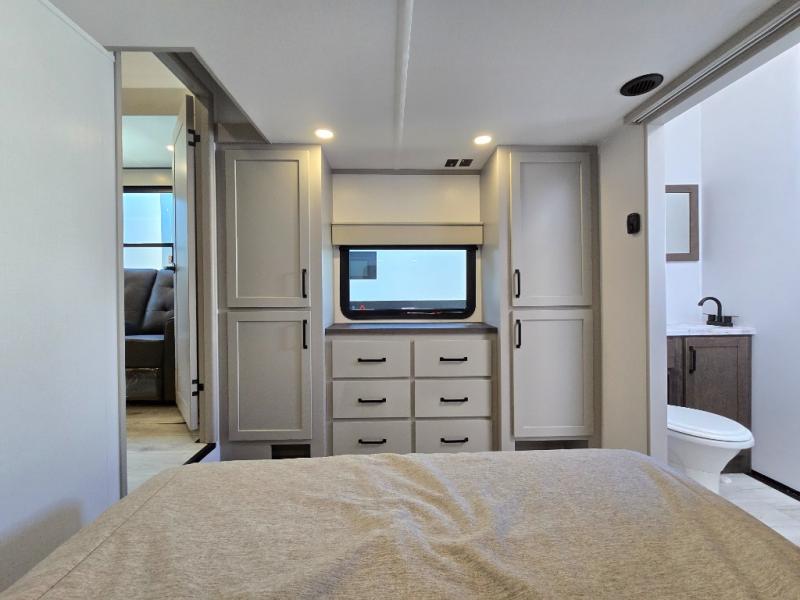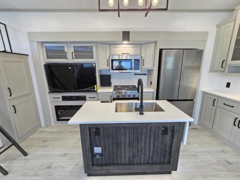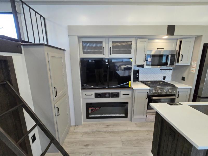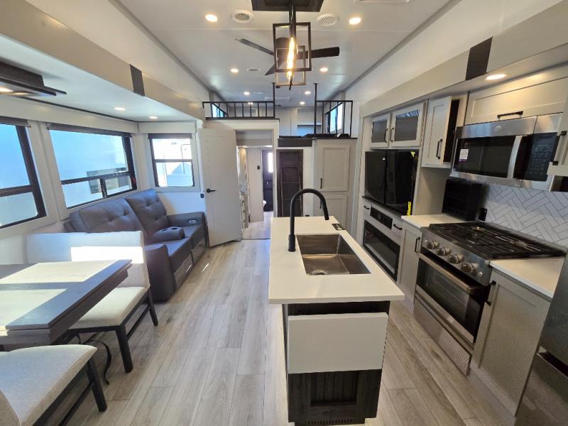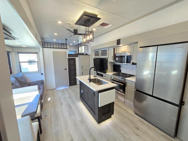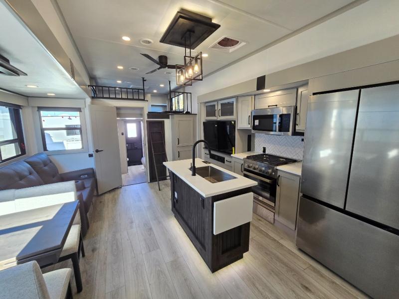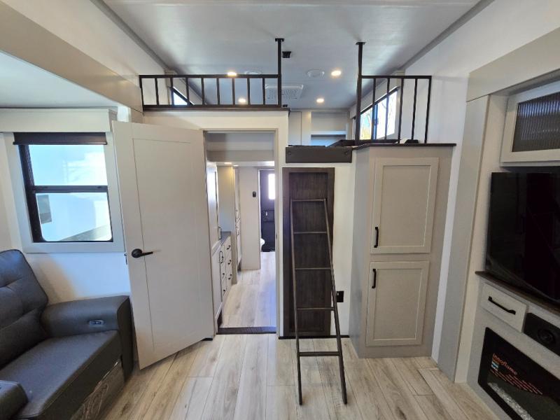 Two full bathrooms and two private bedrooms make this fifth wheel perfect for camping with friends and family. The front bedroom includes a king bed with a queen bed option, a large front wardrobe, plus stackable washer and dryer prep. The rear master bedroom has two closets plus a dresser and underbed storage, plus its own full bath with an exterior entry door for convenience. There is even a loft above the rear bedroom for even more sleeping space! Everyone can meet in the main living area/kitchen to relax on the power theater seat as the chef cooks dinner, and you can watch a show on the Smart HDTV to pass the time. The kitchen island will provide more counter space, along with the hutch that includes overhead cabinets as well. Don't let this luxury fifth wheel slip away!