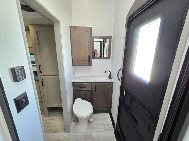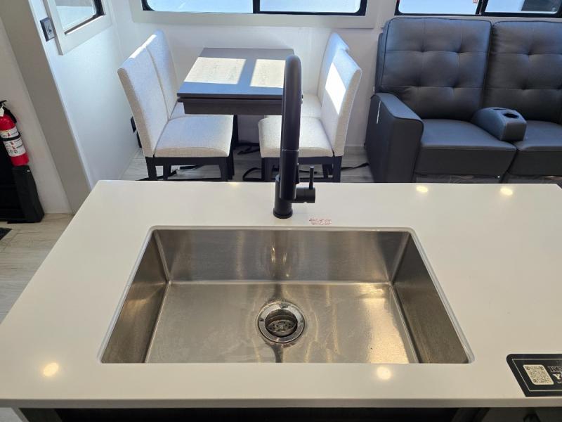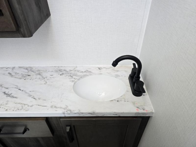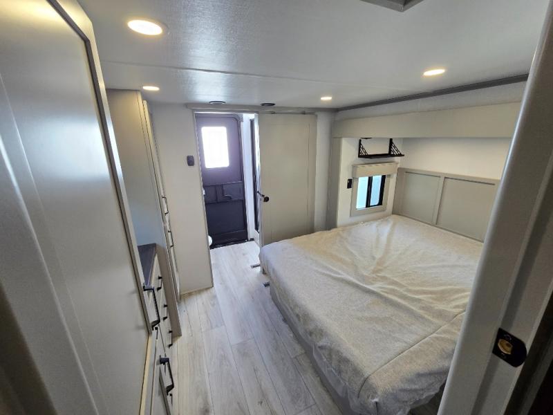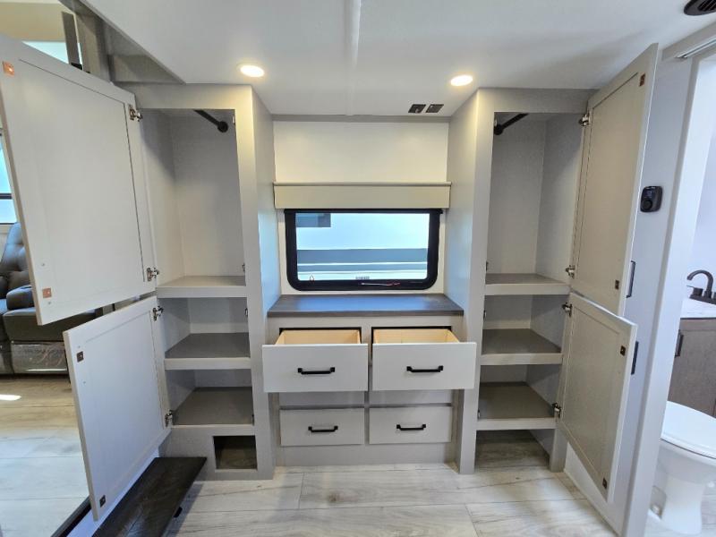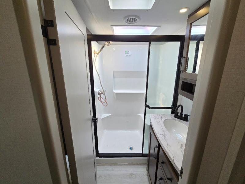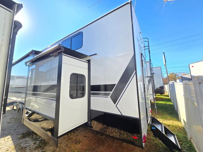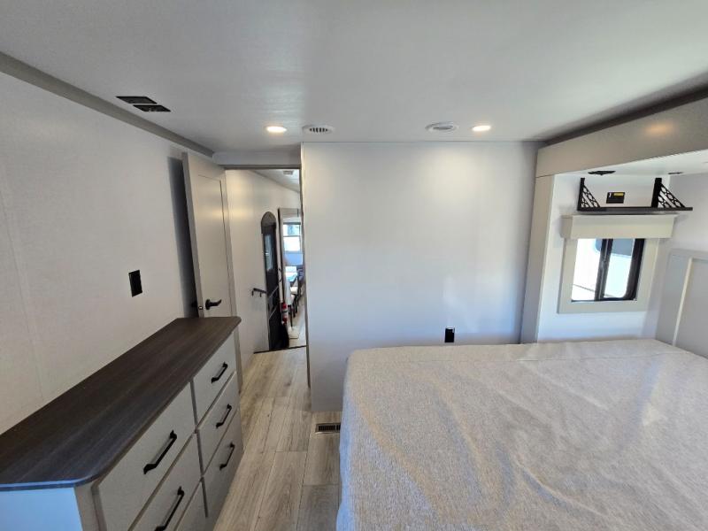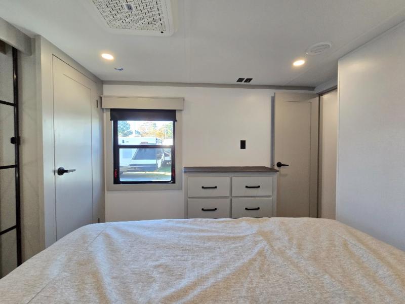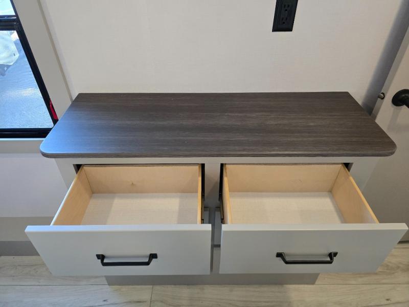 Two full bathrooms and two private bedrooms make this fifth wheel perfect for camping with friends and family. The front bedroom includes a king bed with a queen bed option, a large front wardrobe, plus stackable washer and dryer prep. The rear master bedroom has two closets plus a dresser and underbed storage, plus its own full bath with an exterior entry door for convenience. There is even a loft above the rear bedroom for even more sleeping space! Everyone can meet in the main living area/kitchen to relax on the power theater seat as the chef cooks dinner, and you can watch a show on the Smart HDTV to pass the time. The kitchen island will provide more counter space, along with the hutch that includes overhead cabinets as well. Don't let this luxury fifth wheel slip away!