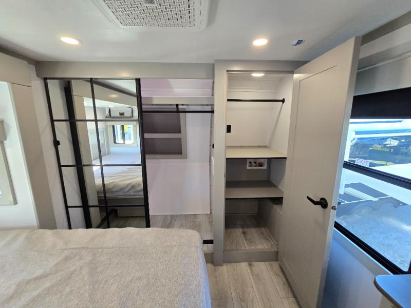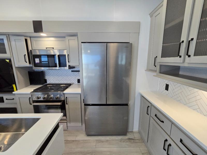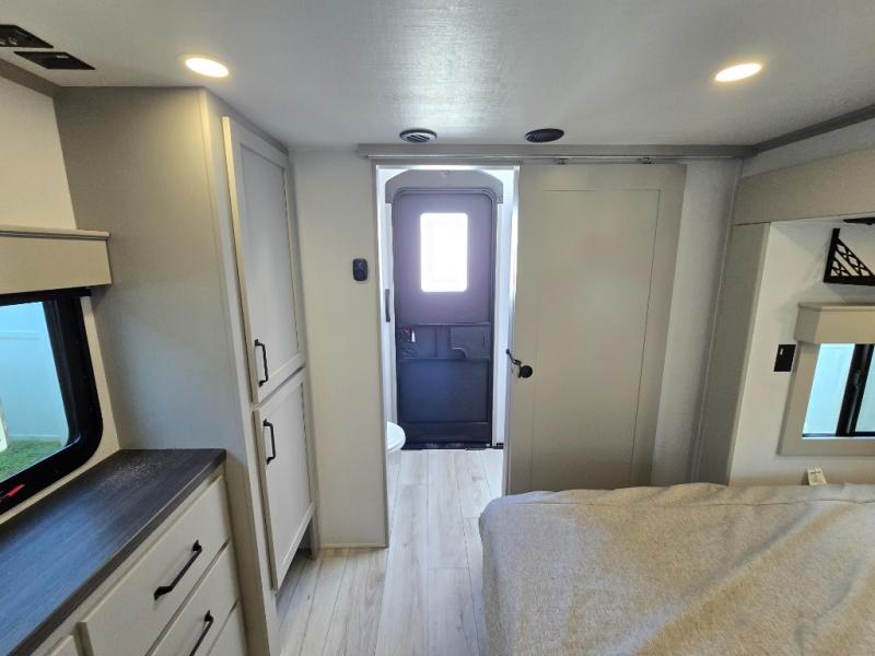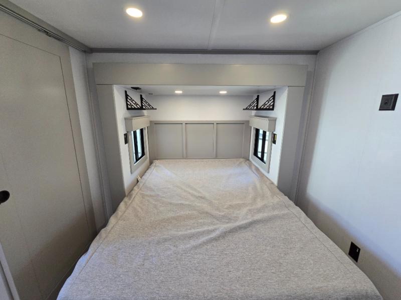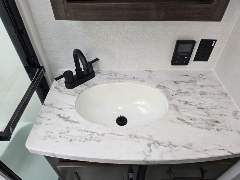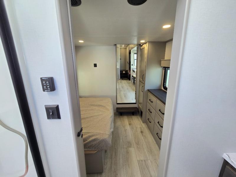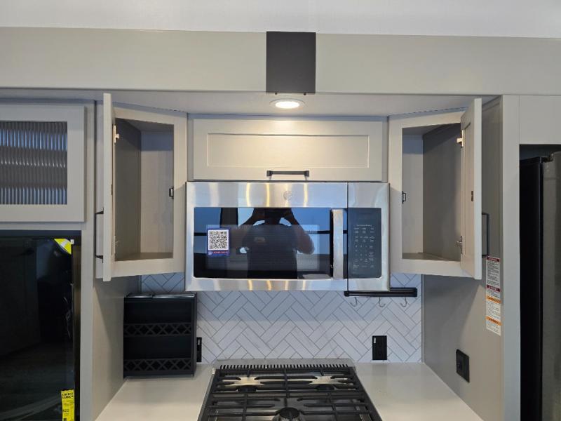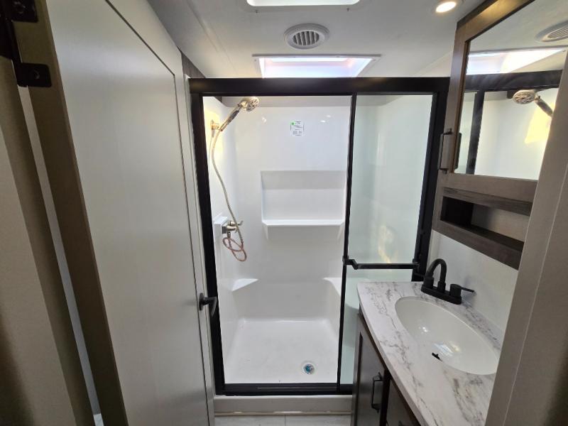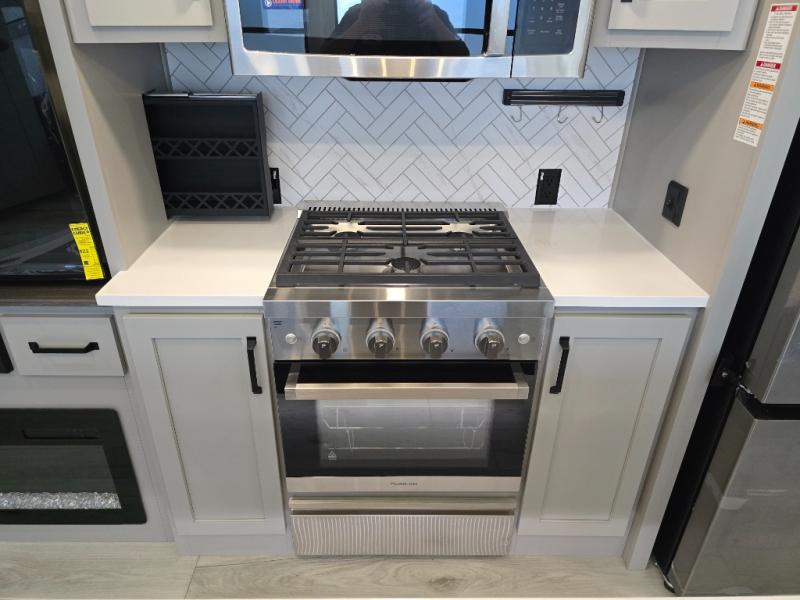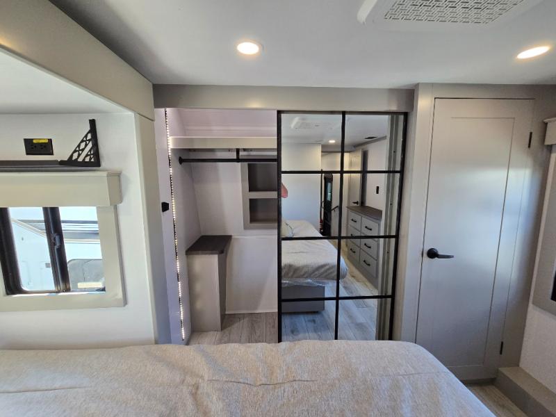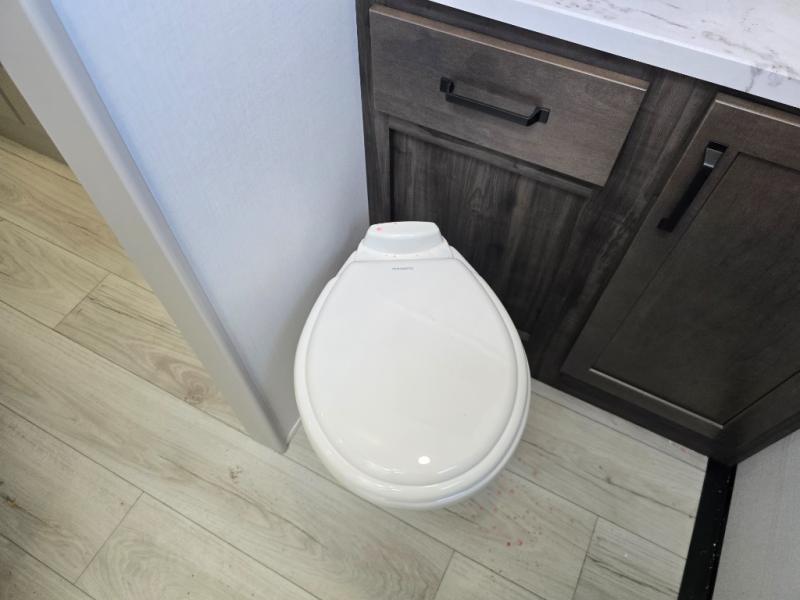 Two full bathrooms and two private bedrooms make this fifth wheel perfect for camping with friends and family. The front bedroom includes a king bed with a queen bed option, a large front wardrobe, plus stackable washer and dryer prep. The rear master bedroom has two closets plus a dresser and underbed storage, plus its own full bath with an exterior entry door for convenience. There is even a loft above the rear bedroom for even more sleeping space! Everyone can meet in the main living area/kitchen to relax on the power theater seat as the chef cooks dinner, and you can watch a show on the Smart HDTV to pass the time. The kitchen island will provide more counter space, along with the hutch that includes overhead cabinets as well. Don't let this luxury fifth wheel slip away!