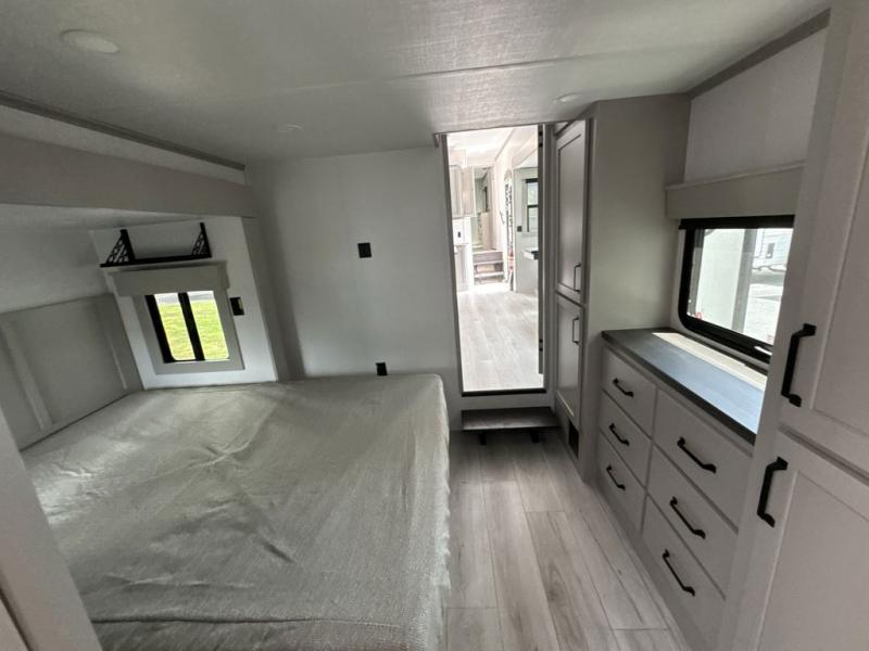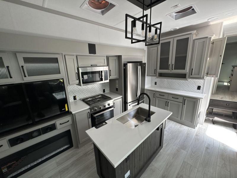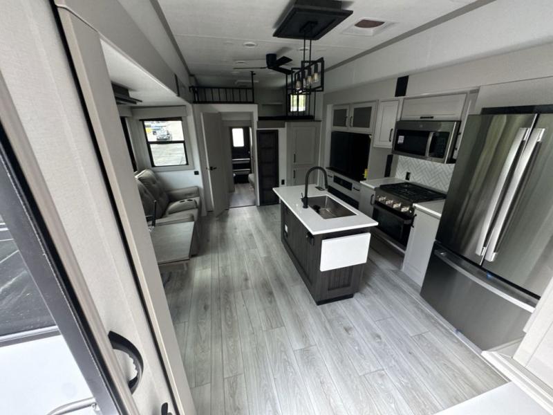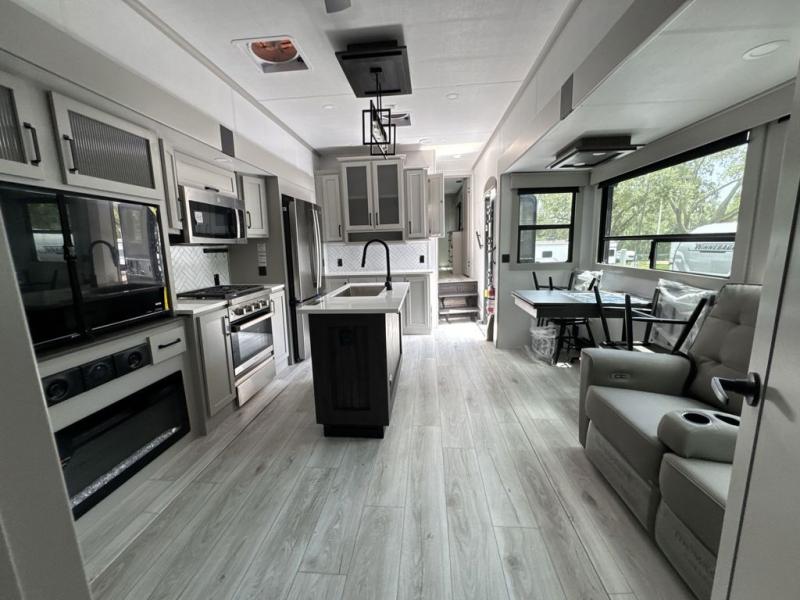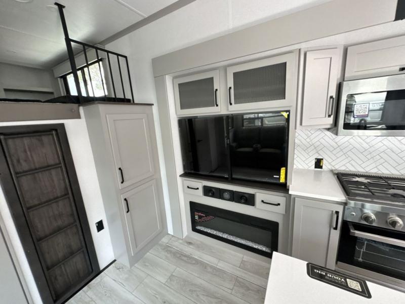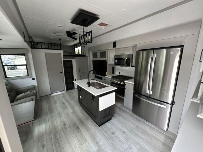Two full bathrooms and two private bedrooms make this fifth wheel perfect for camping with friends and family. The front bedroom includes a king bed with a queen bed option, a large front wardrobe, plus stackable washer and dryer prep. The rear master bedroom has two closets plus a dresser and underbed storage, plus its own full bath with an exterior entry door for convenience. There is even a loft above the rear bedroom for even more sleeping space! Everyone can meet in the main living area/kitchen to relax on the power theater seat as the chef cooks dinner, and you can watch a show on the Smart HDTV to pass the time. The kitchen island will provide more counter space, along with the hutch that includes overhead cabinets as well. Don't let this luxury fifth wheel slip away!