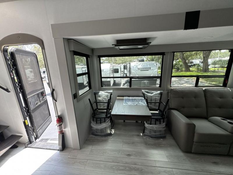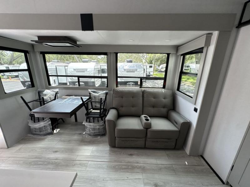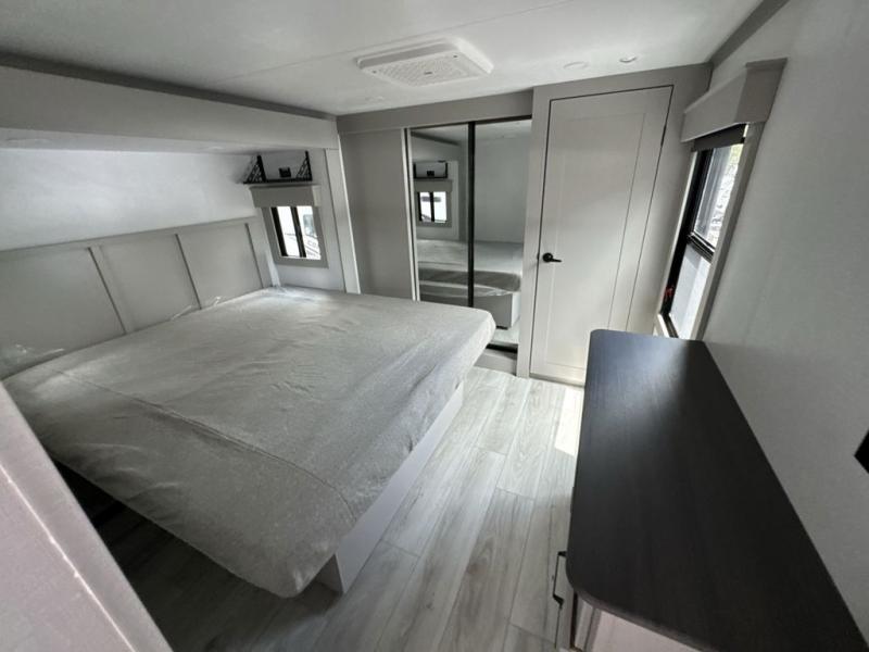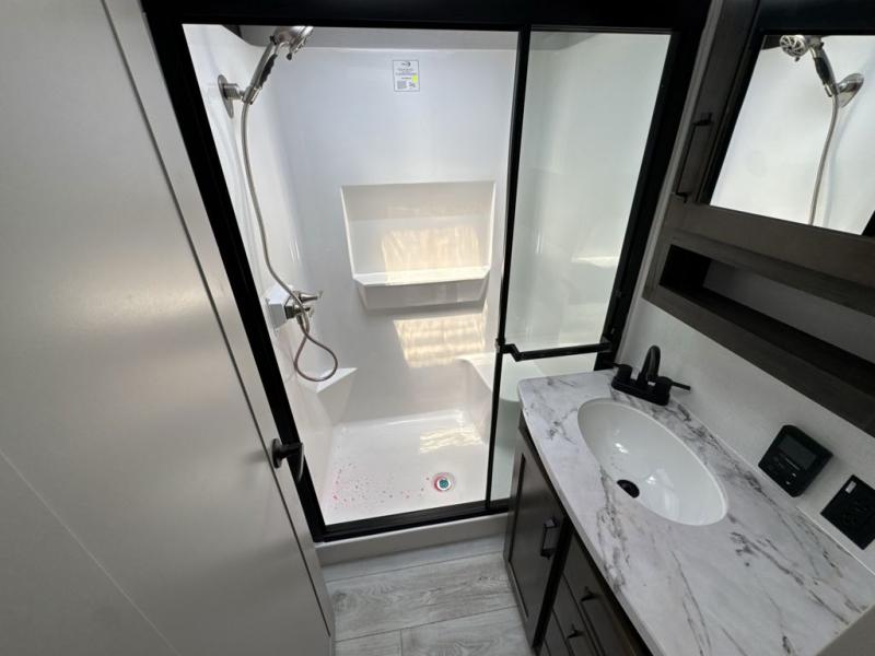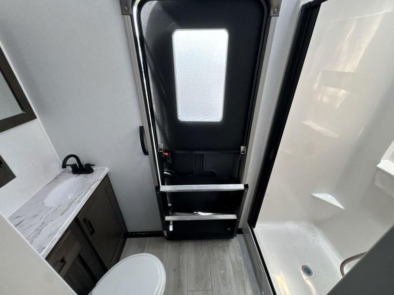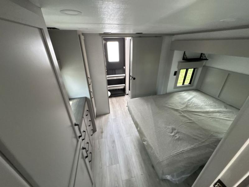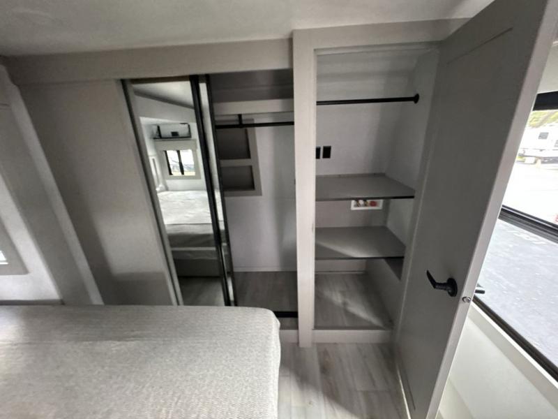Two full bathrooms and two private bedrooms make this fifth wheel perfect for camping with friends and family. The front bedroom includes a king bed with a queen bed option, a large front wardrobe, plus stackable washer and dryer prep. The rear master bedroom has two closets plus a dresser and underbed storage, plus its own full bath with an exterior entry door for convenience. There is even a loft above the rear bedroom for even more sleeping space! Everyone can meet in the main living area/kitchen to relax on the power theater seat as the chef cooks dinner, and you can watch a show on the Smart HDTV to pass the time. The kitchen island will provide more counter space, along with the hutch that includes overhead cabinets as well. Don't let this luxury fifth wheel slip away!