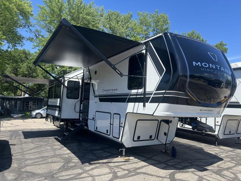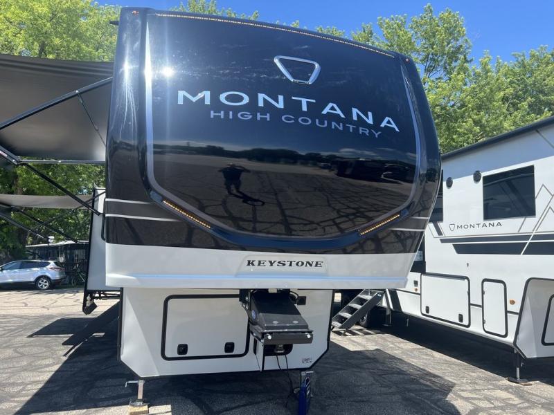 Live the high life with a Keystone Montana High Country fifth wheel! You'll have all the luxury you need with these units. They come with a MaxTurn™ front cap with KeyShield™ automotive-grade paint, a fully walkable roof with Alpha seamless TPO membrane system, and an insulated underbelly with forced hot air and electric tank heaters. The MORryde CRE3000 suspension with wet bolts helps provide a smooth tow, and the Ground Control® four-point electric auto-leveling with hitch memory will make set-up quite easy. The interior is elegantly appointed with the Thomas Payne Collection furniture, hardwood decorative slide-out fascia, Beauflor® vinyl throughout, accent crown molding, and premium solid surface kitchen countertops.