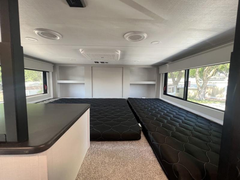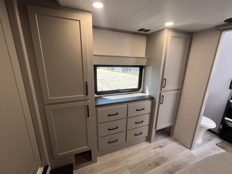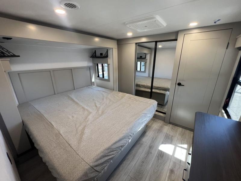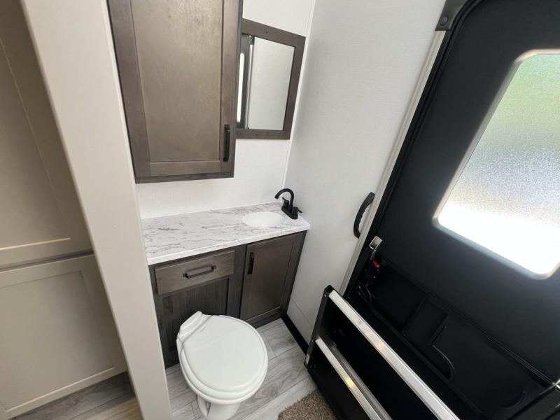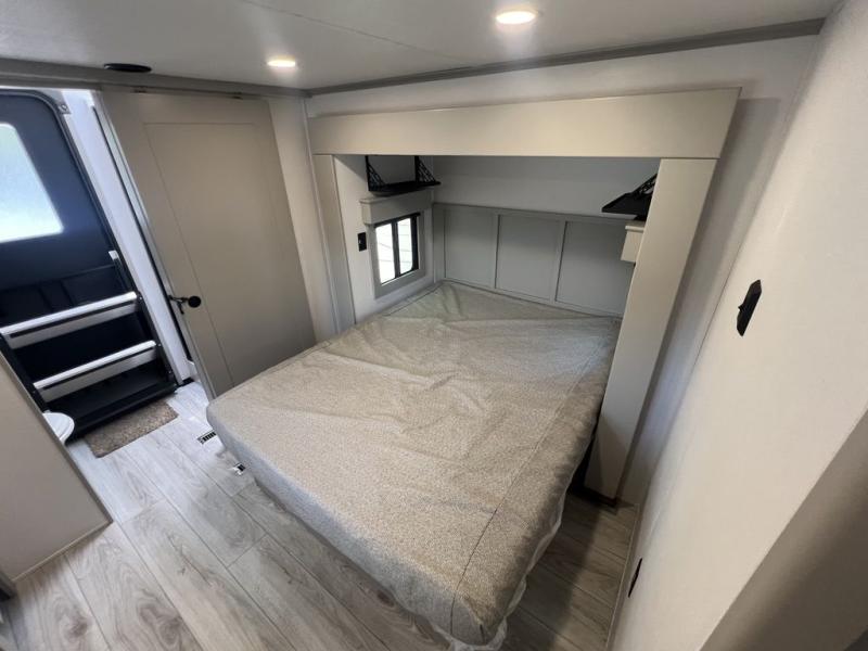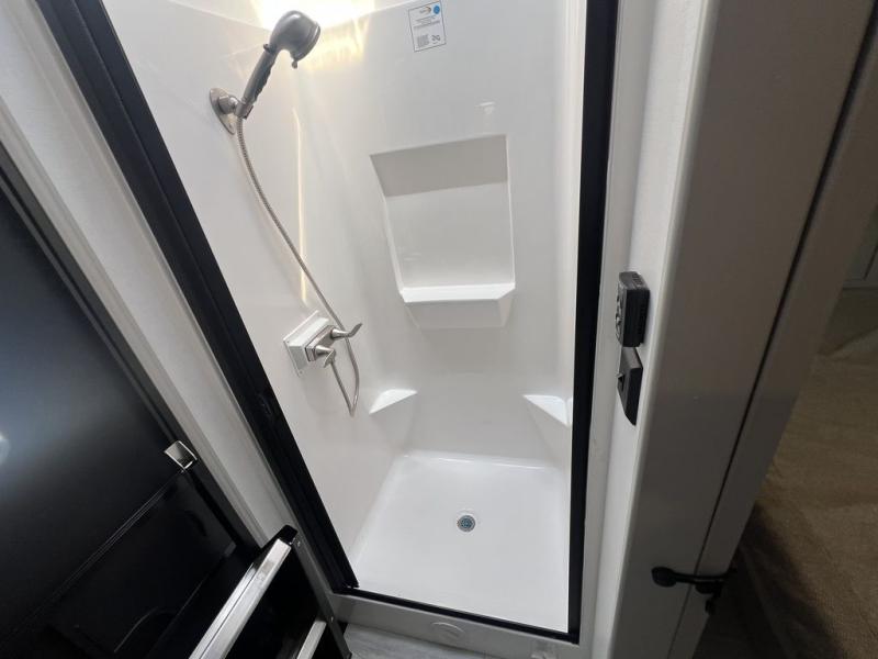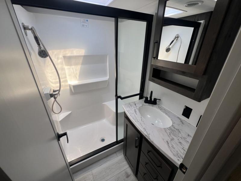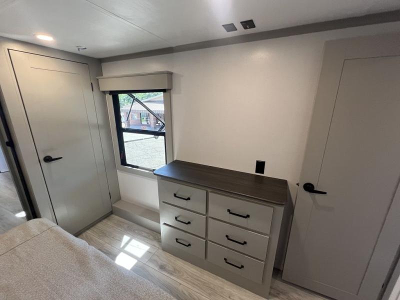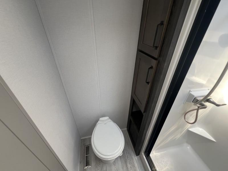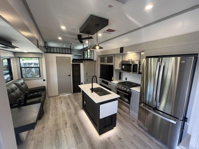 Two full bathrooms and two private bedrooms make this fifth wheel perfect for camping with friends and family. The front bedroom includes a king bed with a queen bed option, a large front wardrobe, plus stackable washer and dryer prep. The rear master bedroom has two closets plus a dresser and underbed storage, plus its own full bath with an exterior entry door for convenience. There is even a loft above the rear bedroom for even more sleeping space! Everyone can meet in the main living area/kitchen to relax on the power theater seat as the chef cooks dinner, and you can watch a show on the Smart HDTV to pass the time. The kitchen island will provide more counter space, along with the hutch that includes overhead cabinets as well. Don't let this luxury fifth wheel slip away!