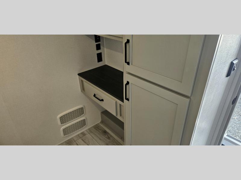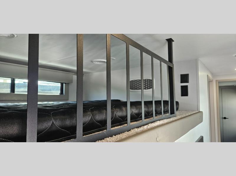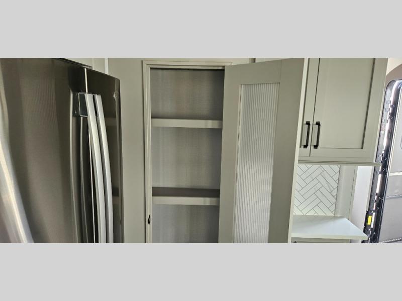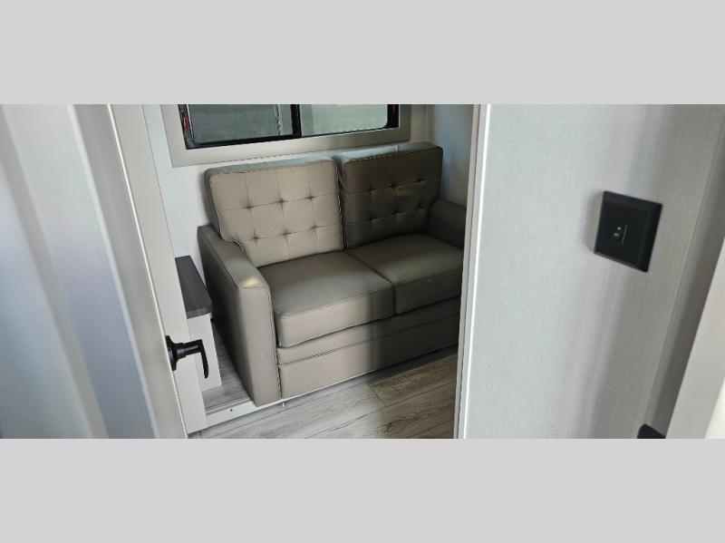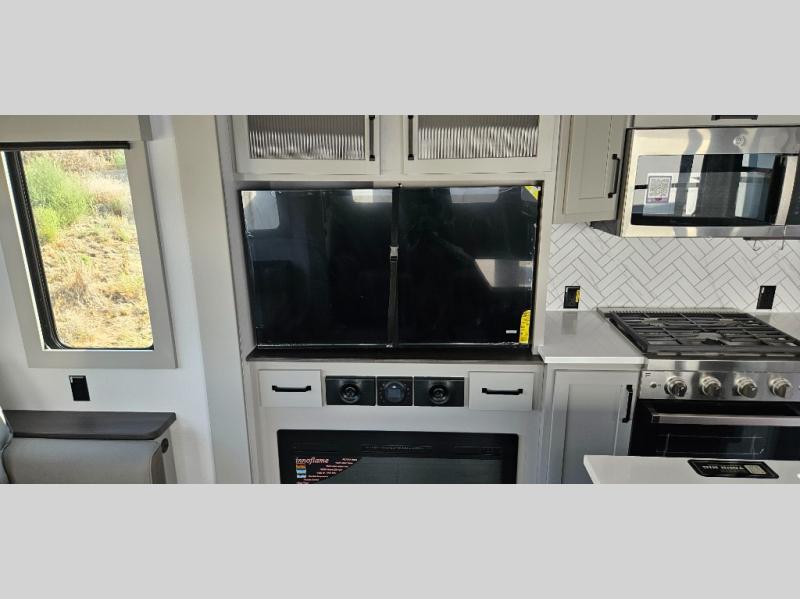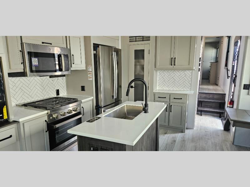 Just one look at this Montana High Country fifth wheel will impress you! There is an extra middle room that can be used for many different purposes, like an office, a guest bedroom, a craft room, or a hangout room. The hide-a-bed sofa sits on a slide for more space in this room, and there is a desk that can be used to get some work done. Above this room is a loft, so you have even more sleeping space. You also have a hide-a-bed sofa in the living area, and the king-size bed in the front private bedroom has storage underneath. The power theater seating sits across from the fireplace and 50" LED TV for nighttime entertainment, and the kitchen island has a countertop extension for more prep space.