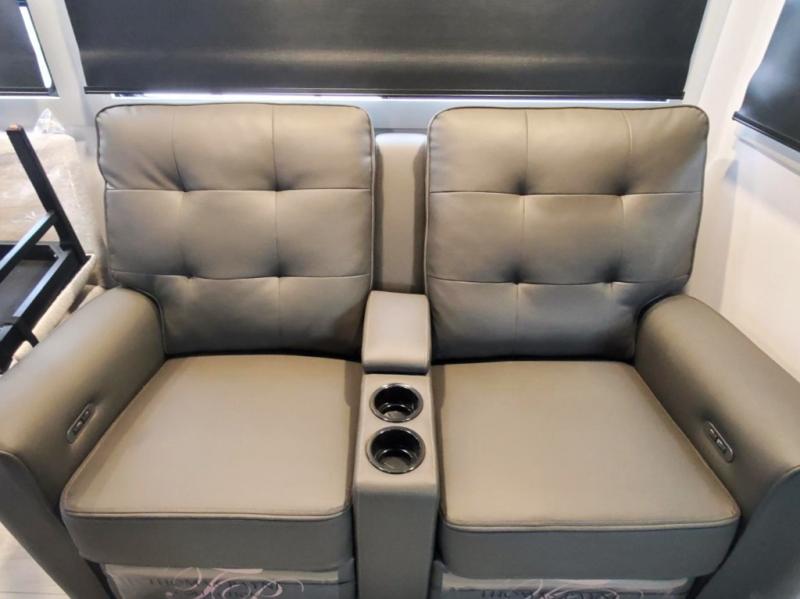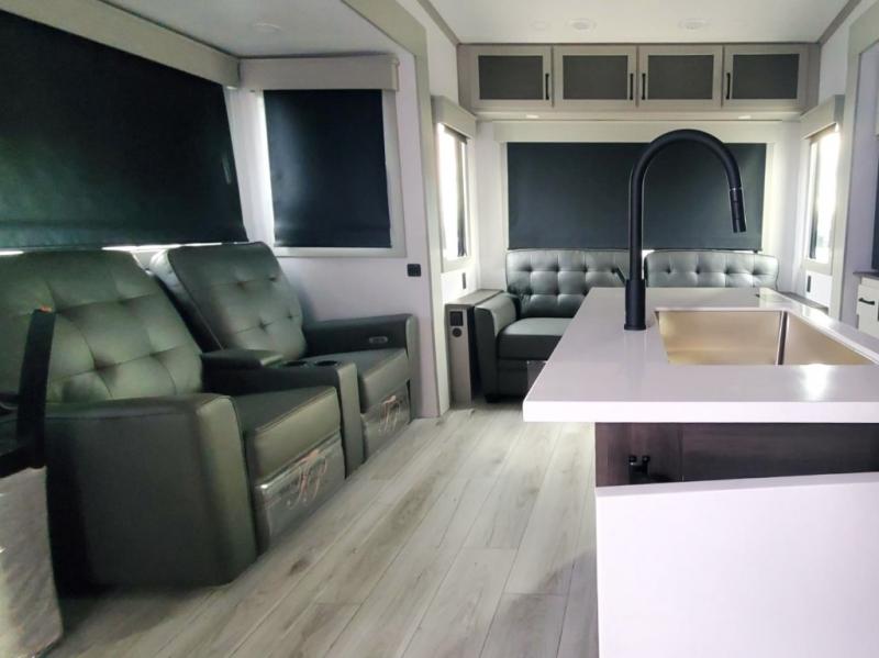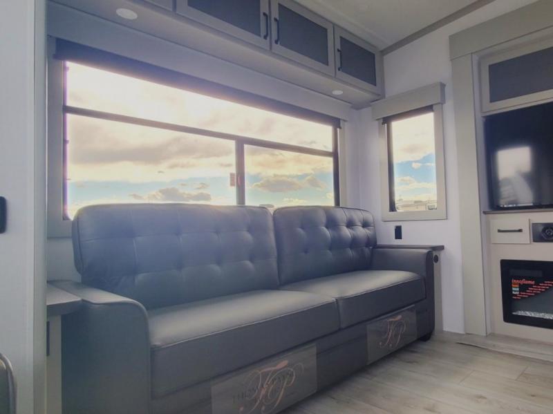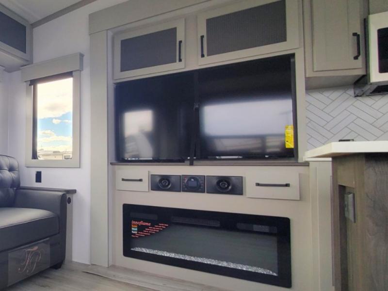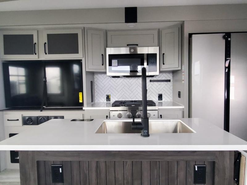 Just one look at this Montana High Country fifth wheel will impress you! There is an extra middle room that can be used for many different purposes, like an office, a guest bedroom, a craft room, or a hangout room. The hide-a-bed sofa sits on a slide for more space in this room, and there is a desk that can be used to get some work done. Above this room is a loft, so you have even more sleeping space. You also have a hide-a-bed sofa in the living area, and the king-size bed in the front private bedroom has storage underneath. The power theater seating sits across from the fireplace and 50" LED TV for nighttime entertainment, and the kitchen island has a countertop extension for more prep space.