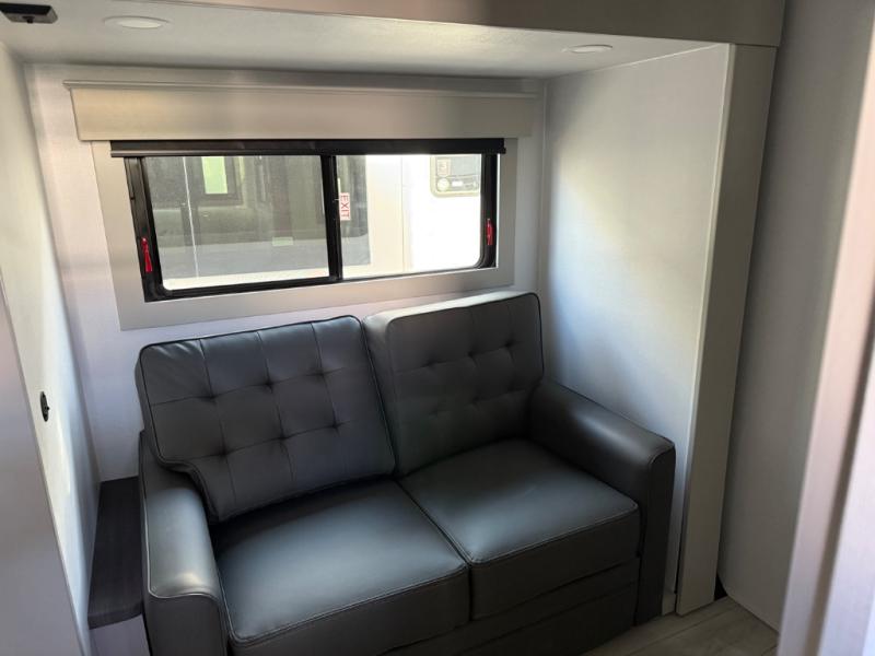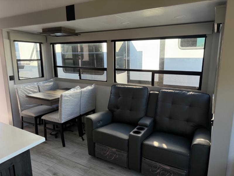 Just one look at this Montana High Country fifth wheel will impress you! There is an extra middle room that can be used for many different purposes, like an office, a guest bedroom, a craft room, or a hangout room. The hide-a-bed sofa sits on a slide for more space in this room, and there is a desk that can be used to get some work done. Above this room is a loft, so you have even more sleeping space. You also have a hide-a-bed sofa in the living area, and the king-size bed in the front private bedroom has storage underneath. The power theater seating sits across from the fireplace and 50" LED TV for nighttime entertainment, and the kitchen island has a countertop extension for more prep space.