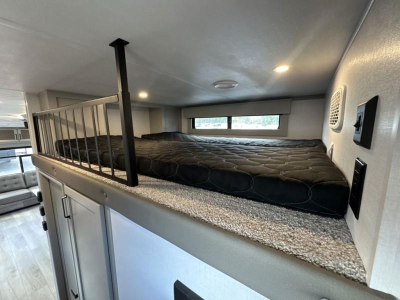 Just one look at this Montana High Country fifth wheel will impress you! There is an extra middle room that can be used for many different purposes, like an office, a guest bedroom, a craft room, or a hangout room. The hide-a-bed sofa sits on a slide for more space in this room, and there is a desk that can be used to get some work done. Above this room is a loft, so you have even more sleeping space. You also have a hide-a-bed sofa in the living area, and the king-size bed in the front private bedroom has storage underneath. The power theater seating sits across from the fireplace and 50" LED TV for nighttime entertainment, and the kitchen island has a countertop extension for more prep space.