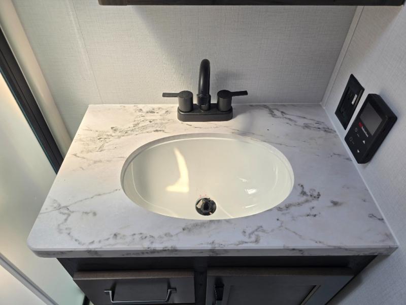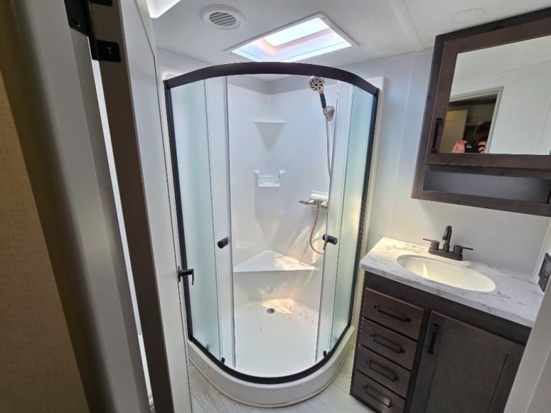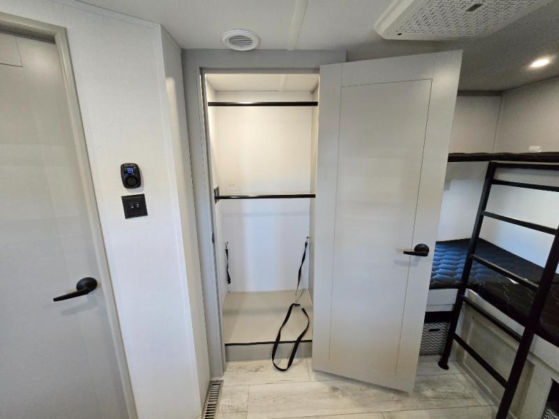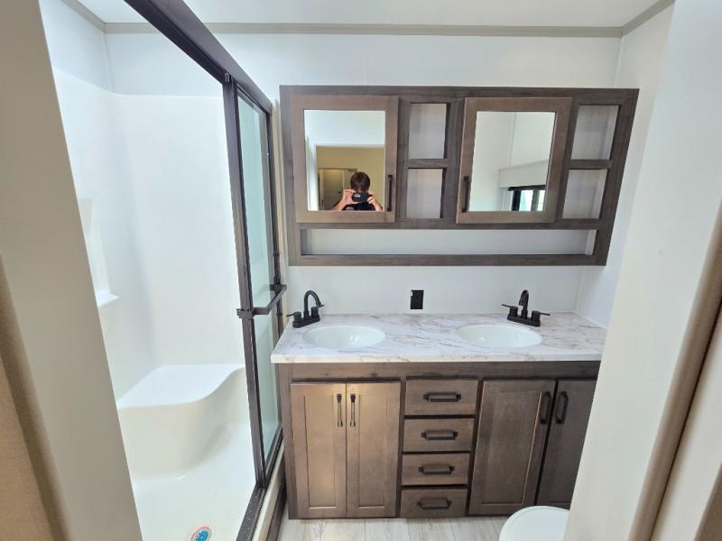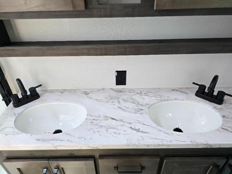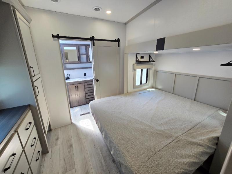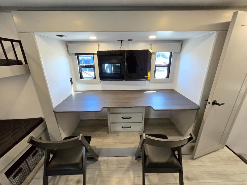 You'll love every minute spent in this spacious fifth wheel! It's perfect to camp with a larger group since there are bunk beds in the front bunkhouse suite plus a second suite in the back. The bunkhouse also includes two desks with chairs and storage drawers, a full bath, plus washer and dryer prep if you plan to go full-time. The rear suite features a king bed slide, two closets, a bedroom countertop plus a full rear bath with dual bath sinks; how convenient! Everyone will love to meet in the combined kitchen and living area in the morning. Here, you'll find two large opposing slides for tons of space, a large sofa and kitchen island, plus three pantries for all the snacks, canned goods, and paper products!