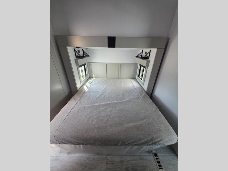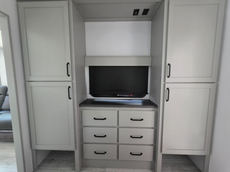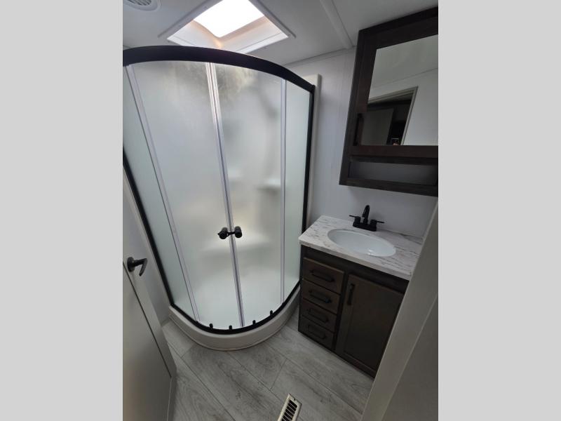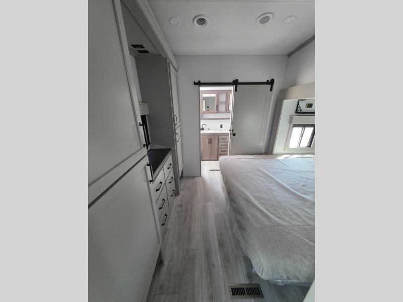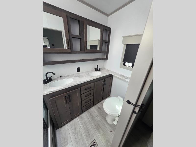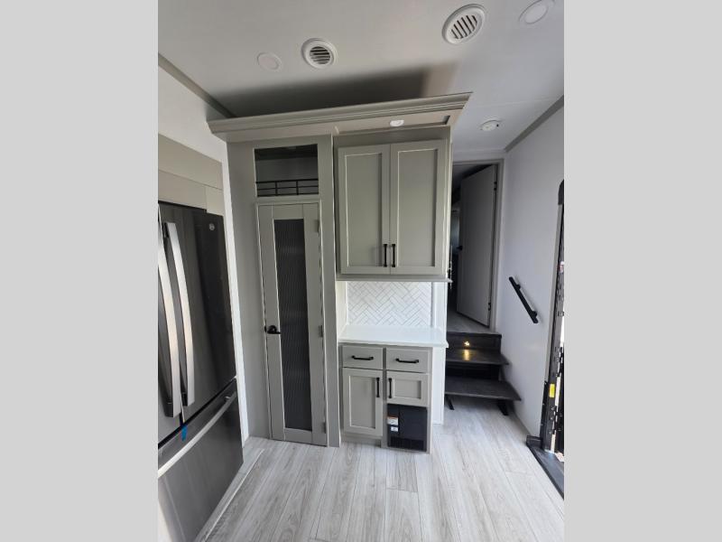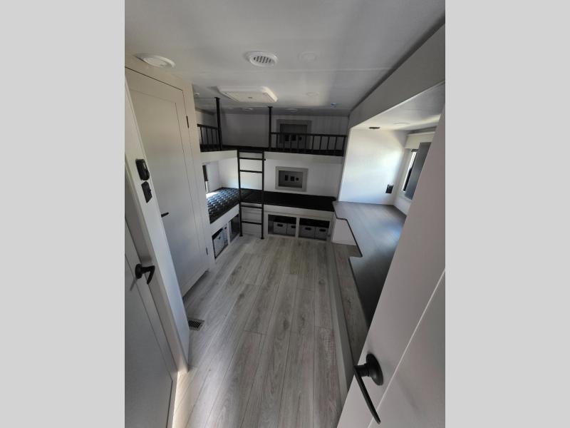You'll love every minute spent in this spacious fifth wheel! It's perfect to camp with a larger group since there are bunk beds in the front bunkhouse suite plus a second suite in the back. The bunkhouse also includes two desks with chairs and storage drawers, a full bath, plus washer and dryer prep if you plan to go full-time. The rear suite features a king bed slide, two closets, a bedroom countertop plus a full rear bath with dual bath sinks; how convenient! Everyone will love to meet in the combined kitchen and living area in the morning. Here, you'll find two large opposing slides for tons of space, a large sofa and kitchen island, plus three pantries for all the snacks, canned goods, and paper products!