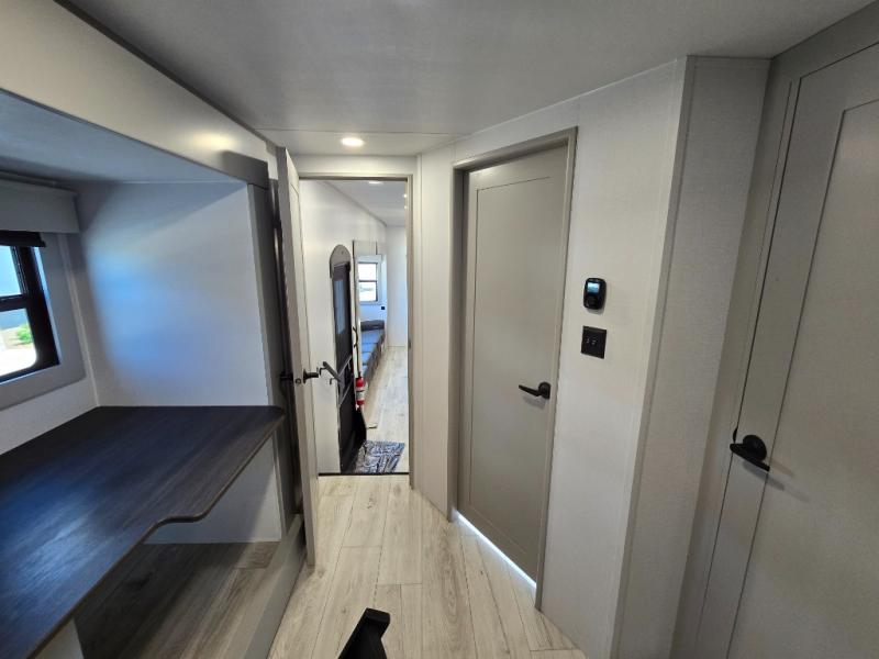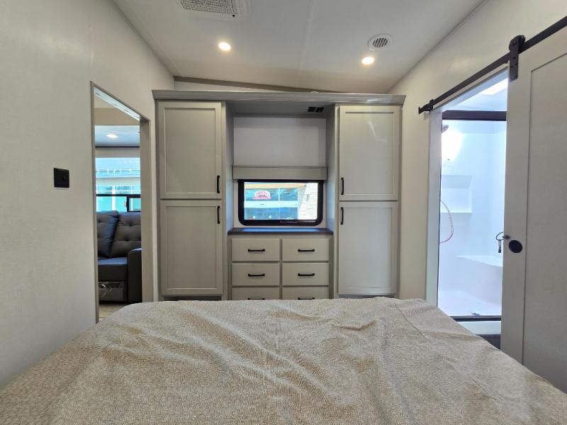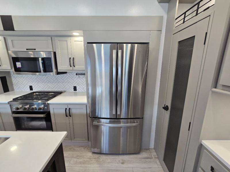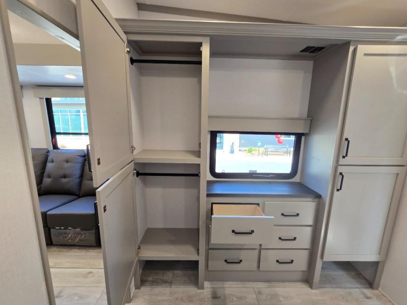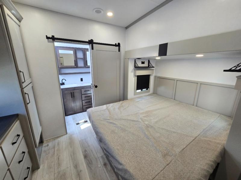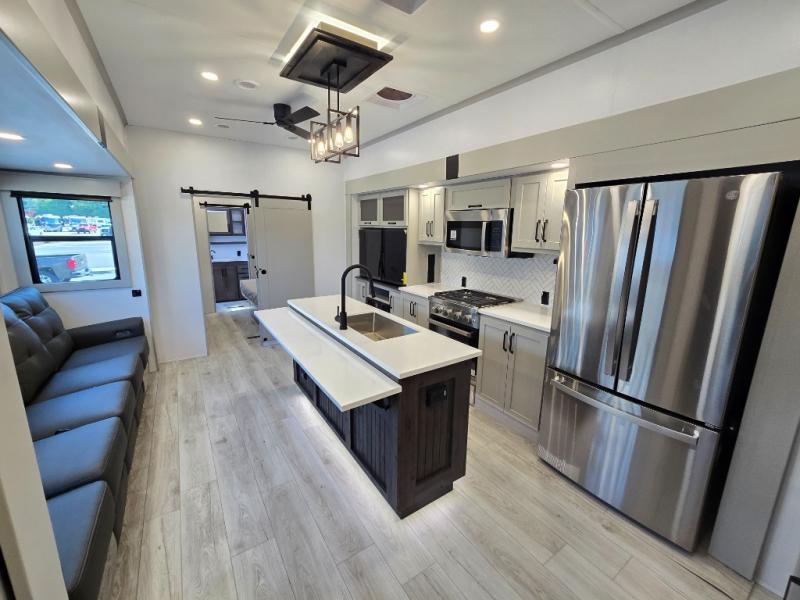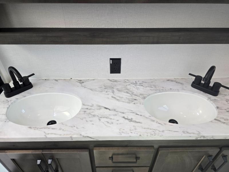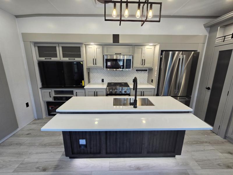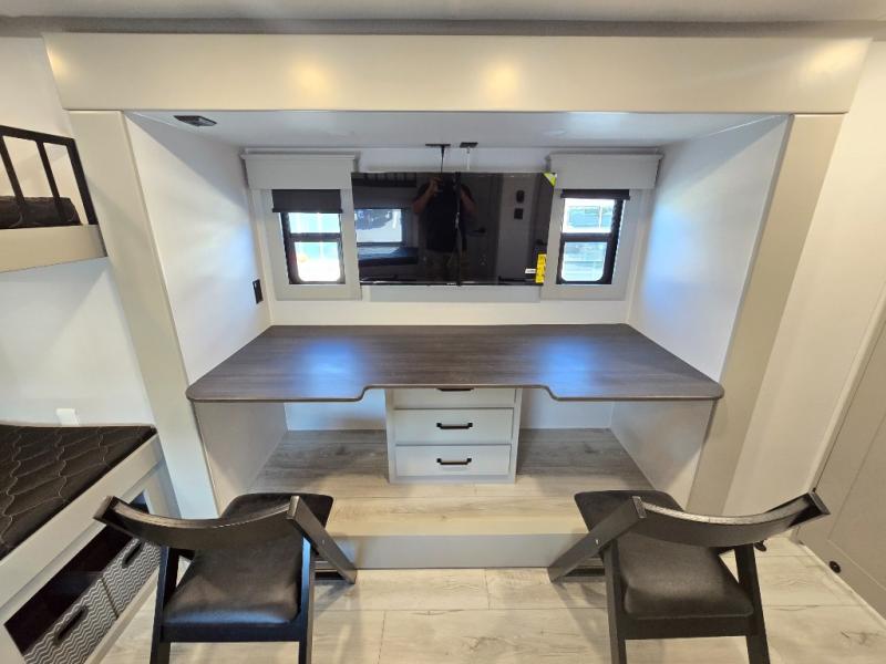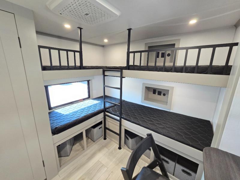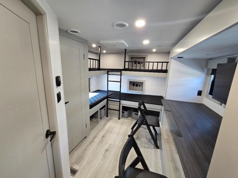 You'll love every minute spent in this spacious fifth wheel! It's perfect to camp with a larger group since there are bunk beds in the front bunkhouse suite plus a second suite in the back. The bunkhouse also includes two desks with chairs and storage drawers, a full bath, plus washer and dryer prep if you plan to go full-time. The rear suite features a king bed slide, two closets, a bedroom countertop plus a full rear bath with dual bath sinks; how convenient! Everyone will love to meet in the combined kitchen and living area in the morning. Here, you'll find two large opposing slides for tons of space, a large sofa and kitchen island, plus three pantries for all the snacks, canned goods, and paper products!