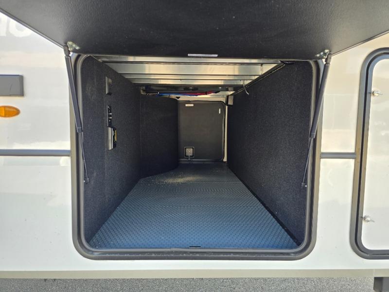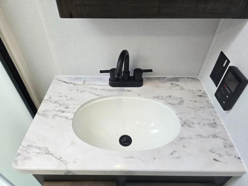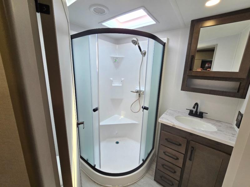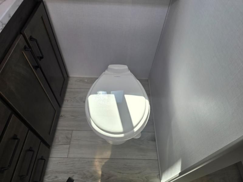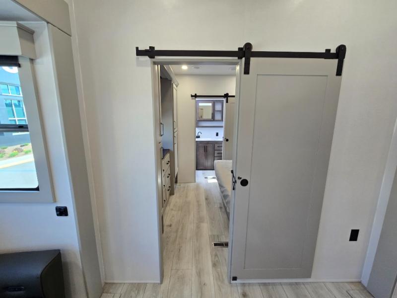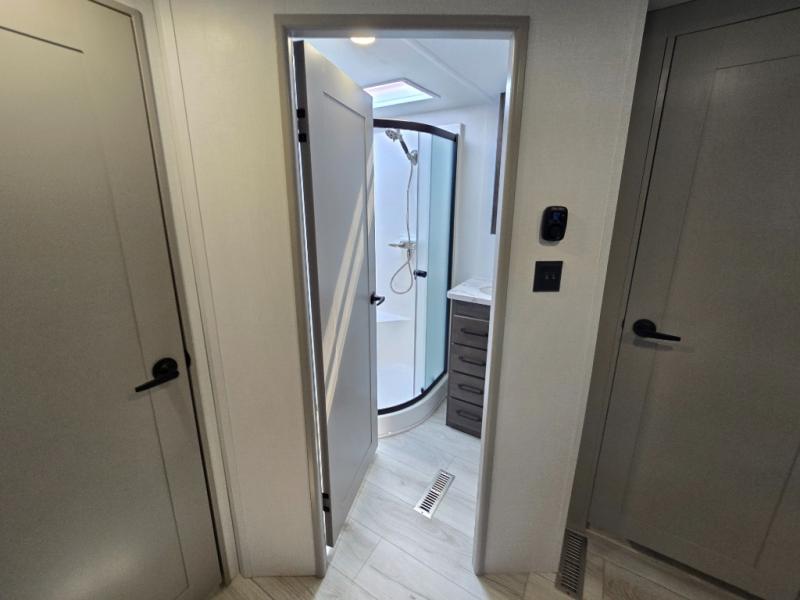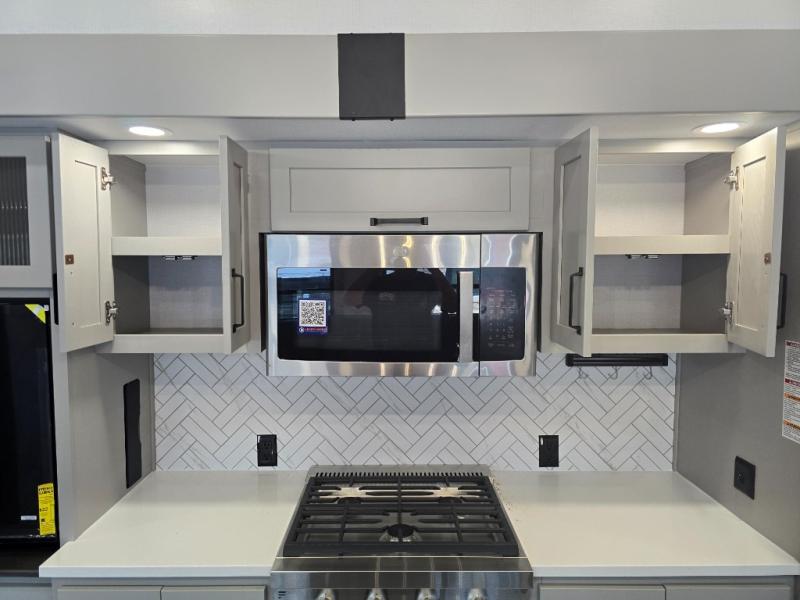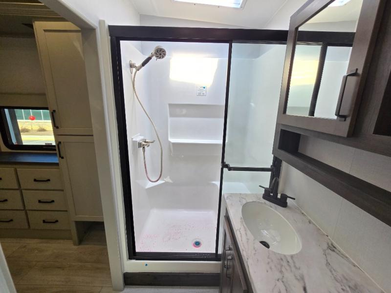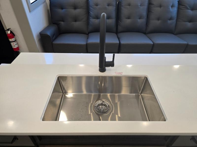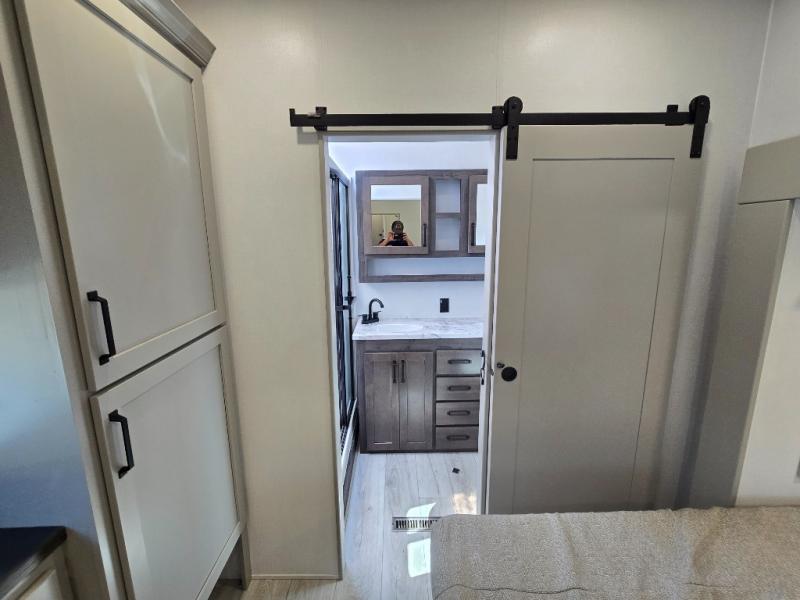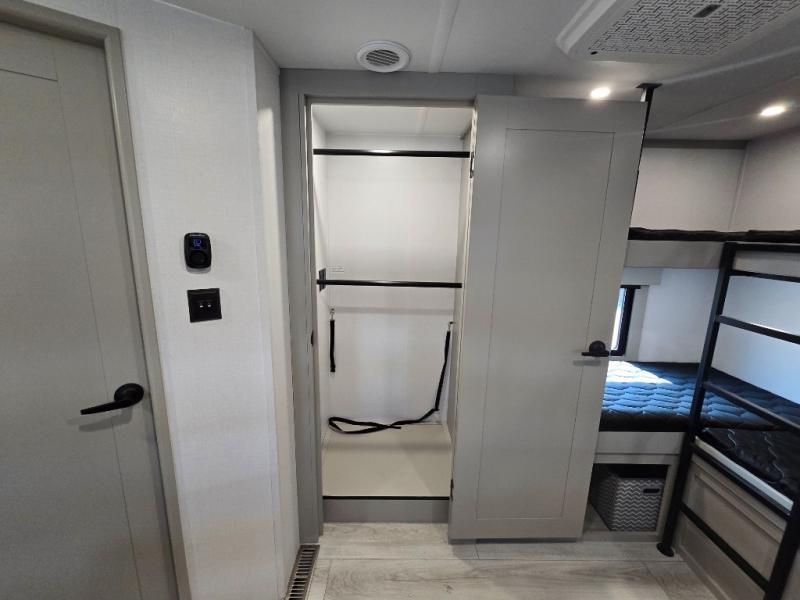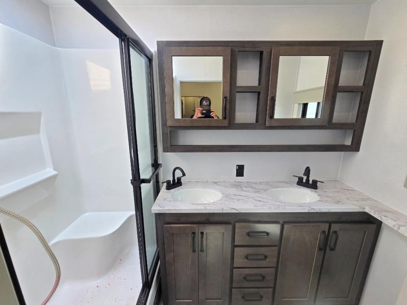 You'll love every minute spent in this spacious fifth wheel! It's perfect to camp with a larger group since there are bunk beds in the front bunkhouse suite plus a second suite in the back. The bunkhouse also includes two desks with chairs and storage drawers, a full bath, plus washer and dryer prep if you plan to go full-time. The rear suite features a king bed slide, two closets, a bedroom countertop plus a full rear bath with dual bath sinks; how convenient! Everyone will love to meet in the combined kitchen and living area in the morning. Here, you'll find two large opposing slides for tons of space, a large sofa and kitchen island, plus three pantries for all the snacks, canned goods, and paper products!