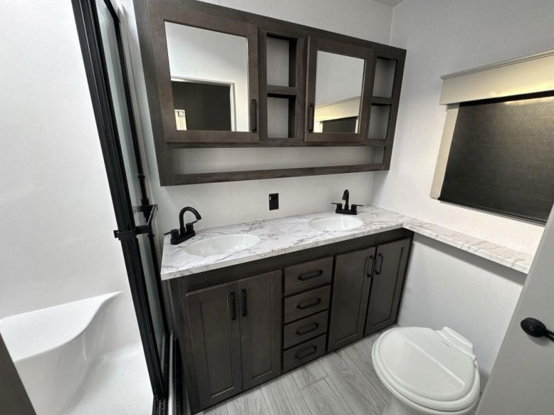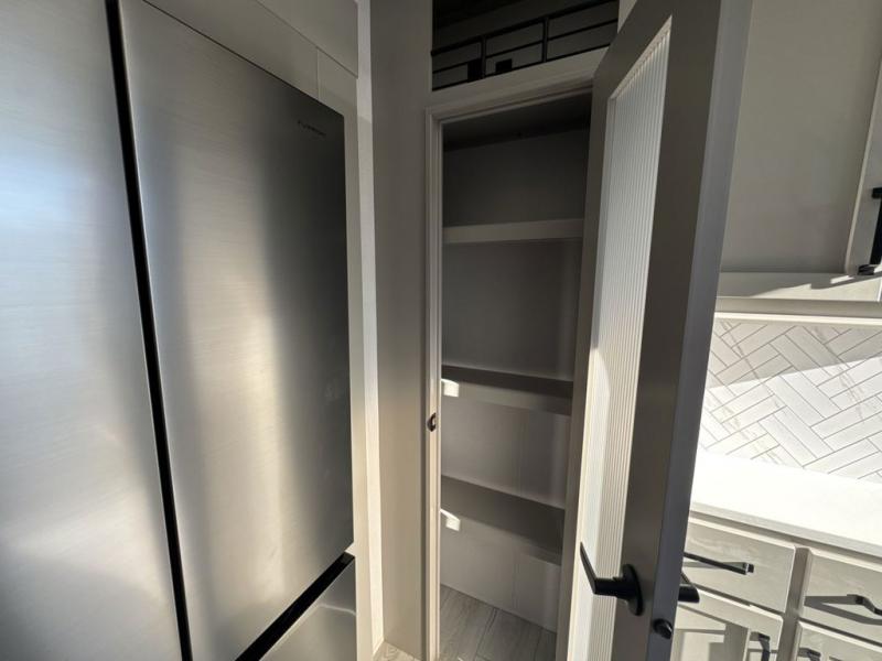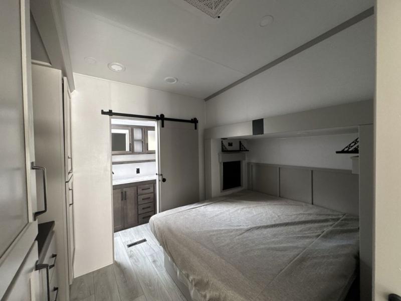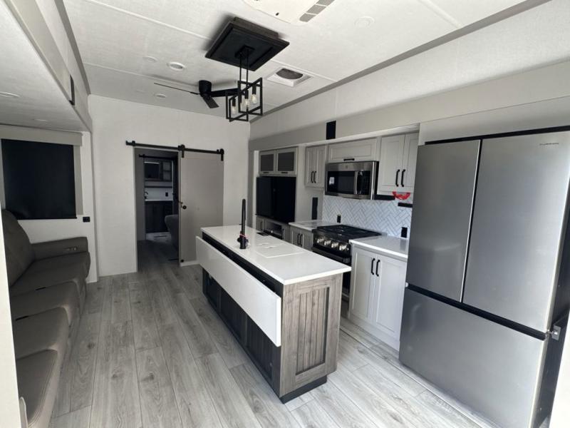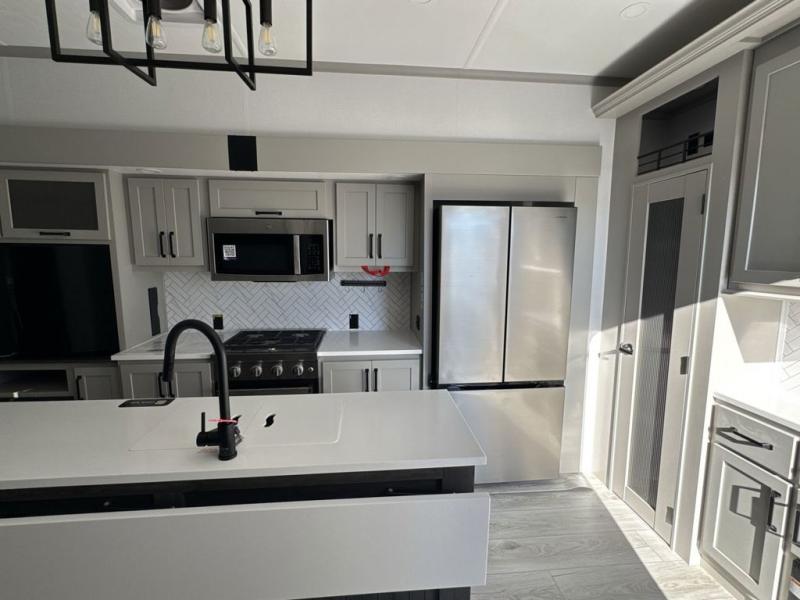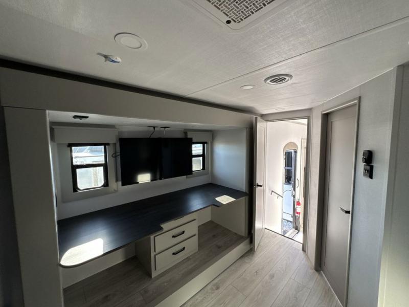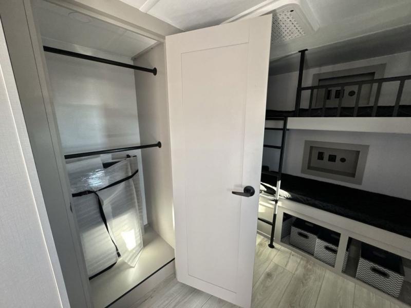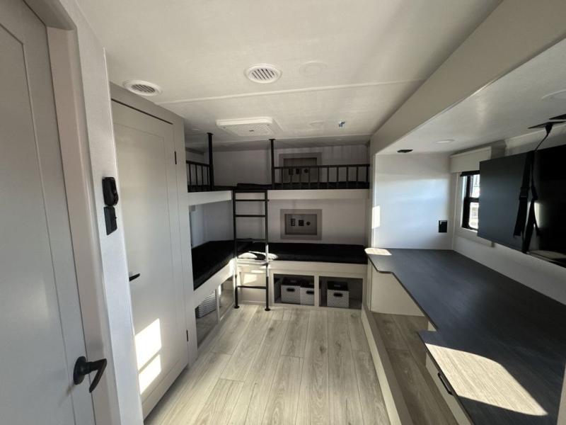 You'll love every minute spent in this spacious fifth wheel! It's perfect to camp with a larger group since there are bunk beds in the front bunkhouse suite plus a second suite in the back. The bunkhouse also includes two desks with chairs and storage drawers, a full bath, plus washer and dryer prep if you plan to go full-time. The rear suite features a king bed slide, two closets, a bedroom countertop plus a full rear bath with dual bath sinks; how convenient! Everyone will love to meet in the combined kitchen and living area in the morning. Here, you'll find two large opposing slides for tons of space, a large sofa and kitchen island, plus three pantries for all the snacks, canned goods, and paper products!