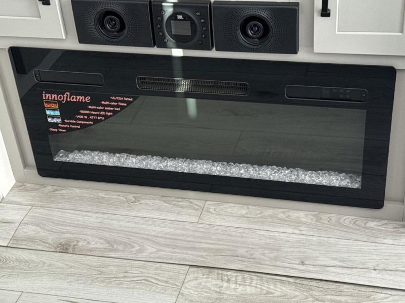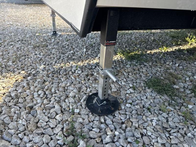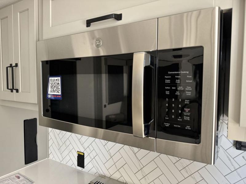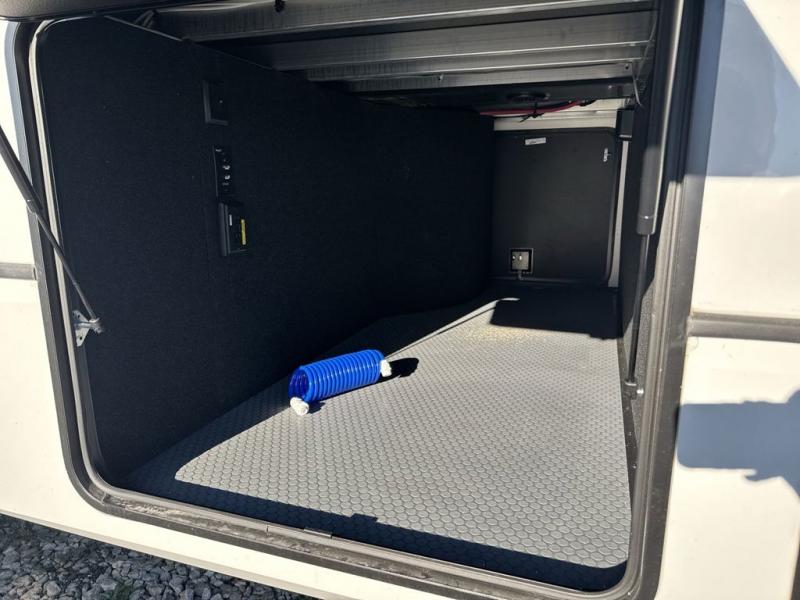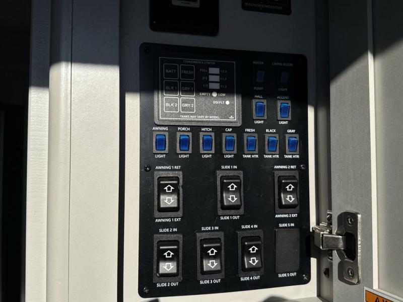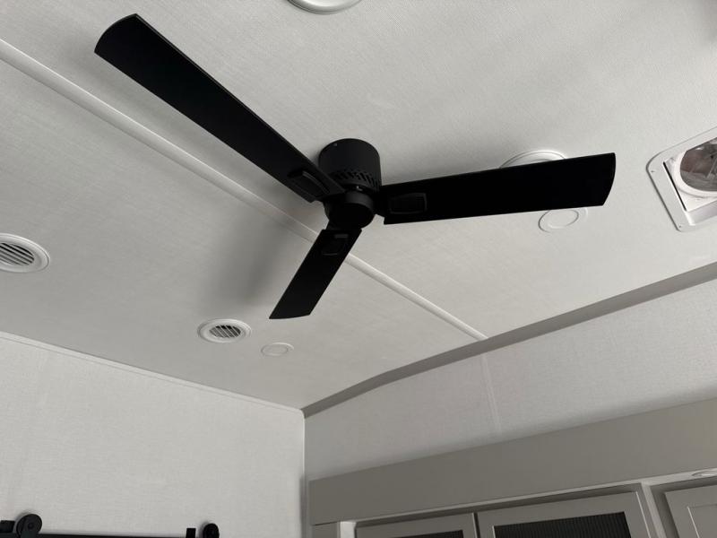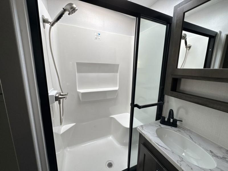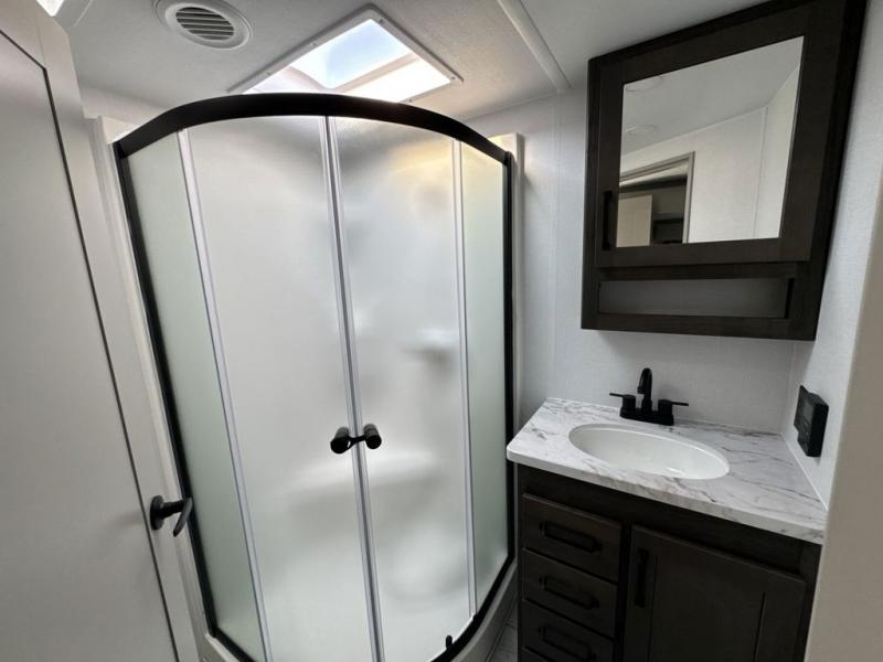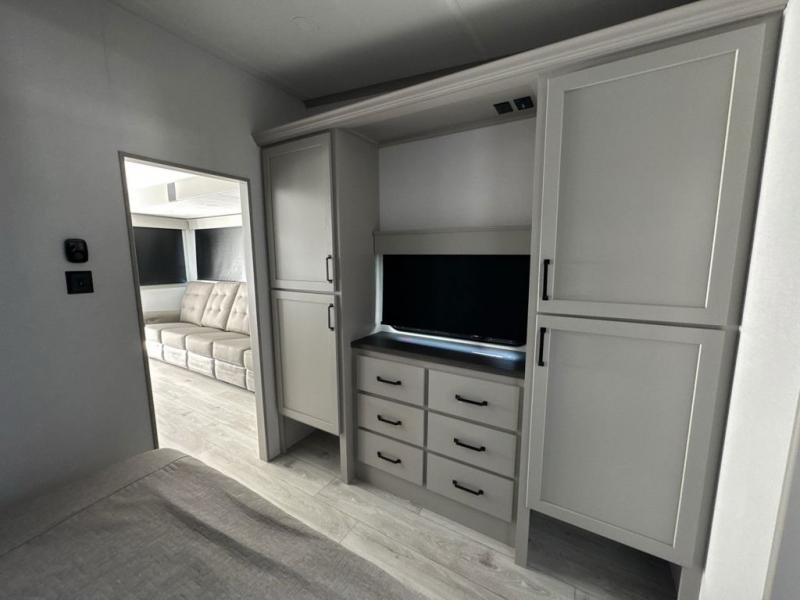 You'll love every minute spent in this spacious fifth wheel! It's perfect to camp with a larger group since there are bunk beds in the front bunkhouse suite plus a second suite in the back. The bunkhouse also includes two desks with chairs and storage drawers, a full bath, plus washer and dryer prep if you plan to go full-time. The rear suite features a king bed slide, two closets, a bedroom countertop plus a full rear bath with dual bath sinks; how convenient! Everyone will love to meet in the combined kitchen and living area in the morning. Here, you'll find two large opposing slides for tons of space, a large sofa and kitchen island, plus three pantries for all the snacks, canned goods, and paper products!