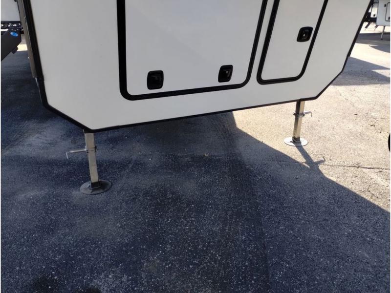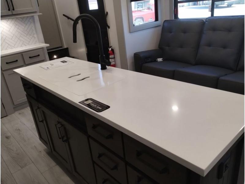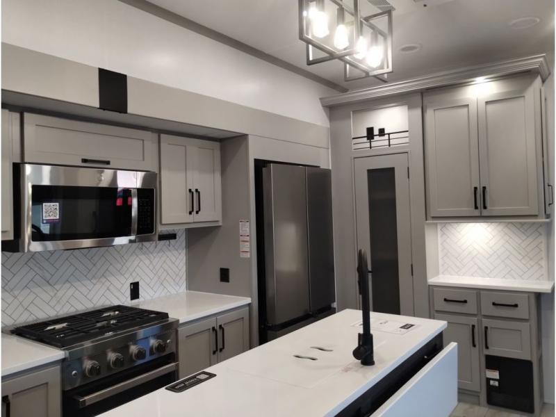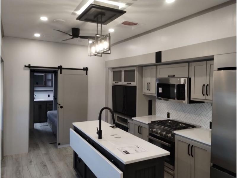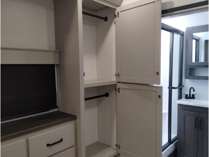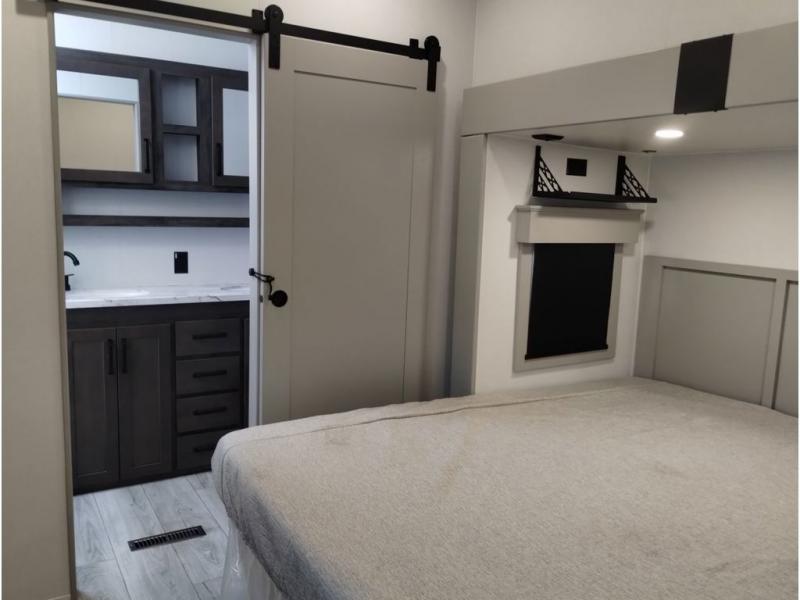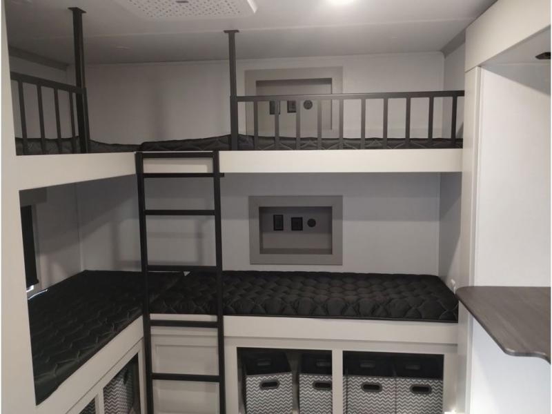 You'll love every minute spent in this spacious fifth wheel! It's perfect to camp with a larger group since there are bunk beds in the front bunkhouse suite plus a second suite in the back. The bunkhouse also includes two desks with chairs and storage drawers, a full bath, plus washer and dryer prep if you plan to go full-time. The rear suite features a king bed slide, two closets, a bedroom countertop plus a full rear bath with dual bath sinks; how convenient! Everyone will love to meet in the combined kitchen and living area in the morning. Here, you'll find two large opposing slides for tons of space, a large sofa and kitchen island, plus three pantries for all the snacks, canned goods, and paper products!