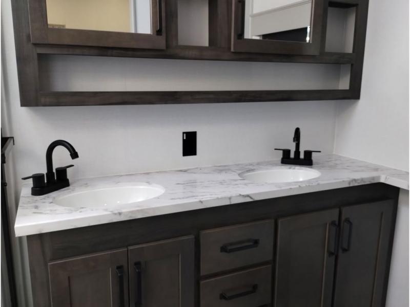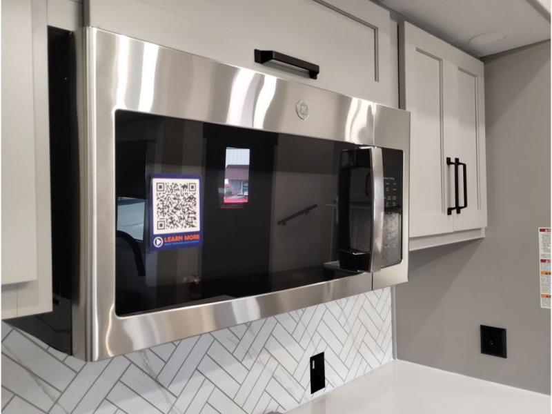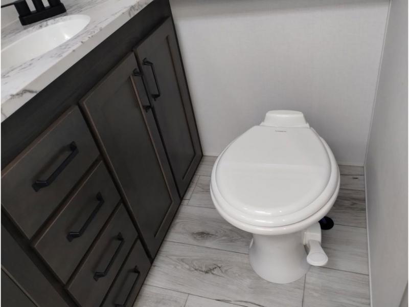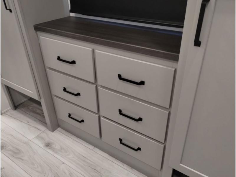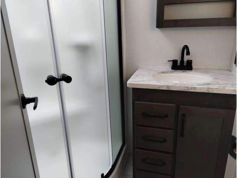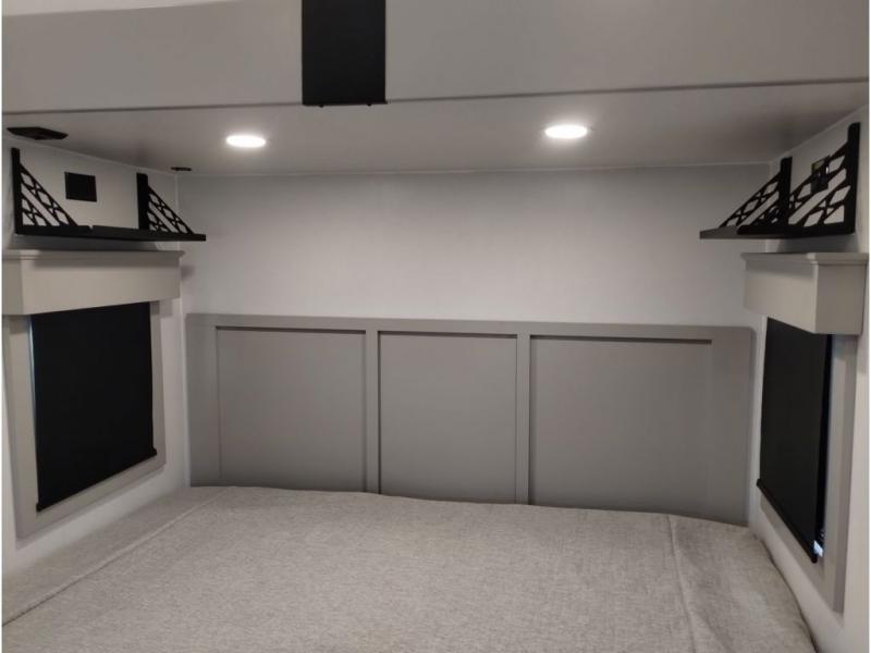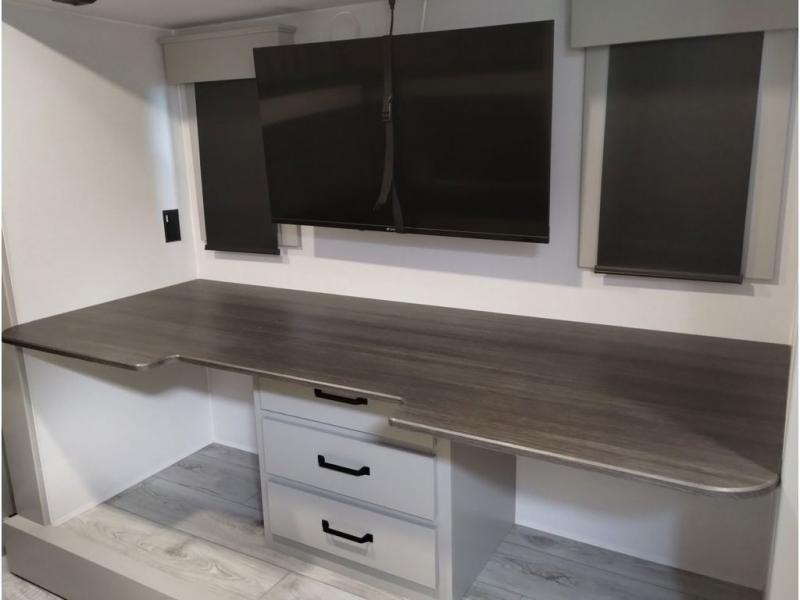 You'll love every minute spent in this spacious fifth wheel! It's perfect to camp with a larger group since there are bunk beds in the front bunkhouse suite plus a second suite in the back. The bunkhouse also includes two desks with chairs and storage drawers, a full bath, plus washer and dryer prep if you plan to go full-time. The rear suite features a king bed slide, two closets, a bedroom countertop plus a full rear bath with dual bath sinks; how convenient! Everyone will love to meet in the combined kitchen and living area in the morning. Here, you'll find two large opposing slides for tons of space, a large sofa and kitchen island, plus three pantries for all the snacks, canned goods, and paper products!