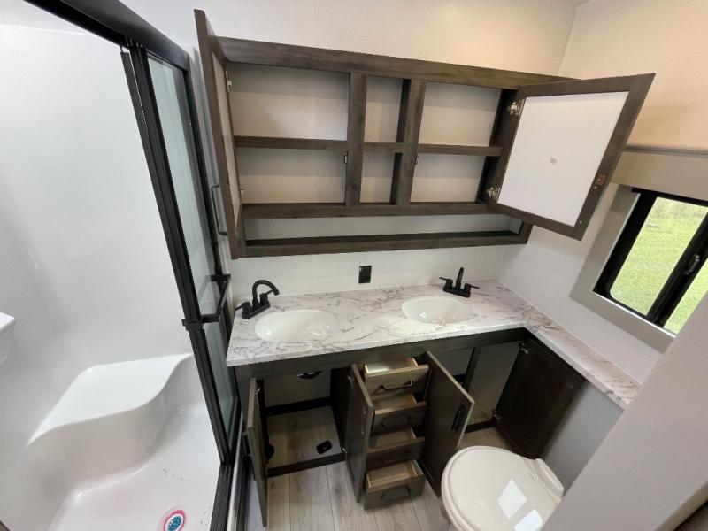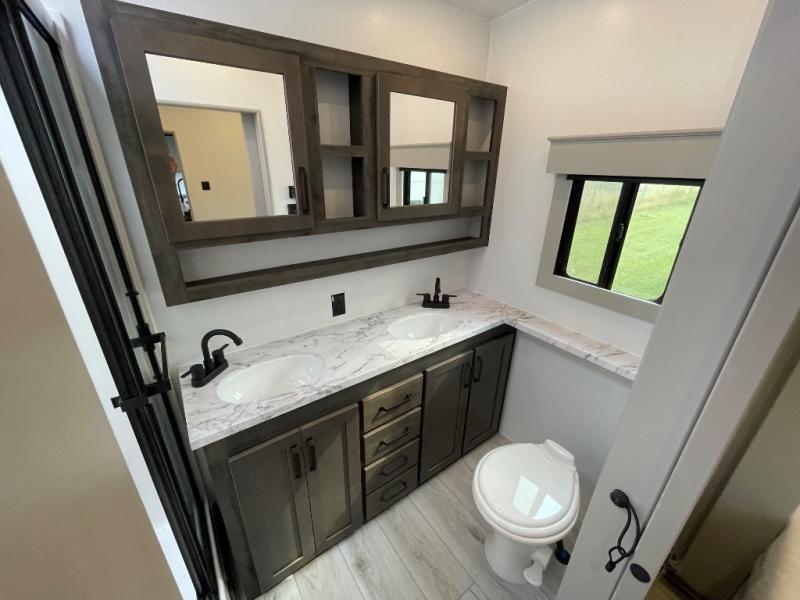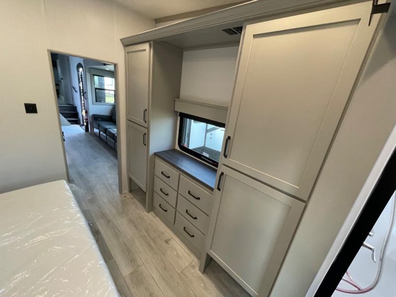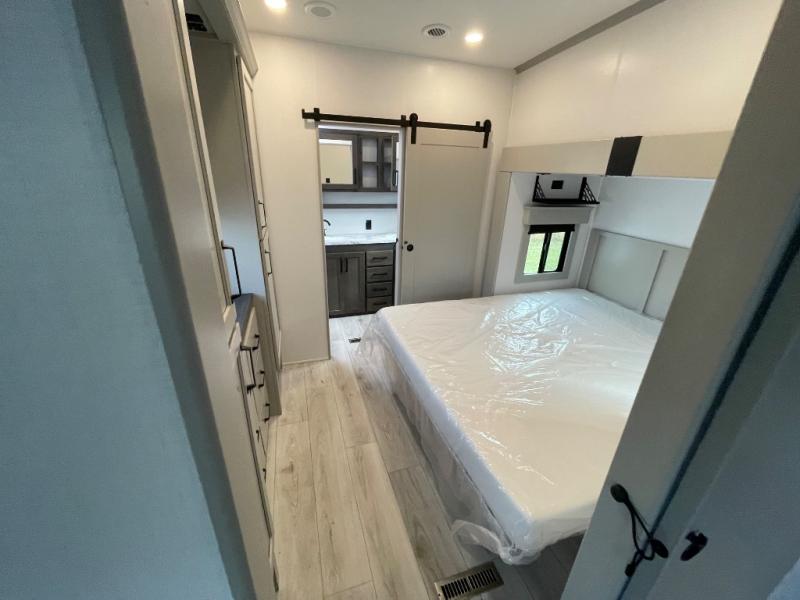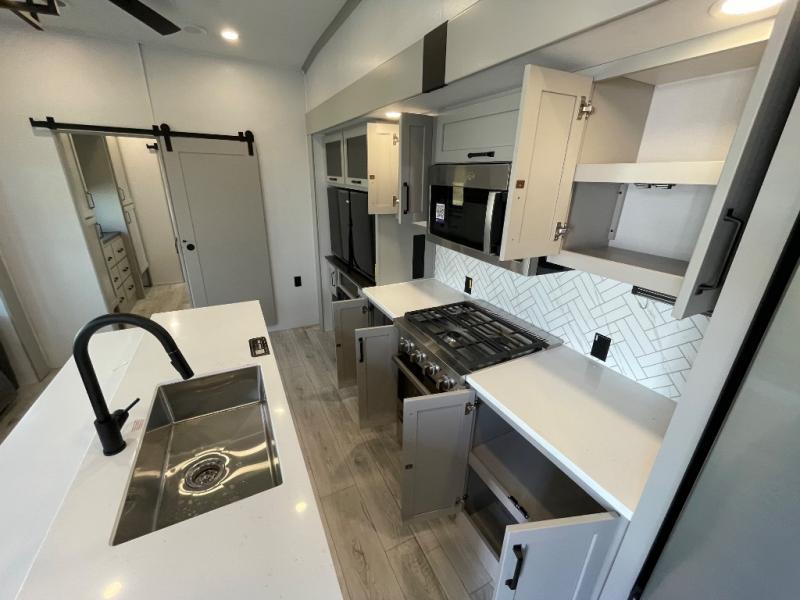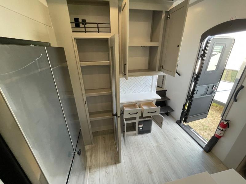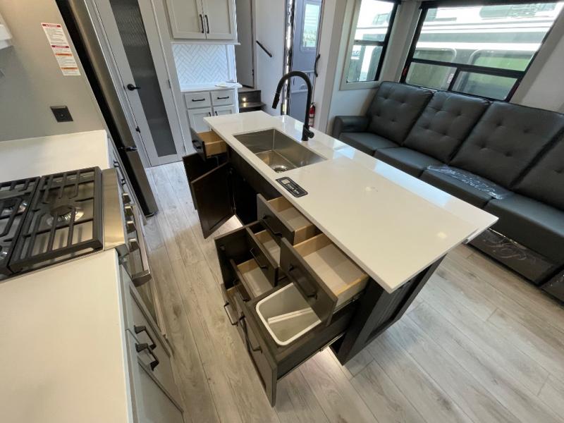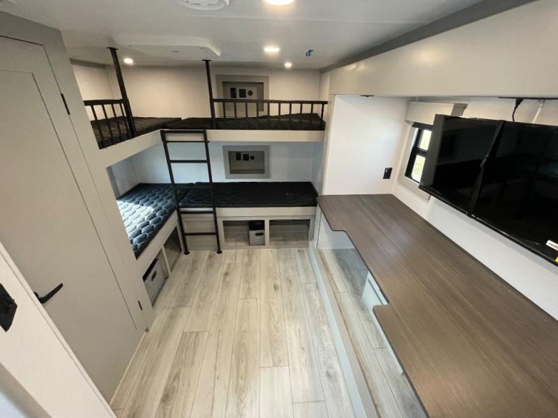 You'll love every minute spent in this spacious fifth wheel! It's perfect to camp with a larger group since there are bunk beds in the front bunkhouse suite plus a second suite in the back. The bunkhouse also includes two desks with chairs and storage drawers, a full bath, plus washer and dryer prep if you plan to go full-time. The rear suite features a king bed slide, two closets, a bedroom countertop plus a full rear bath with dual bath sinks; how convenient! Everyone will love to meet in the combined kitchen and living area in the morning. Here, you'll find two large opposing slides for tons of space, a large sofa and kitchen island, plus three pantries for all the snacks, canned goods, and paper products!