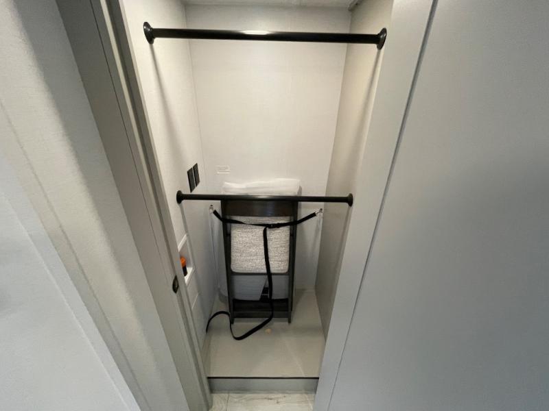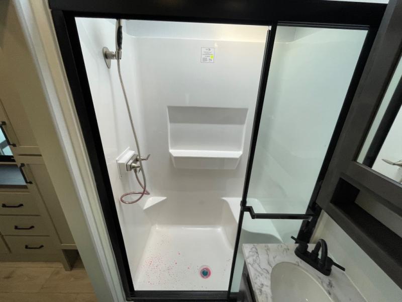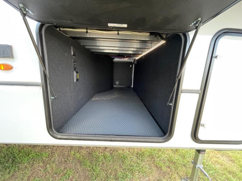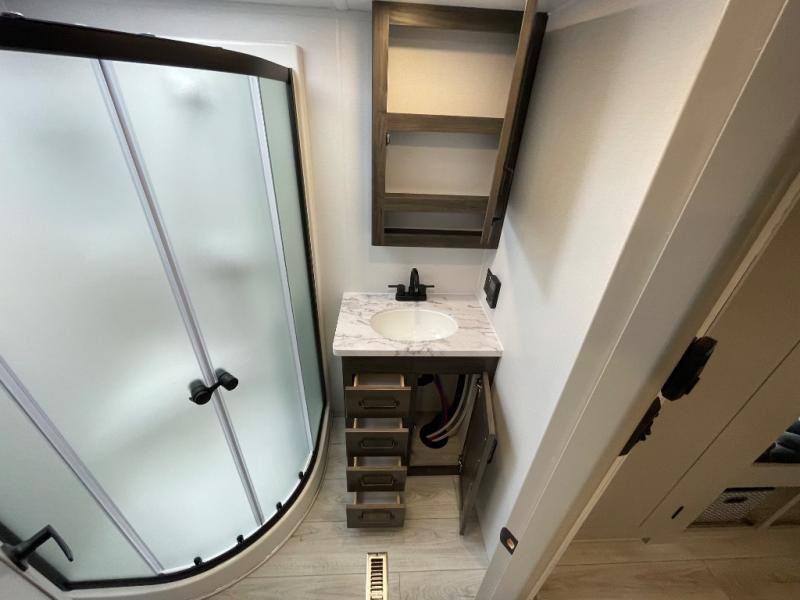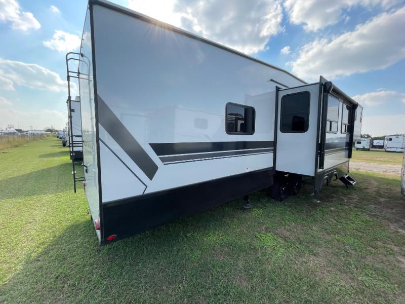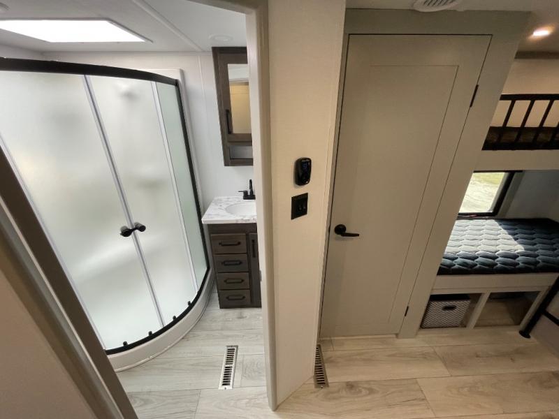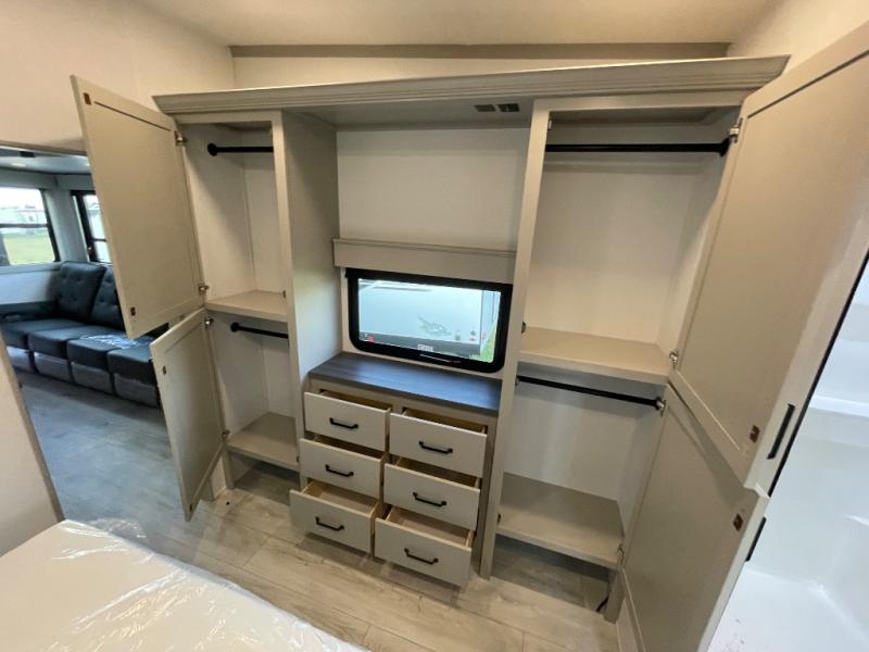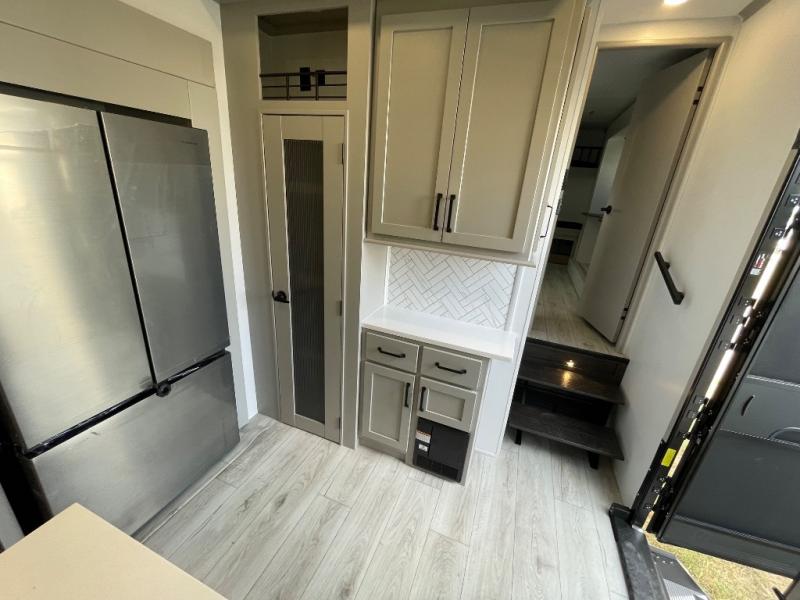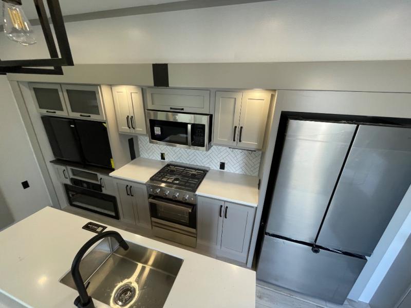 You'll love every minute spent in this spacious fifth wheel! It's perfect to camp with a larger group since there are bunk beds in the front bunkhouse suite plus a second suite in the back. The bunkhouse also includes two desks with chairs and storage drawers, a full bath, plus washer and dryer prep if you plan to go full-time. The rear suite features a king bed slide, two closets, a bedroom countertop plus a full rear bath with dual bath sinks; how convenient! Everyone will love to meet in the combined kitchen and living area in the morning. Here, you'll find two large opposing slides for tons of space, a large sofa and kitchen island, plus three pantries for all the snacks, canned goods, and paper products!