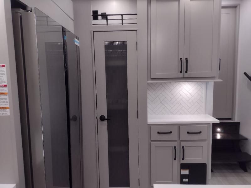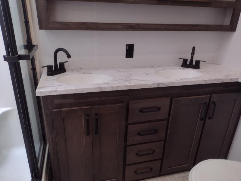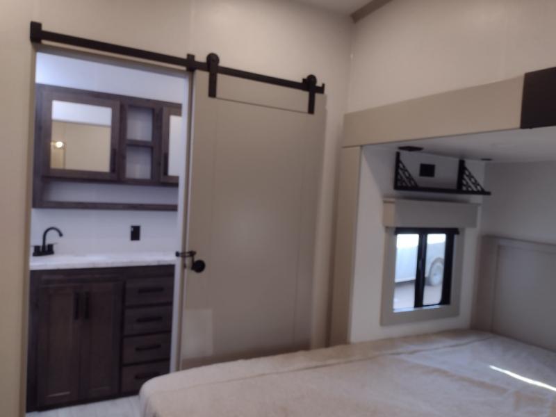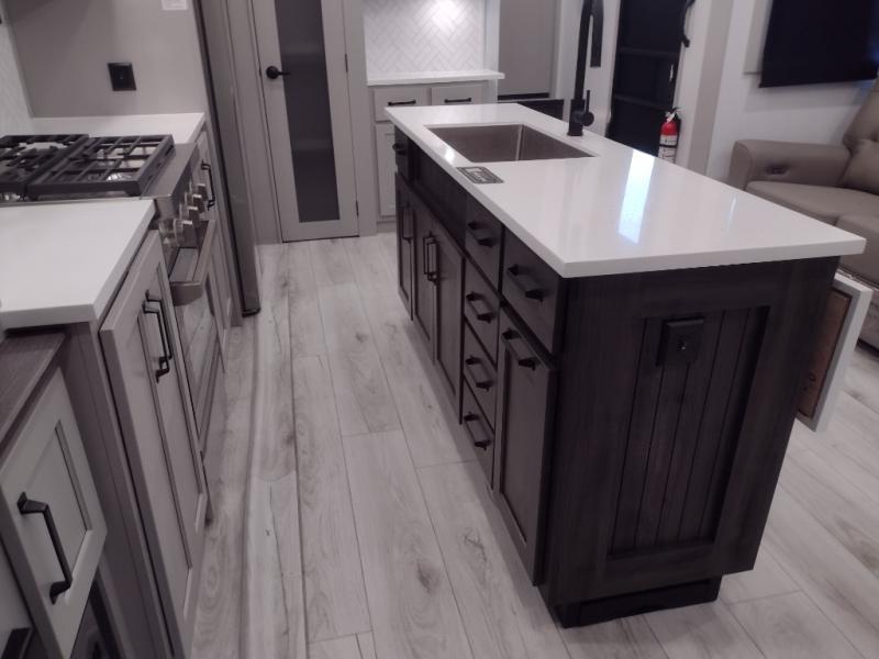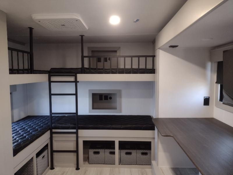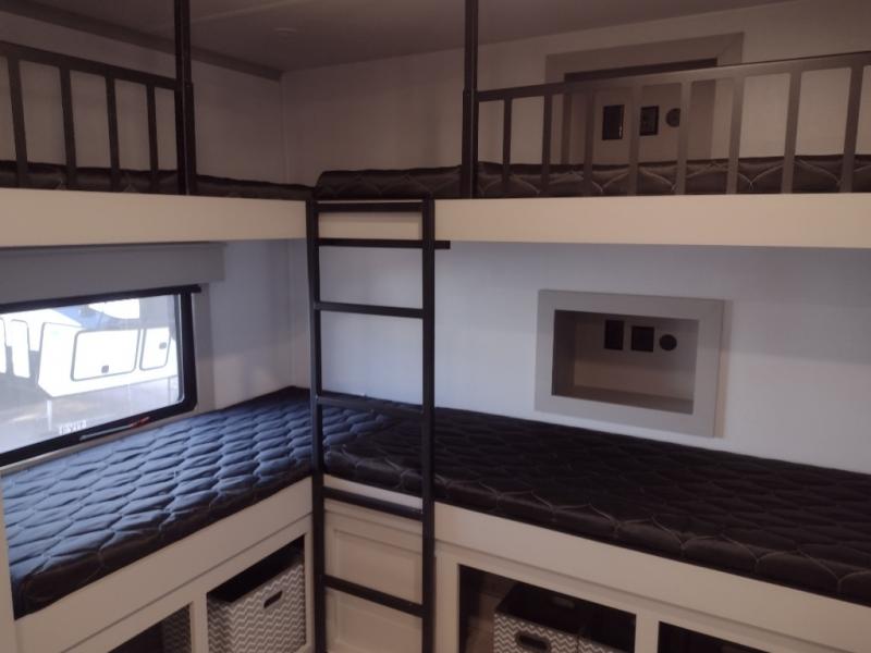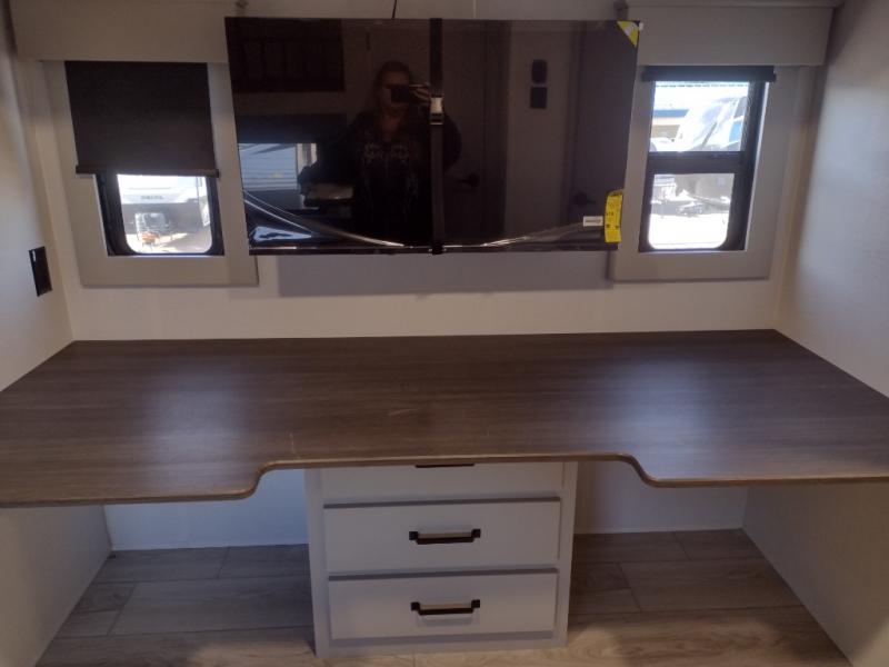 You'll love every minute spent in this spacious fifth wheel! It's perfect to camp with a larger group since there are bunk beds in the front bunkhouse suite plus a second suite in the back. The bunkhouse also includes two desks with chairs and storage drawers, a full bath, plus washer and dryer prep if you plan to go full-time. The rear suite features a king bed slide, two closets, a bedroom countertop plus a full rear bath with dual bath sinks; how convenient! Everyone will love to meet in the combined kitchen and living area in the morning. Here, you'll find two large opposing slides for tons of space, a large sofa and kitchen island, plus three pantries for all the snacks, canned goods, and paper products!