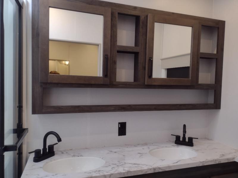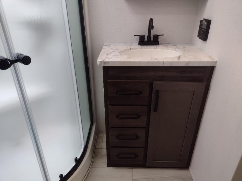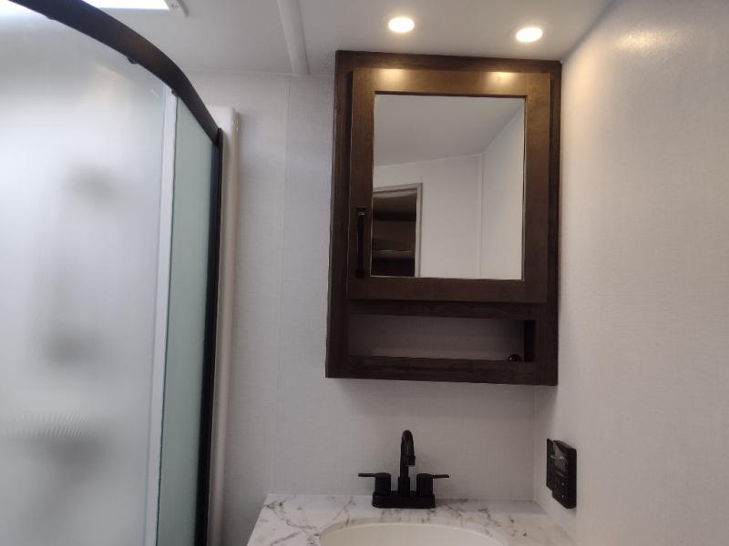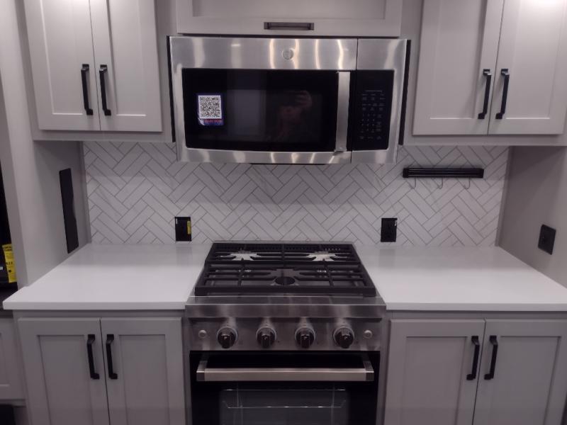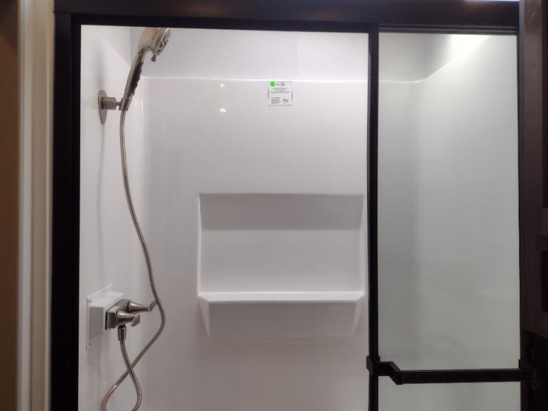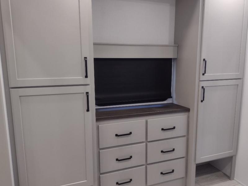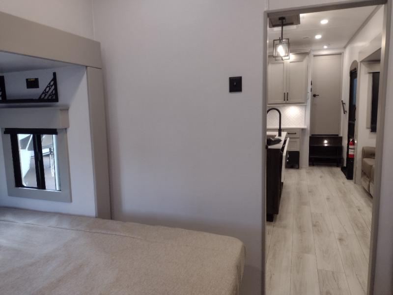 You'll love every minute spent in this spacious fifth wheel! It's perfect to camp with a larger group since there are bunk beds in the front bunkhouse suite plus a second suite in the back. The bunkhouse also includes two desks with chairs and storage drawers, a full bath, plus washer and dryer prep if you plan to go full-time. The rear suite features a king bed slide, two closets, a bedroom countertop plus a full rear bath with dual bath sinks; how convenient! Everyone will love to meet in the combined kitchen and living area in the morning. Here, you'll find two large opposing slides for tons of space, a large sofa and kitchen island, plus three pantries for all the snacks, canned goods, and paper products!