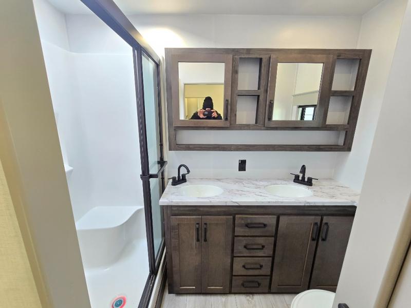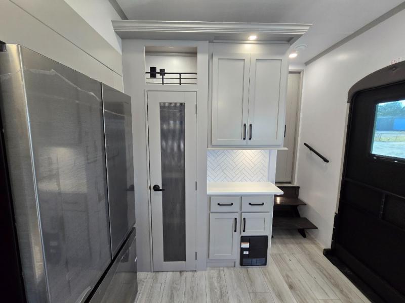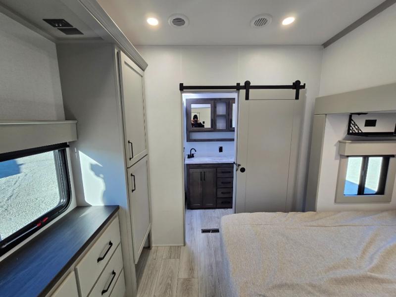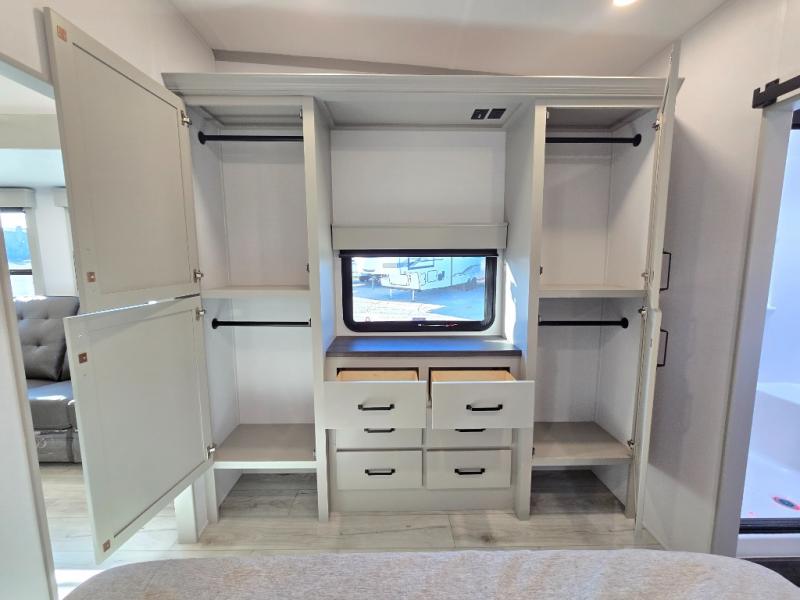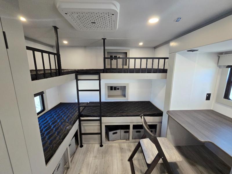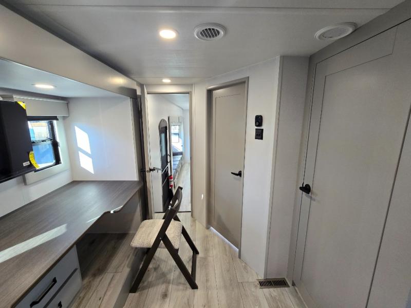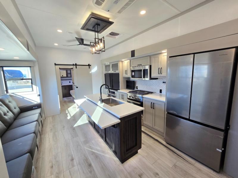 You'll love every minute spent in this spacious fifth wheel! It's perfect to camp with a larger group since there are bunk beds in the front bunkhouse suite plus a second suite in the back. The bunkhouse also includes two desks with chairs and storage drawers, a full bath, plus washer and dryer prep if you plan to go full-time. The rear suite features a king bed slide, two closets, a bedroom countertop plus a full rear bath with dual bath sinks; how convenient! Everyone will love to meet in the combined kitchen and living area in the morning. Here, you'll find two large opposing slides for tons of space, a large sofa and kitchen island, plus three pantries for all the snacks, canned goods, and paper products!