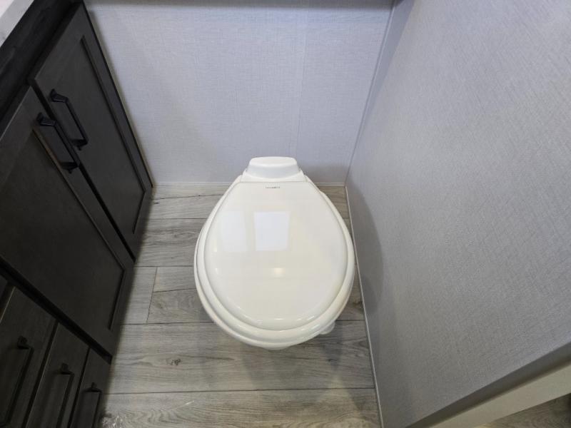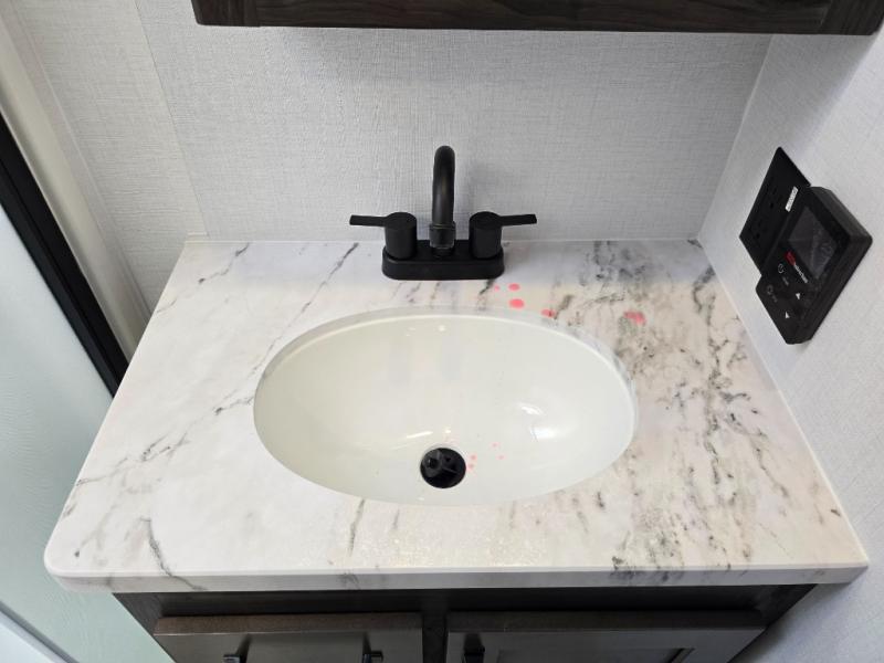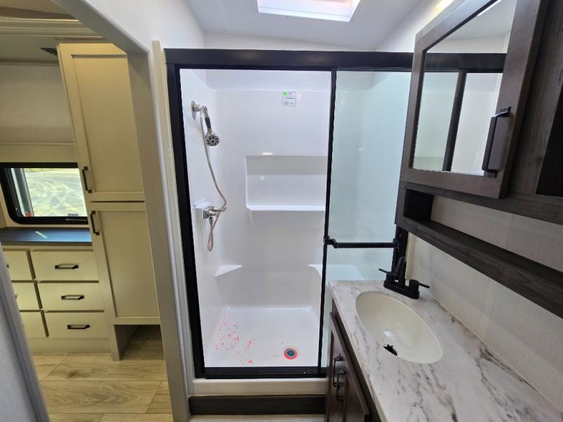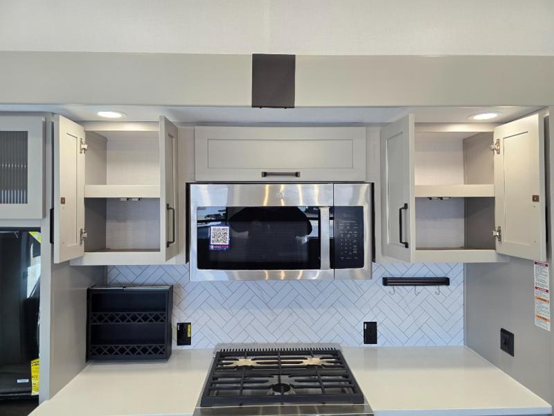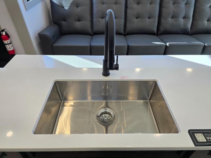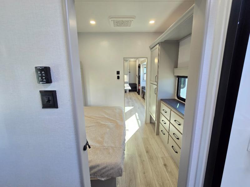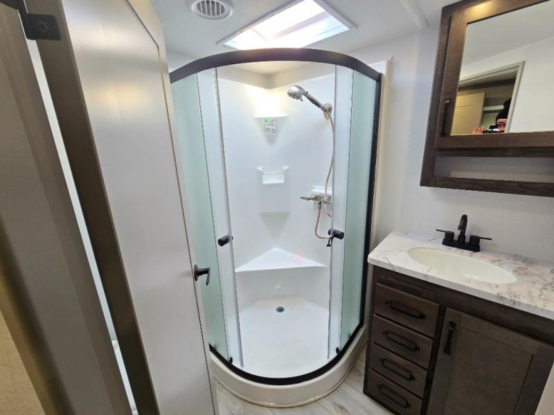 You'll love every minute spent in this spacious fifth wheel! It's perfect to camp with a larger group since there are bunk beds in the front bunkhouse suite plus a second suite in the back. The bunkhouse also includes two desks with chairs and storage drawers, a full bath, plus washer and dryer prep if you plan to go full-time. The rear suite features a king bed slide, two closets, a bedroom countertop plus a full rear bath with dual bath sinks; how convenient! Everyone will love to meet in the combined kitchen and living area in the morning. Here, you'll find two large opposing slides for tons of space, a large sofa and kitchen island, plus three pantries for all the snacks, canned goods, and paper products!