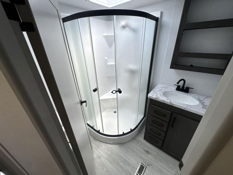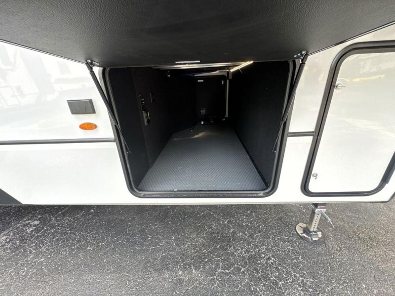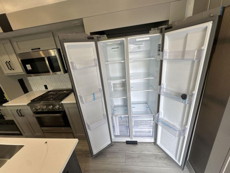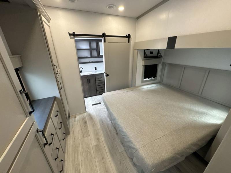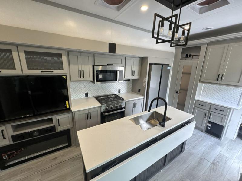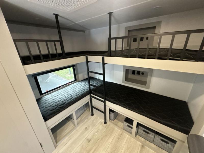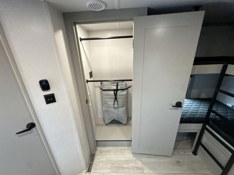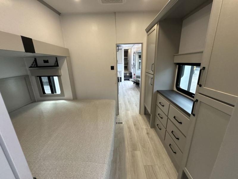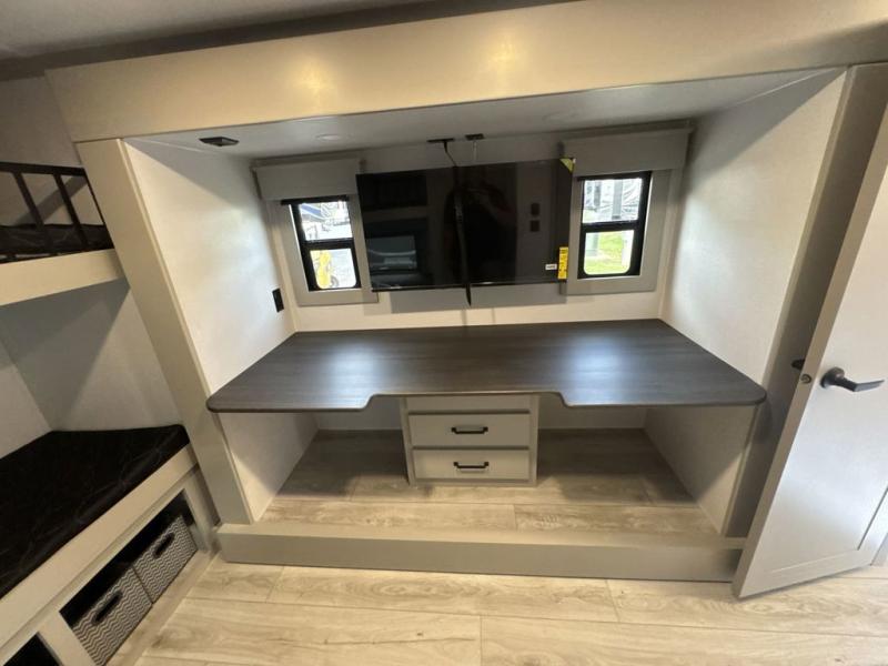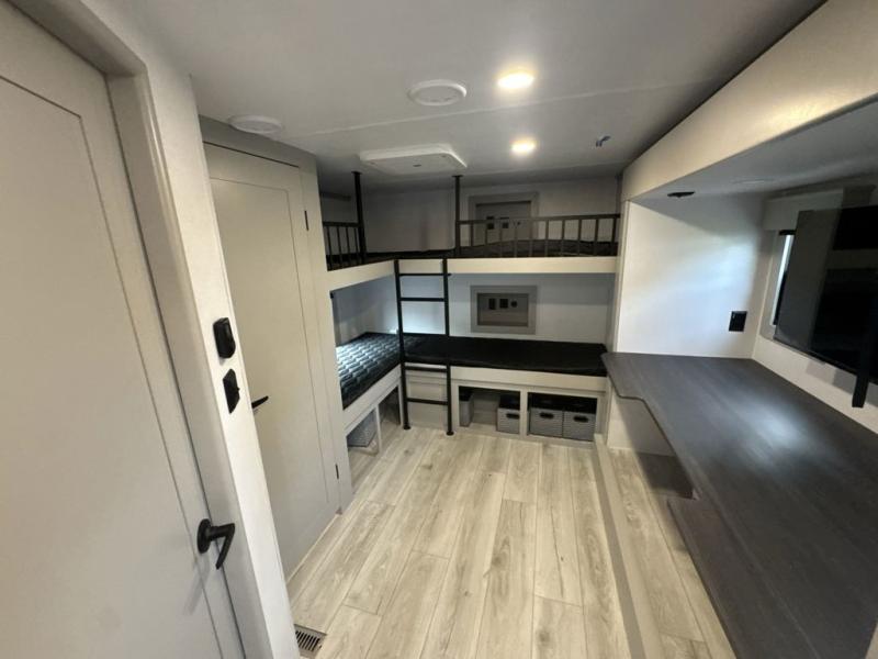 You'll love every minute spent in this spacious fifth wheel! It's perfect to camp with a larger group since there are bunk beds in the front bunkhouse suite plus a second suite in the back. The bunkhouse also includes two desks with chairs and storage drawers, a full bath, plus washer and dryer prep if you plan to go full-time. The rear suite features a king bed slide, two closets, a bedroom countertop plus a full rear bath with dual bath sinks; how convenient! Everyone will love to meet in the combined kitchen and living area in the morning. Here, you'll find two large opposing slides for tons of space, a large sofa and kitchen island, plus three pantries for all the snacks, canned goods, and paper products!