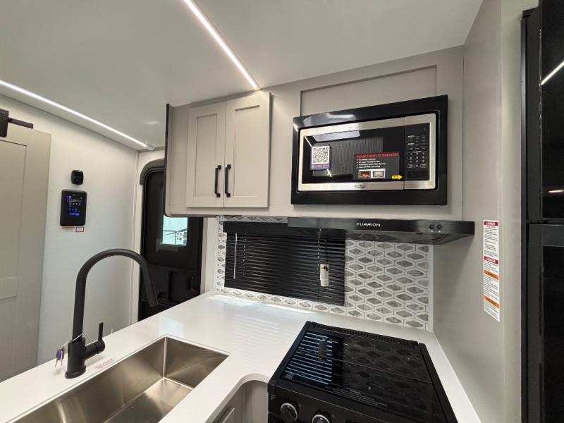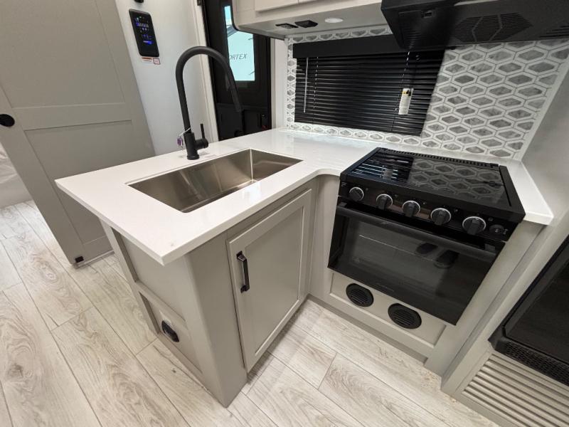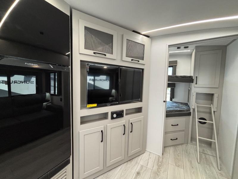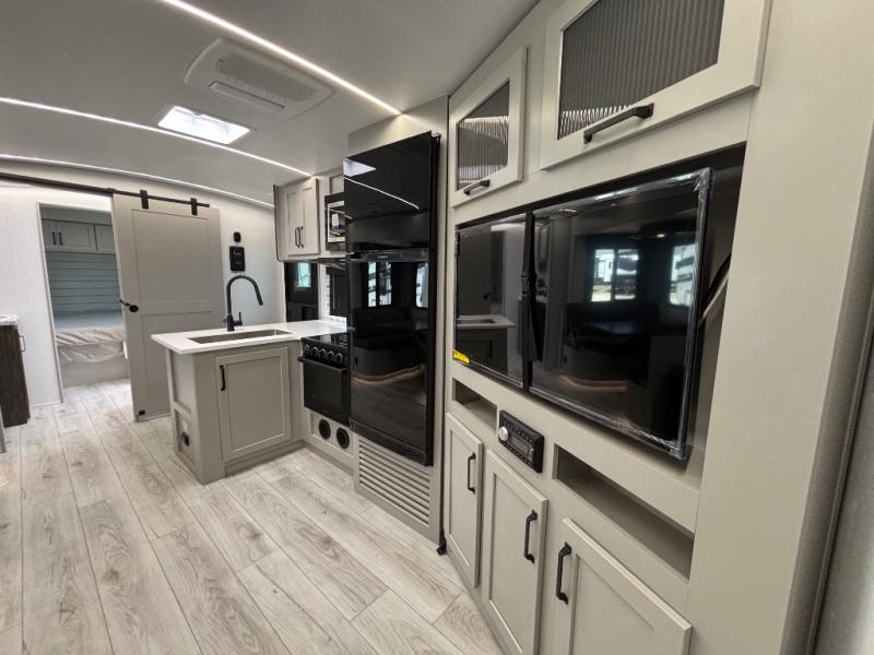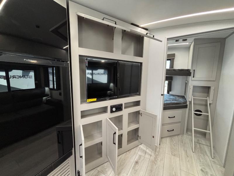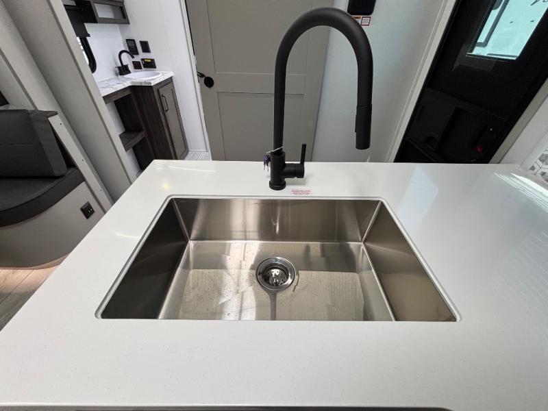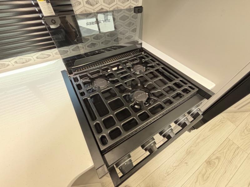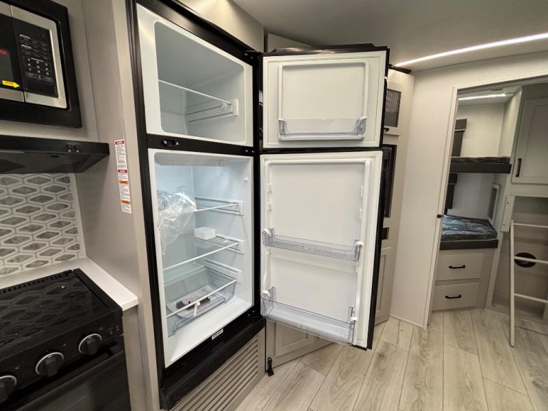 This family travel trailer comes with a fully equipped kitchen featuring stainless steel appliances, a three-burner cooktop, oven, microwave, and large refrigerator. Solid-surface countertops and abundant storage make it easy to prepare home-cooked meals anywhere you travel.