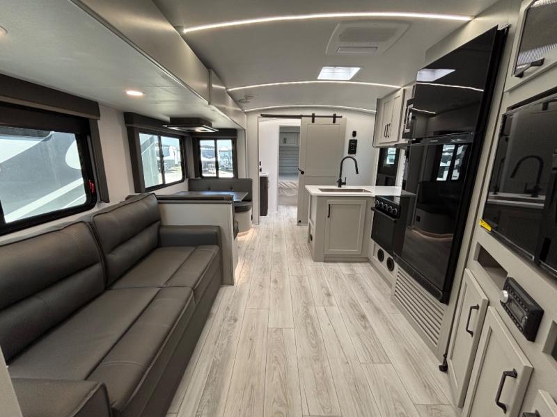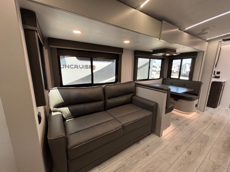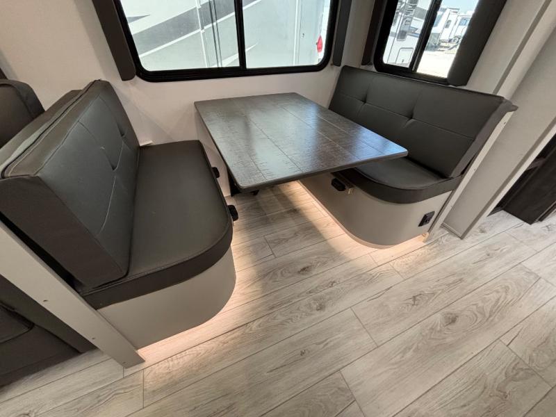 Inside, you’ll find a bright, open floorplan with a large slide-out that maximizes living space. Residential-style furniture, modern décor, and large windows create a welcoming atmosphere. The U-shaped dinette and sofa offer plenty of seating for meals, games, or family movie nights.