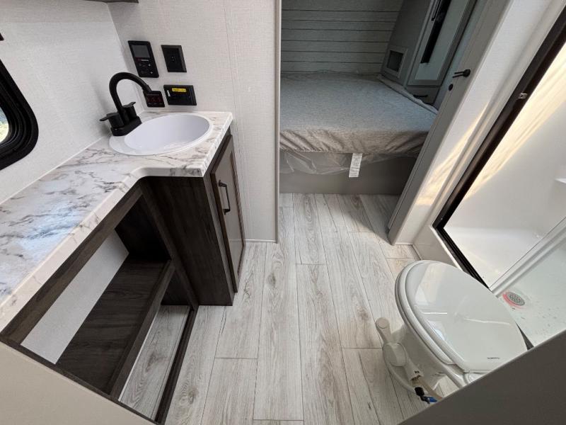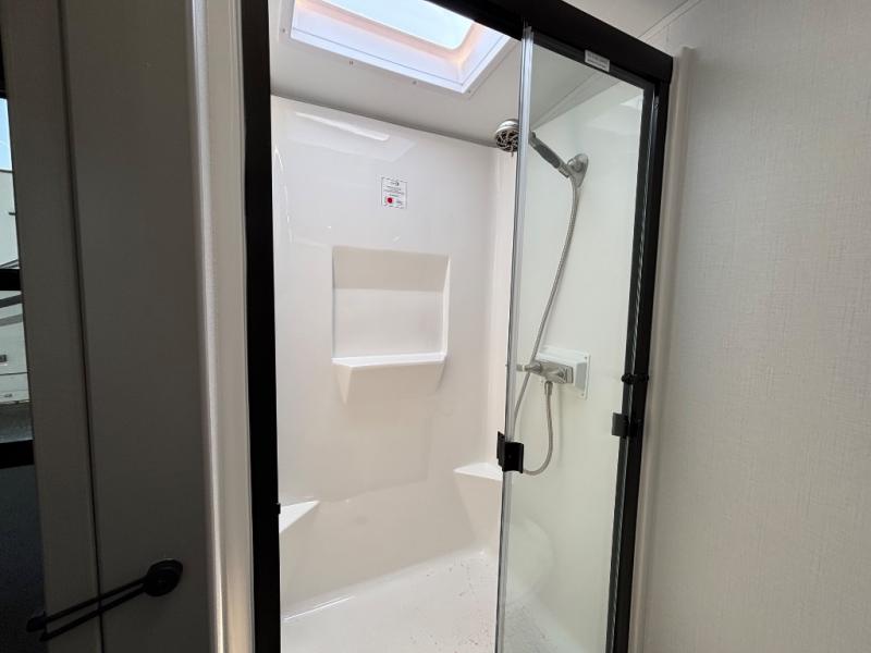 The centrally located bathroom includes a roomy shower, vanity, and medicine cabinet with easy access from both the living area and bunkhouse.