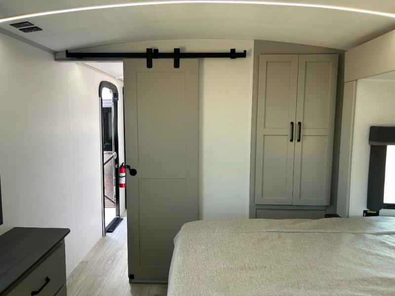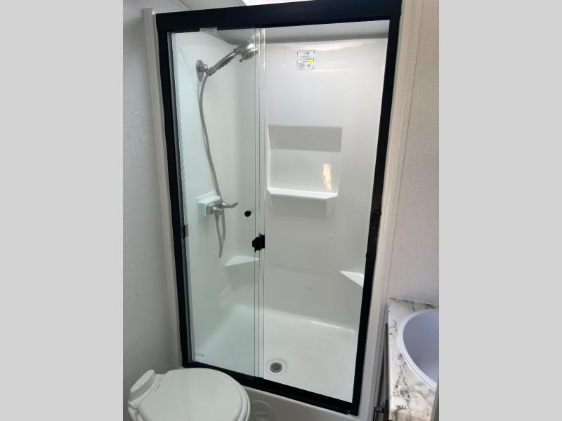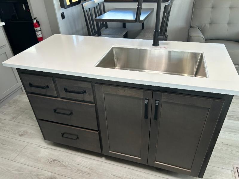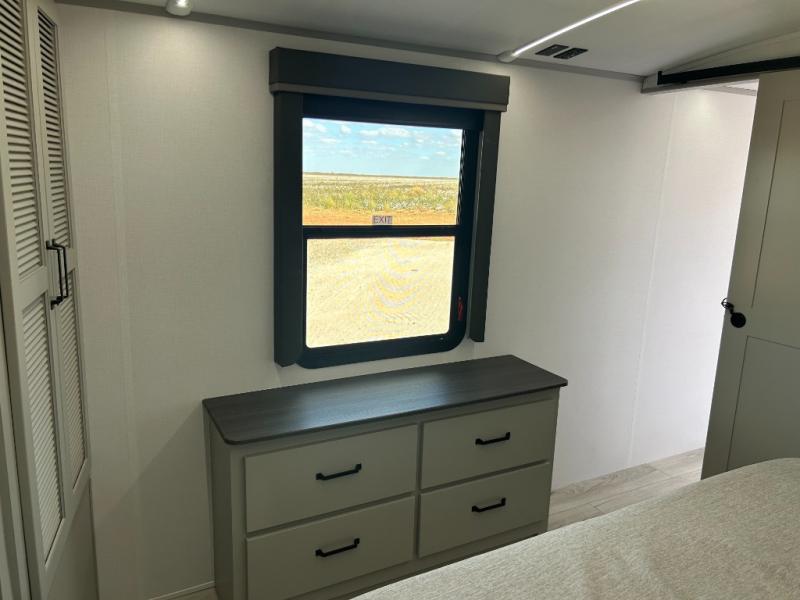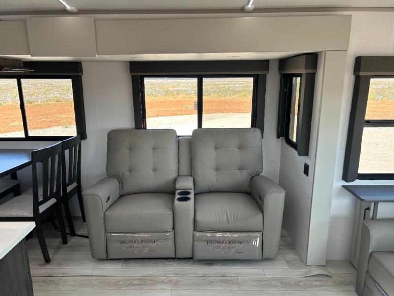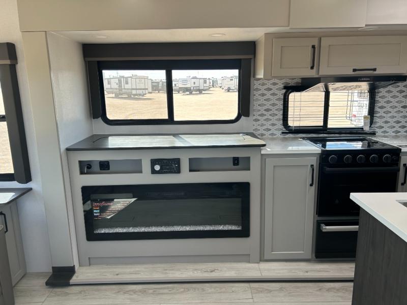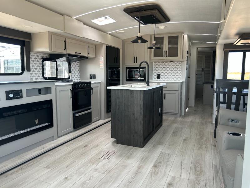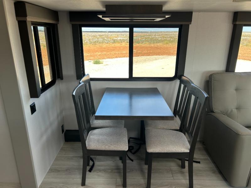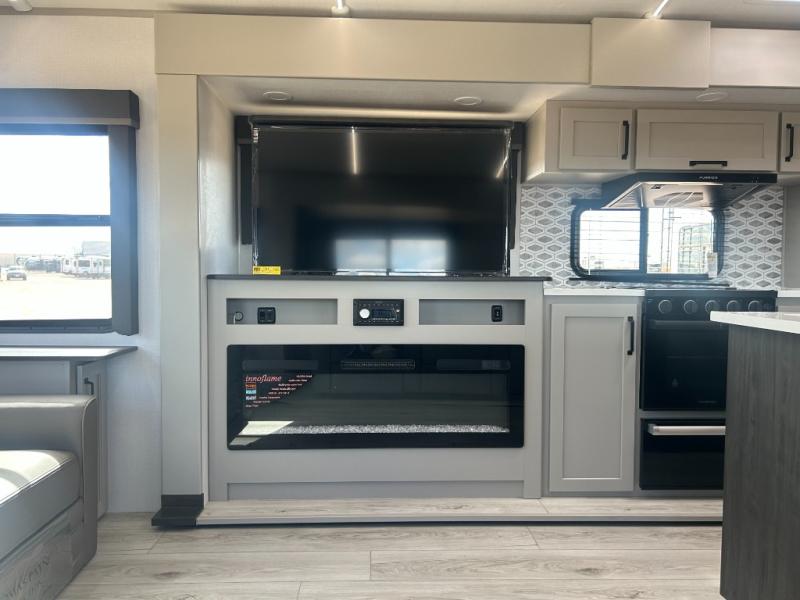 Whether you camp for inside comforts or outside adventures, this trailer will provide the comfort once you step inside. The rear living area has a sofa sleeper for guests, three slides throughout for maximum floor space, and a 10 cu. ft. 12V GE refrigerator. There is a 50" HDTV and fireplace to enjoy, theater seats, and a booth dinette, or you can choose a table and chairs option in its place. The full bathroom will let you freshen up each night, and the bedroom offers a king bed, front wardrobe, washer/dryer prep, and more storage.