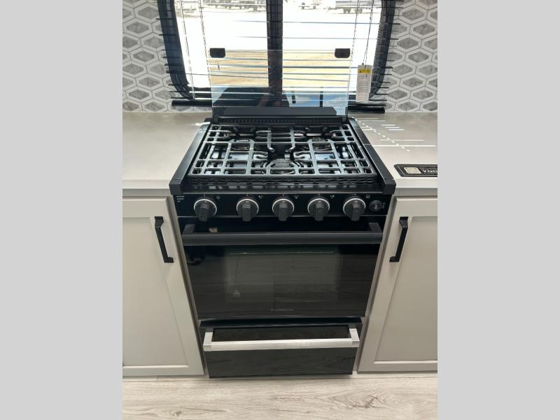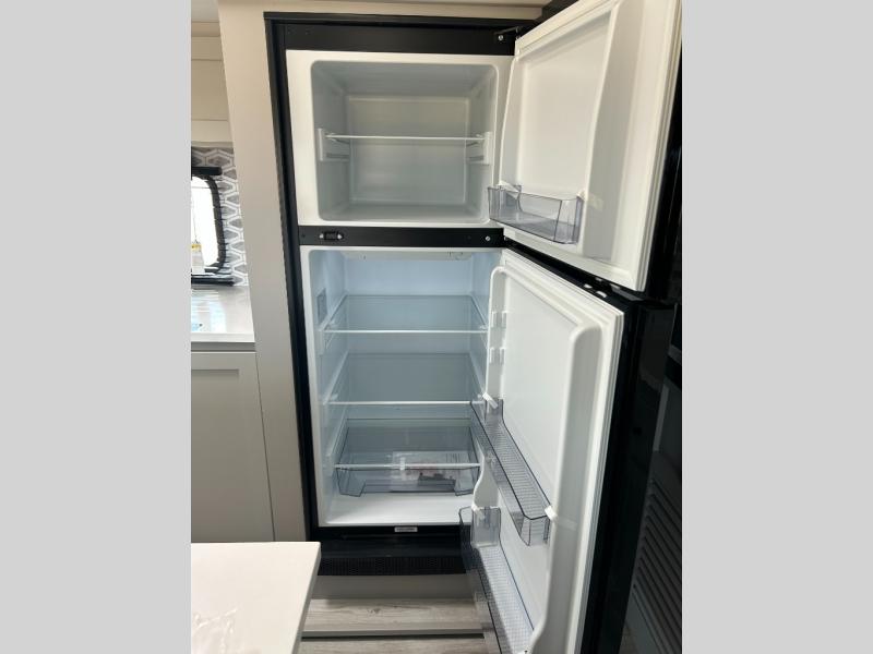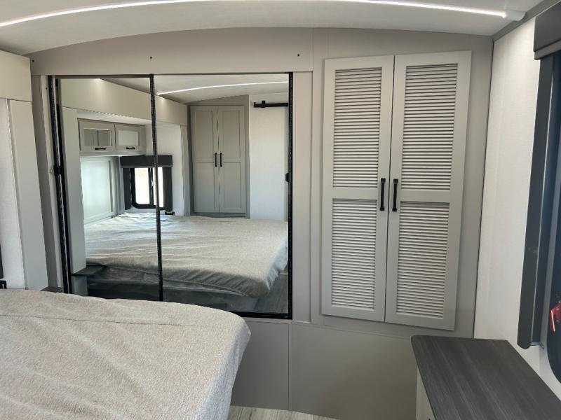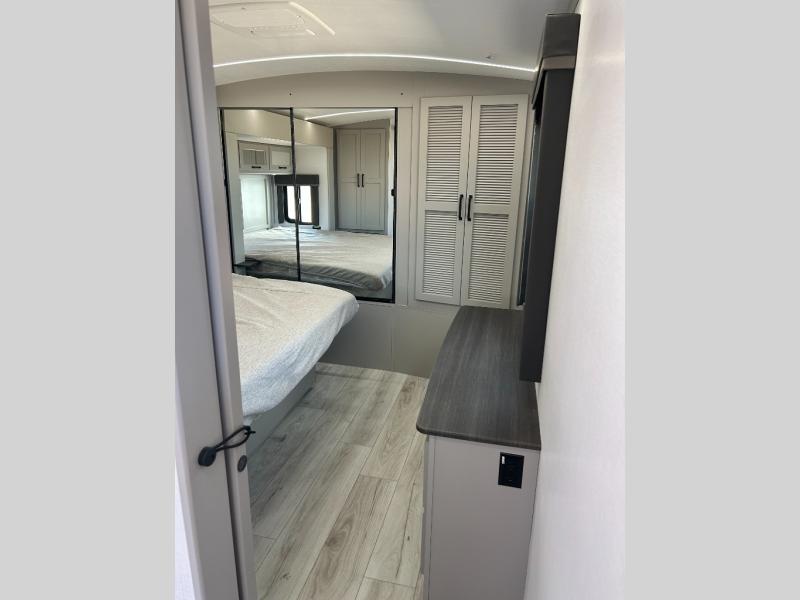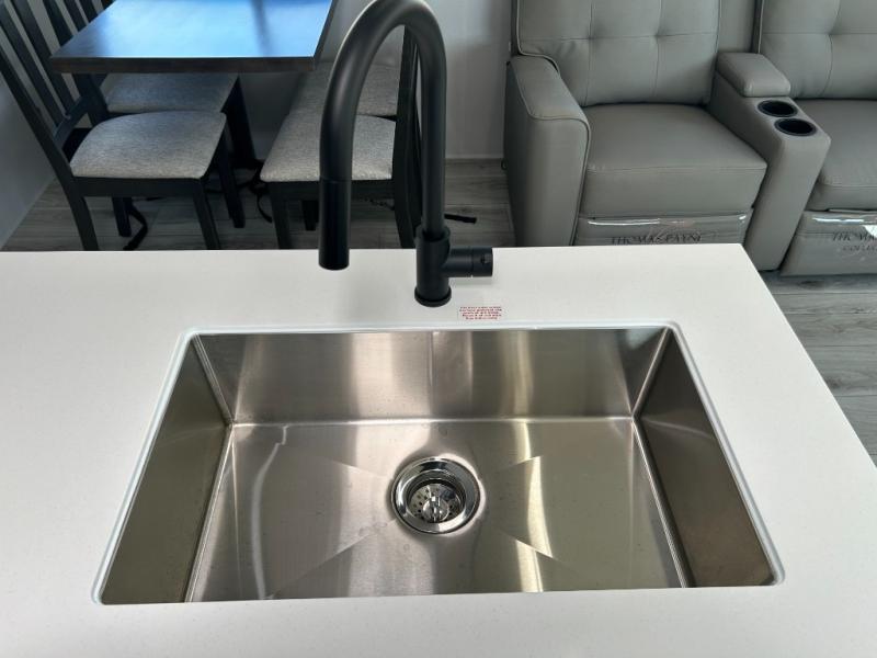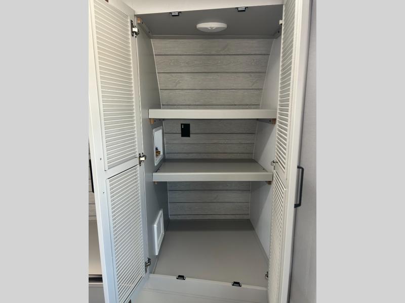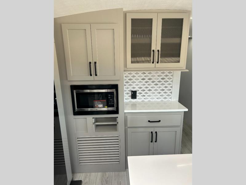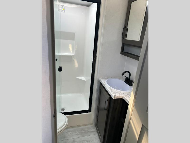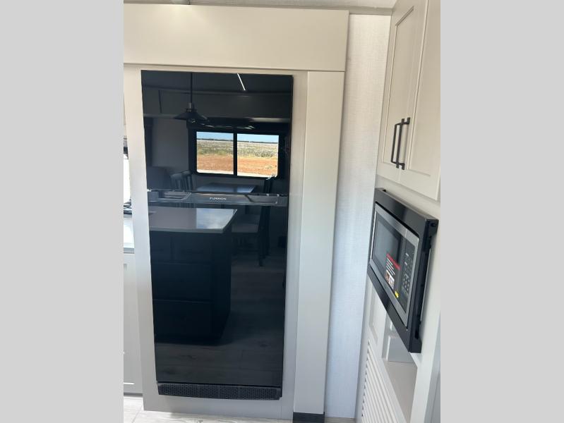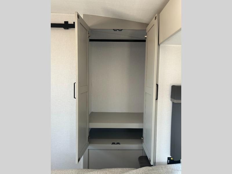 Whether you camp for inside comforts or outside adventures, this trailer will provide the comfort once you step inside. The rear living area has a sofa sleeper for guests, three slides throughout for maximum floor space, and a 10 cu. ft. 12V GE refrigerator. There is a 50" HDTV and fireplace to enjoy, theater seats, and a booth dinette, or you can choose a table and chairs option in its place. The full bathroom will let you freshen up each night, and the bedroom offers a king bed, front wardrobe, washer/dryer prep, and more storage.