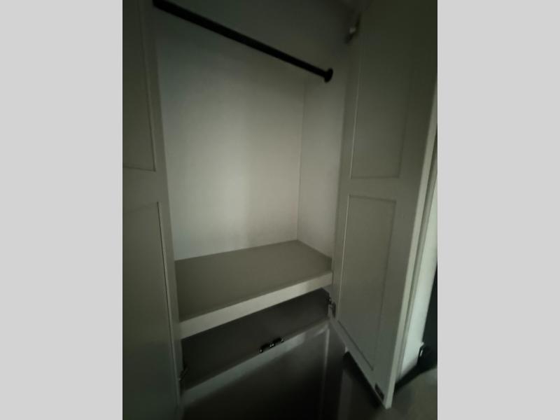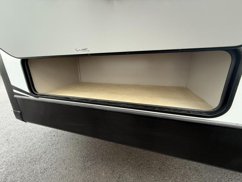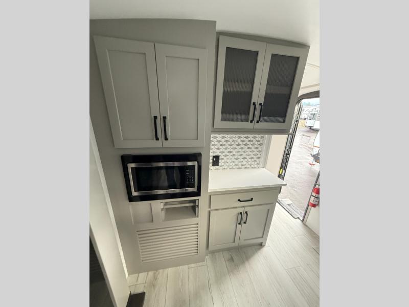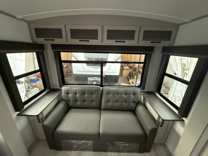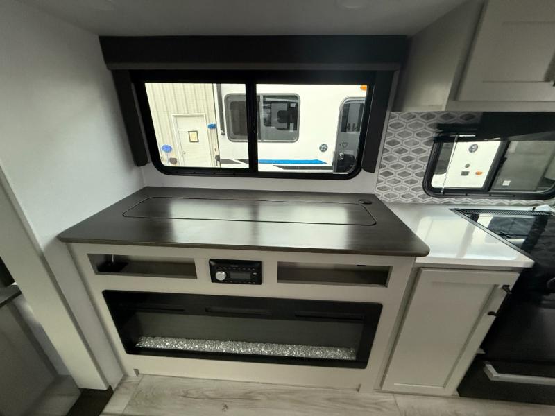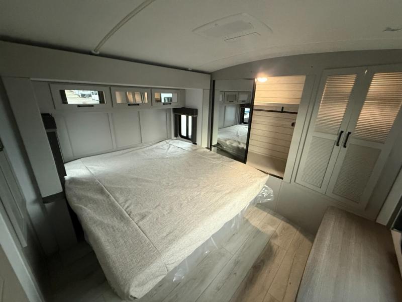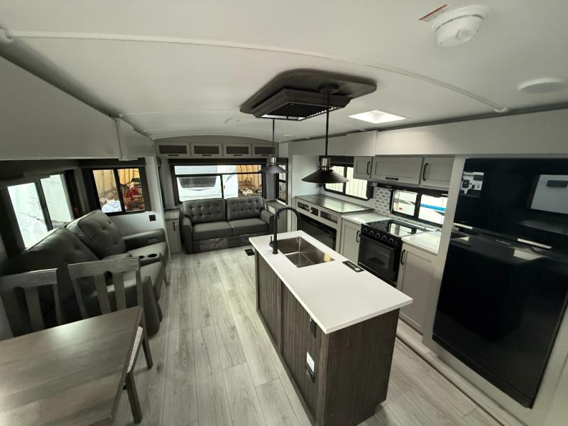 Whether you camp for inside comforts or outside adventures, this trailer will provide the comfort once you step inside. The rear living area has a sofa sleeper for guests, three slides throughout for maximum floor space, and a 10 cu. ft. 12V GE refrigerator. There is a 50" HDTV and fireplace to enjoy, theater seats, and a booth dinette, or you can choose a table and chairs option in its place. The full bathroom will let you freshen up each night, and the bedroom offers a king bed, front wardrobe, washer/dryer prep, and more storage.