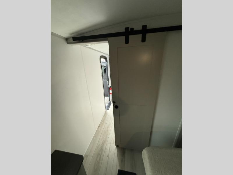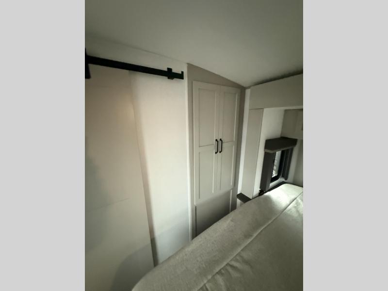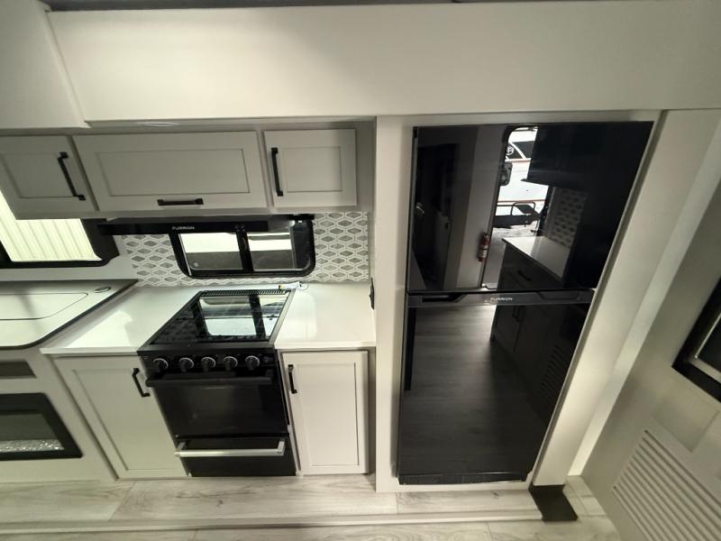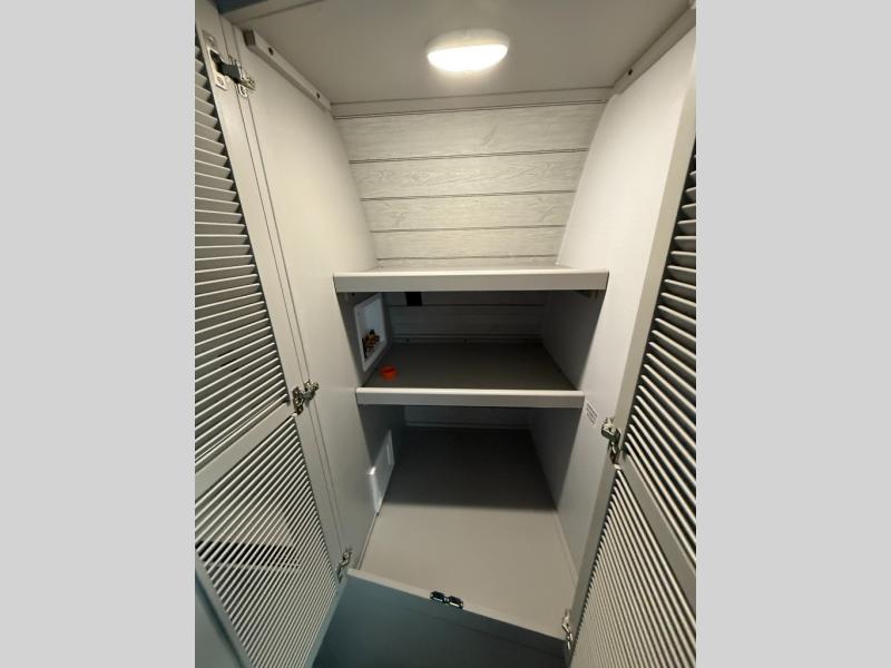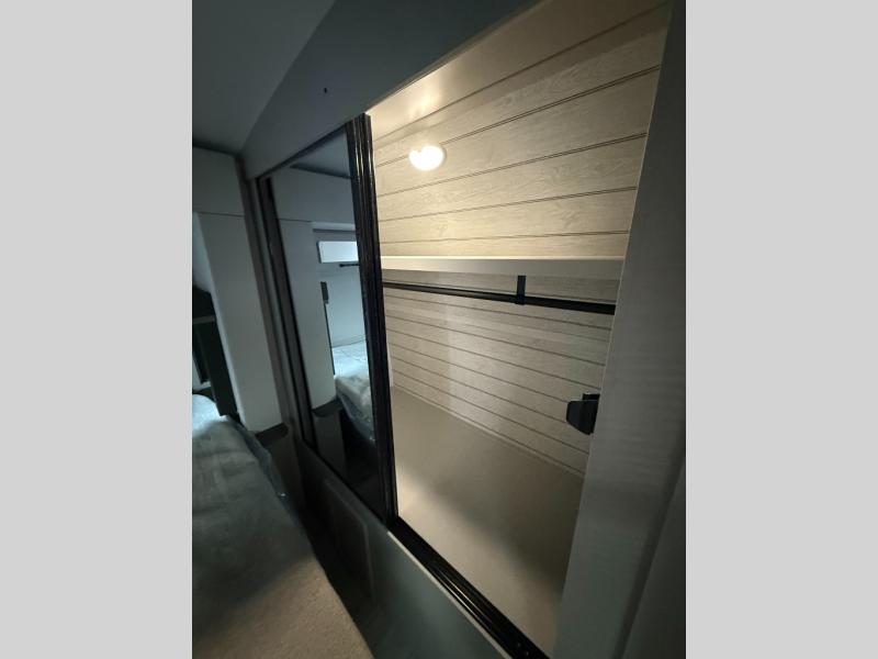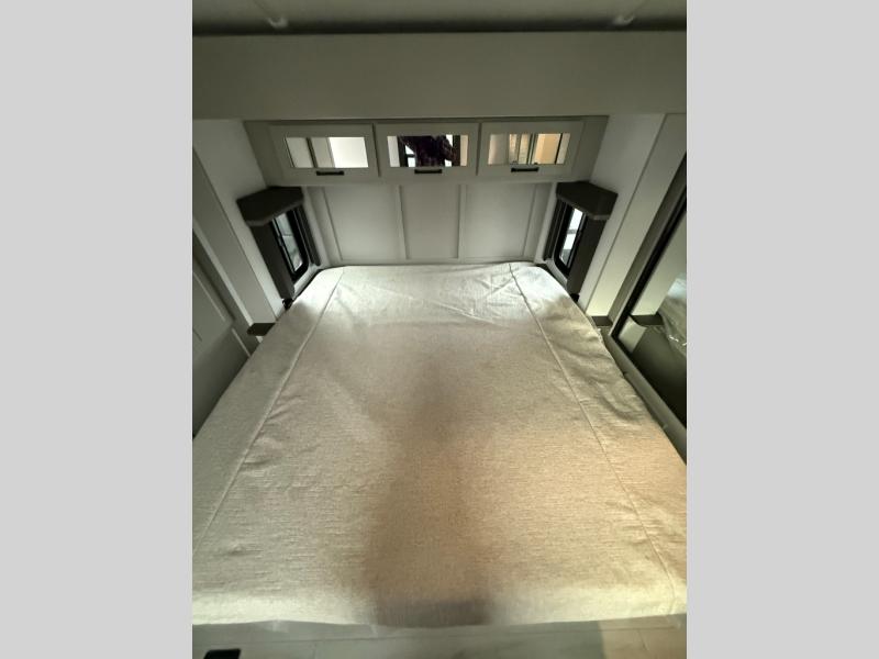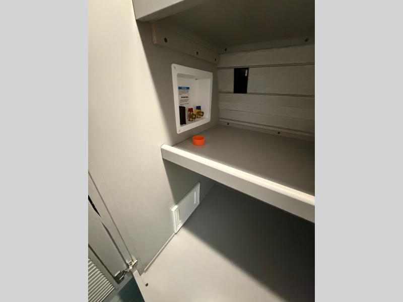 Whether you camp for inside comforts or outside adventures, this trailer will provide the comfort once you step inside. The rear living area has a sofa sleeper for guests, three slides throughout for maximum floor space, and a 10 cu. ft. 12V GE refrigerator. There is a 50" HDTV and fireplace to enjoy, theater seats, and a booth dinette, or you can choose a table and chairs option in its place. The full bathroom will let you freshen up each night, and the bedroom offers a king bed, front wardrobe, washer/dryer prep, and more storage.