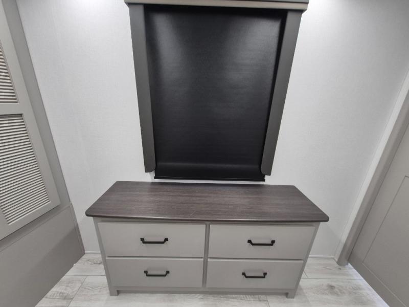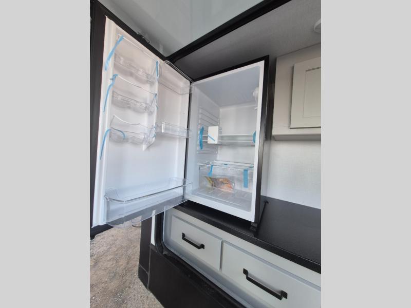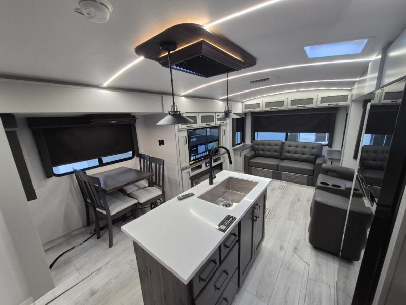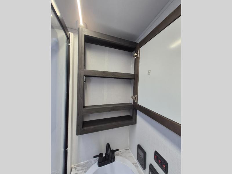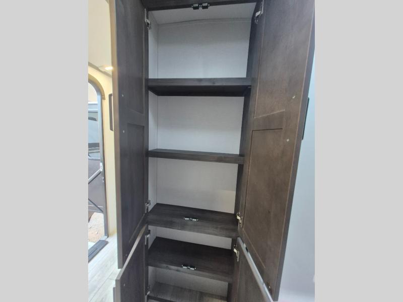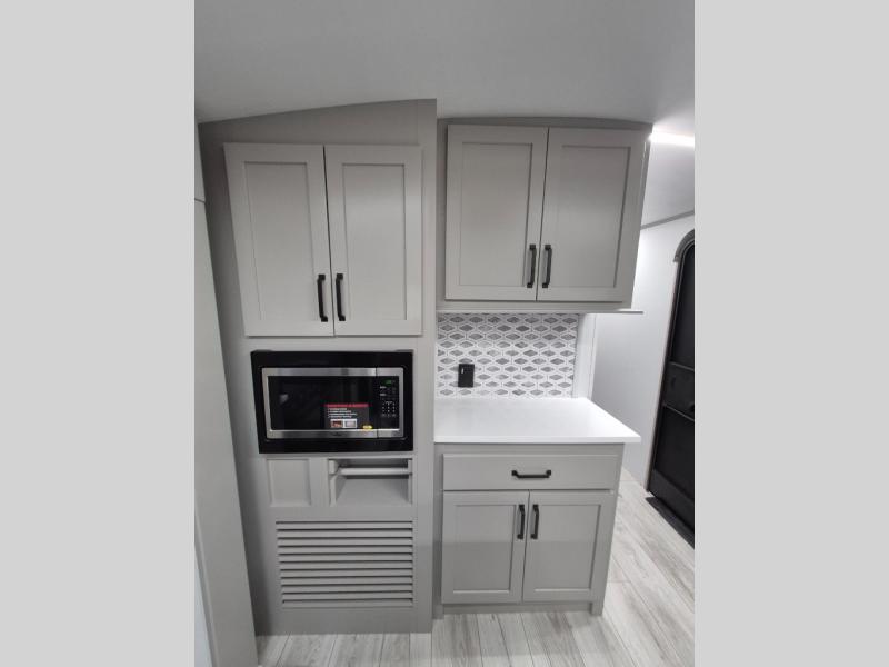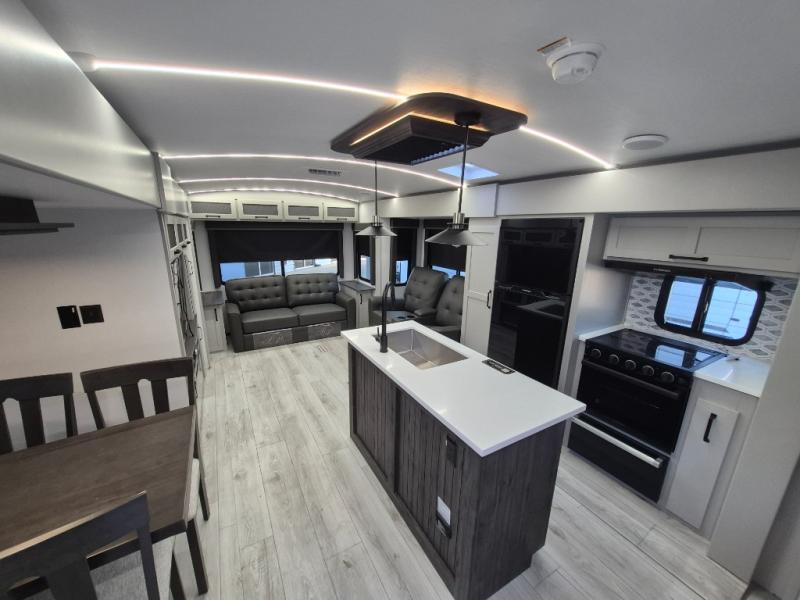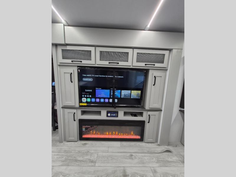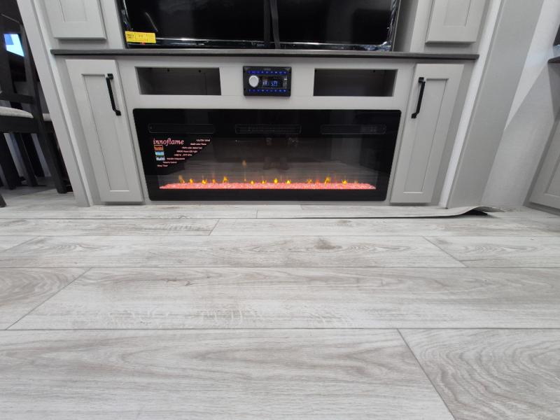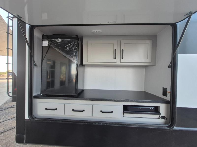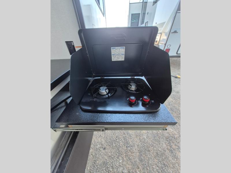 A spacious rear living area is created by two opposing slide outs giving everyone plenty of floor space to move from the sofa sleeper to the double entry bathroom and front private bedroom. You can relax on the theater seats while watching the 50" HDTV with fireplace below, and dine at the booth dinette. The kitchen island is a great place to wash the veggies and fruit, and prepare meals. The cook will have full amenities including more counter space near the microwave. And there is an outside kitchen with a flip-out stove and more. The slide out king bed gives you more space in the front bedroom, and you will find plenty of storage and a place for your best friend in the built-in pet kennel.