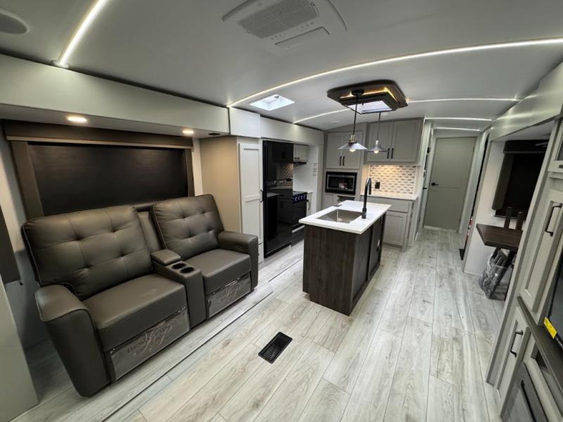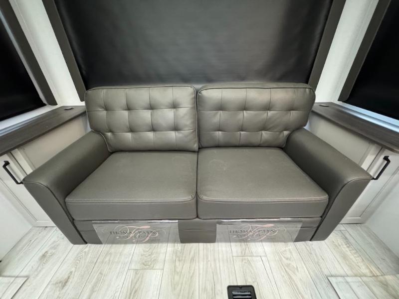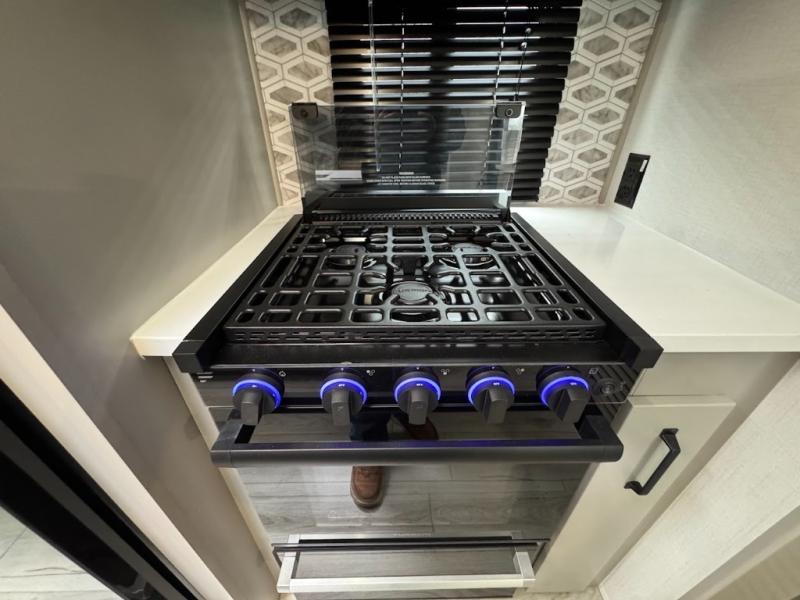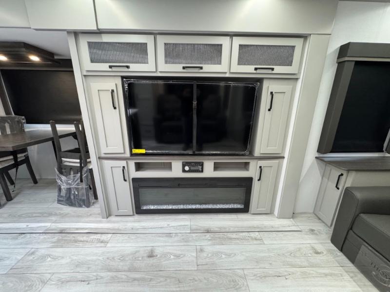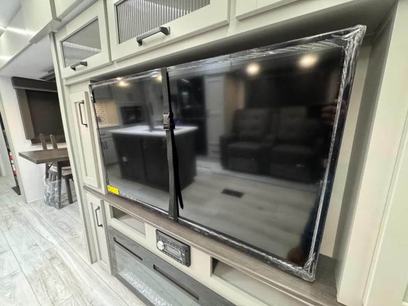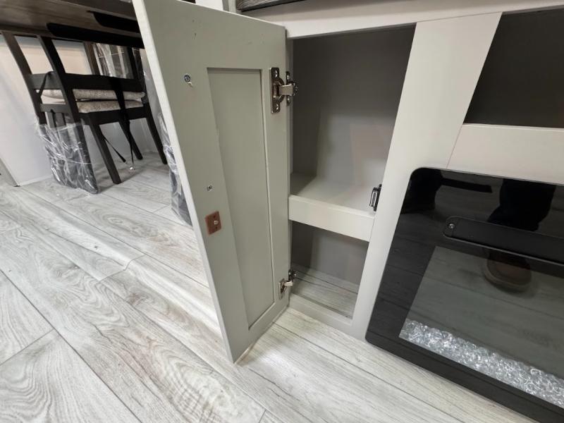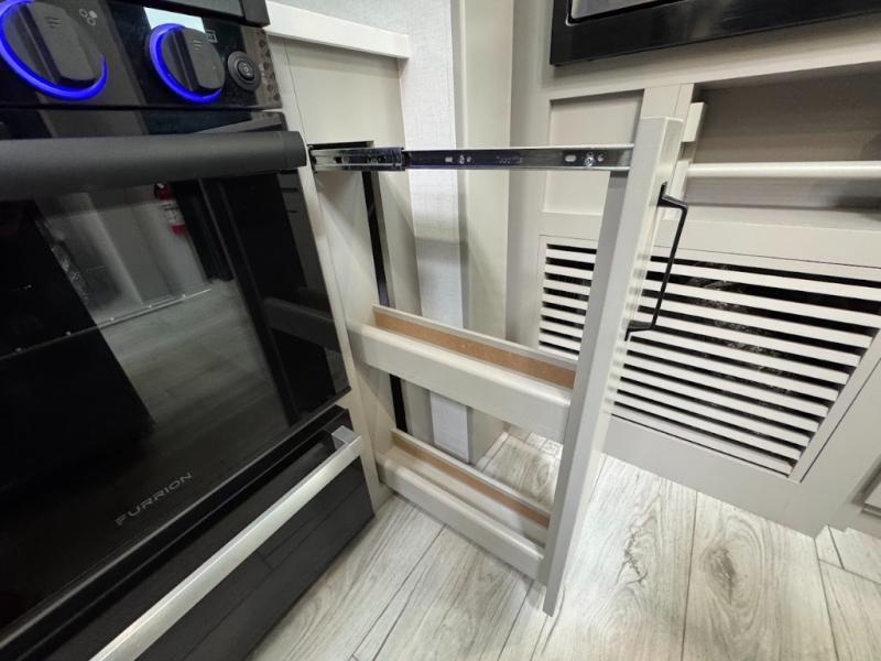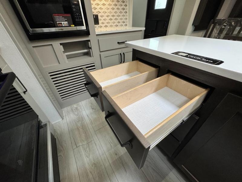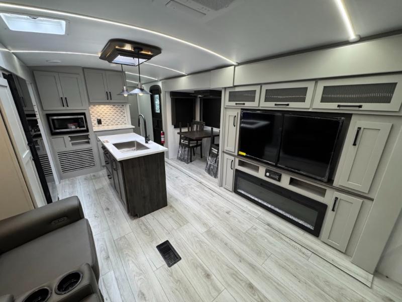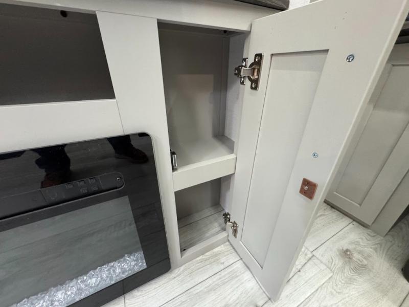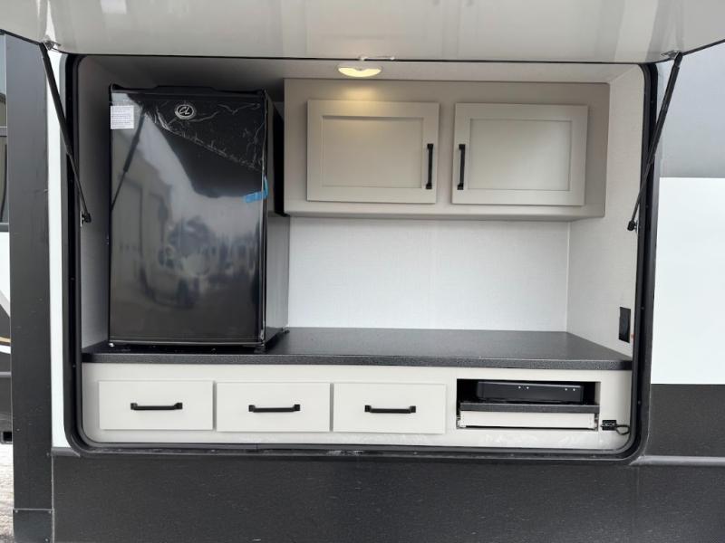 A spacious rear living area is created by two opposing slide outs giving everyone plenty of floor space to move from the sofa sleeper to the double entry bathroom and front private bedroom. You can relax on the theater seats while watching the 50" HDTV with fireplace below, and dine at the booth dinette. The kitchen island is a great place to wash the veggies and fruit, and prepare meals. The cook will have full amenities including more counter space near the microwave. And there is an outside kitchen with a flip-out stove and more. The slide out king bed gives you more space in the front bedroom, and you will find plenty of storage and a place for your best friend in the built-in pet kennel.