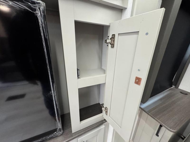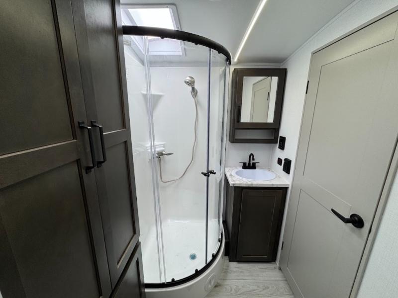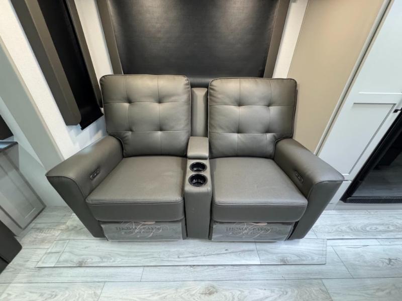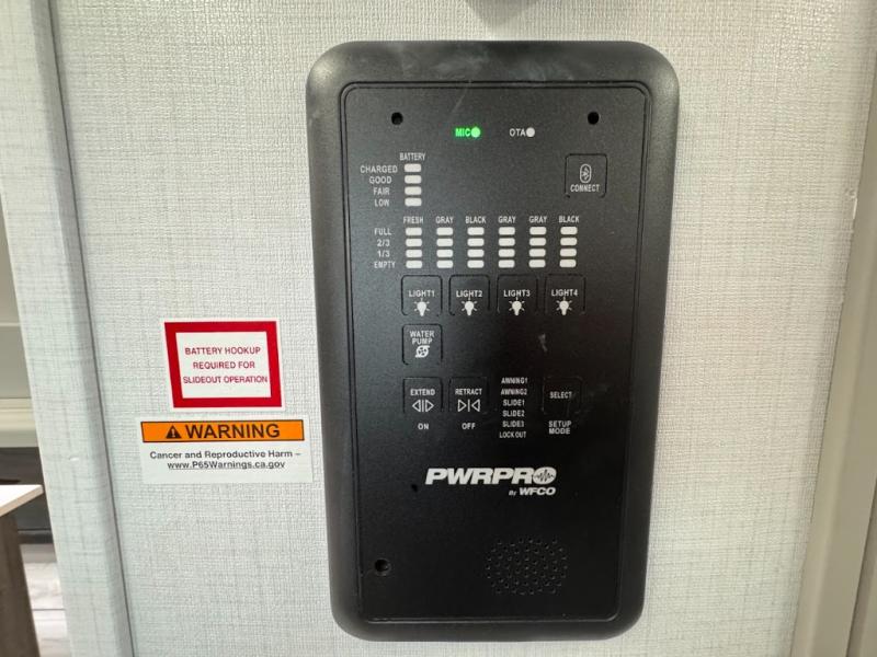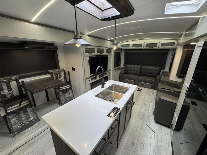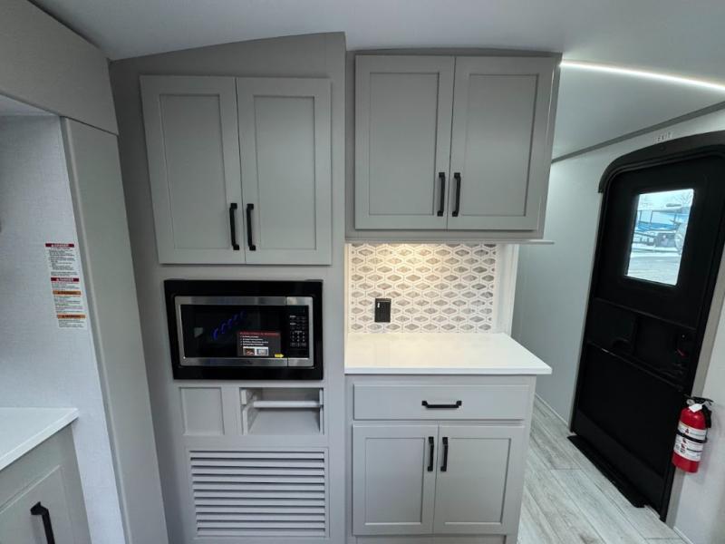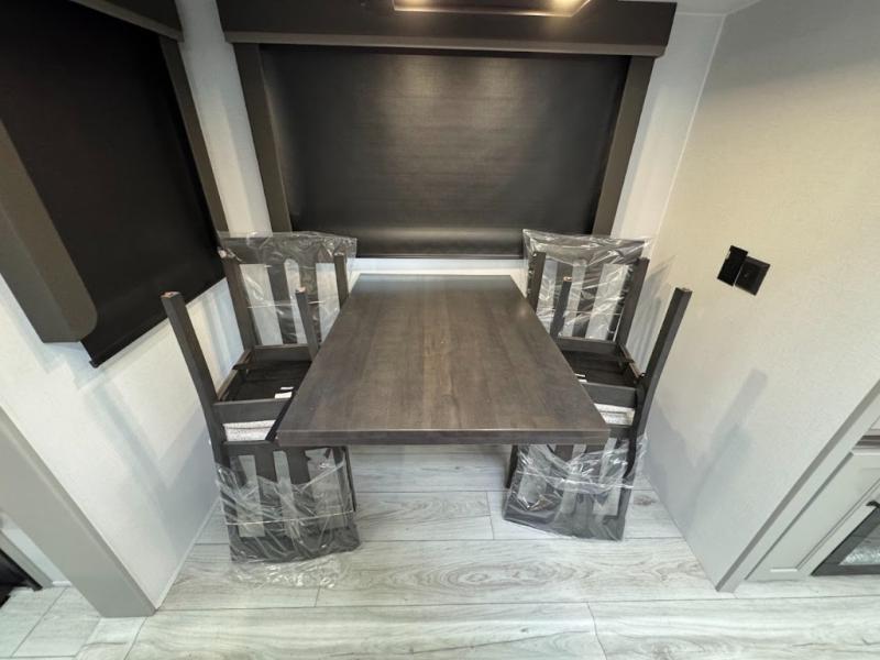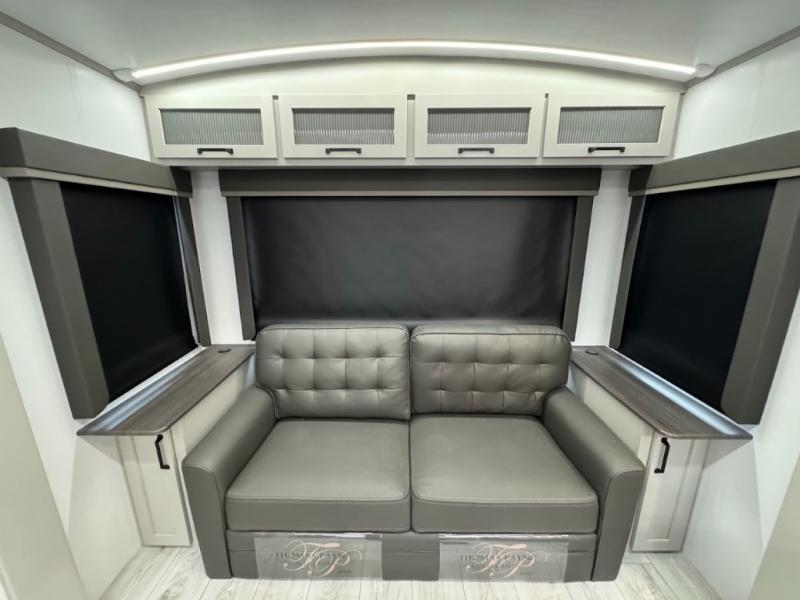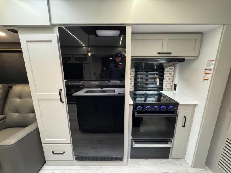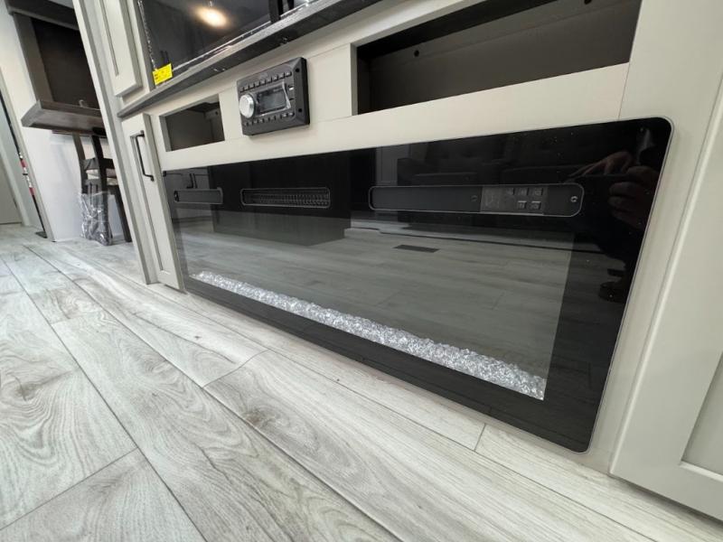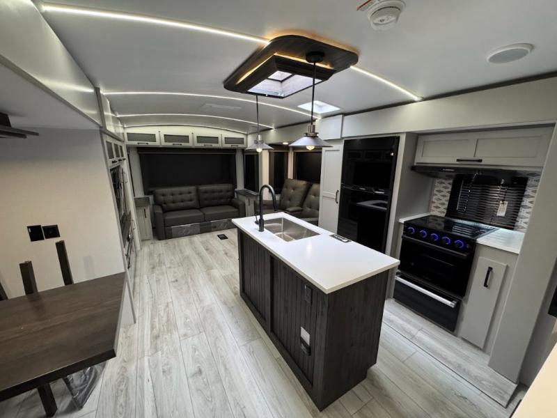 A spacious rear living area is created by two opposing slide outs giving everyone plenty of floor space to move from the sofa sleeper to the double entry bathroom and front private bedroom. You can relax on the theater seats while watching the 50" HDTV with fireplace below, and dine at the booth dinette. The kitchen island is a great place to wash the veggies and fruit, and prepare meals. The cook will have full amenities including more counter space near the microwave. And there is an outside kitchen with a flip-out stove and more. The slide out king bed gives you more space in the front bedroom, and you will find plenty of storage and a place for your best friend in the built-in pet kennel.