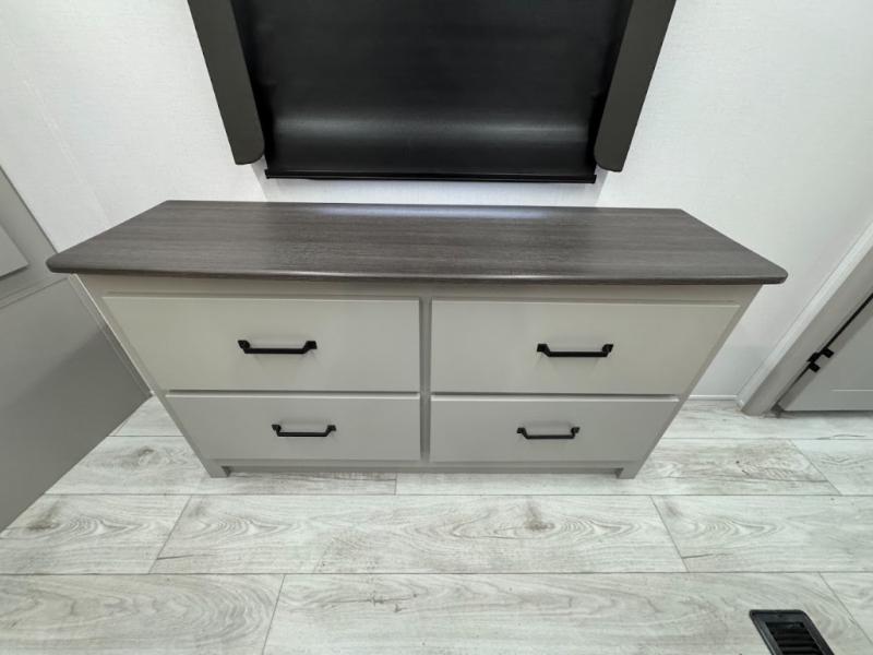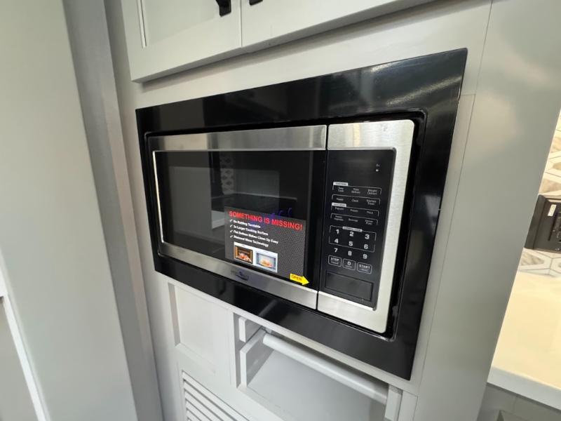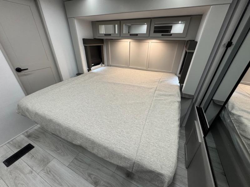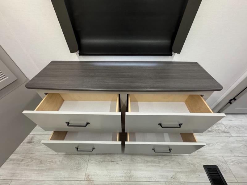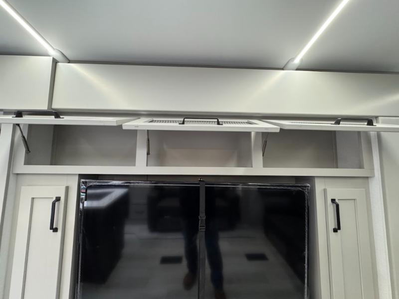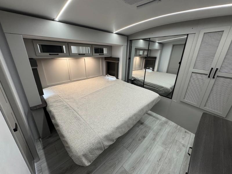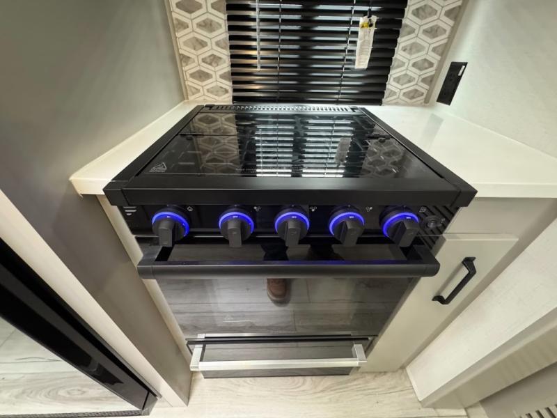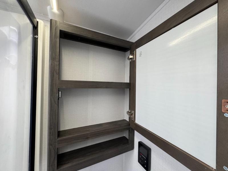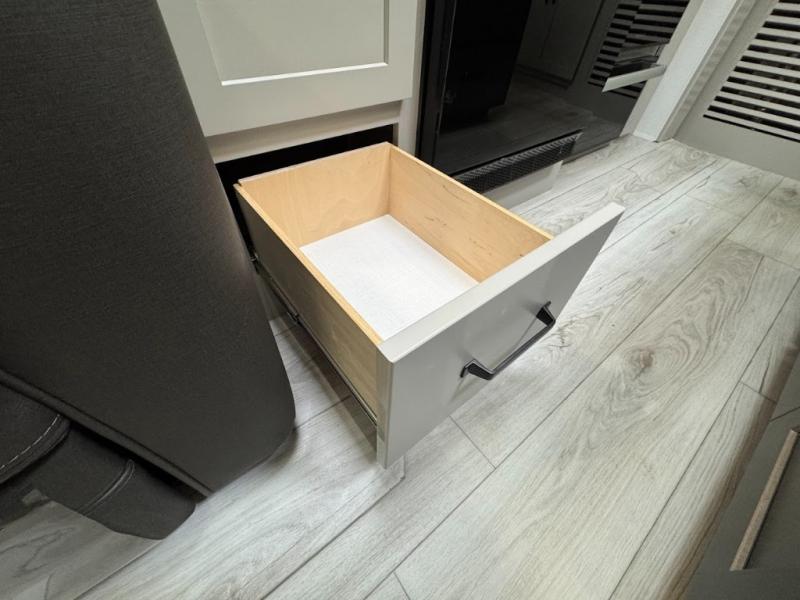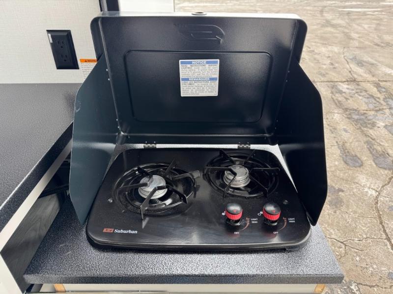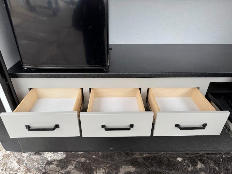 A spacious rear living area is created by two opposing slide outs giving everyone plenty of floor space to move from the sofa sleeper to the double entry bathroom and front private bedroom. You can relax on the theater seats while watching the 50" HDTV with fireplace below, and dine at the booth dinette. The kitchen island is a great place to wash the veggies and fruit, and prepare meals. The cook will have full amenities including more counter space near the microwave. And there is an outside kitchen with a flip-out stove and more. The slide out king bed gives you more space in the front bedroom, and you will find plenty of storage and a place for your best friend in the built-in pet kennel.