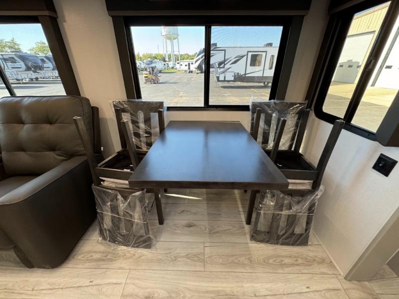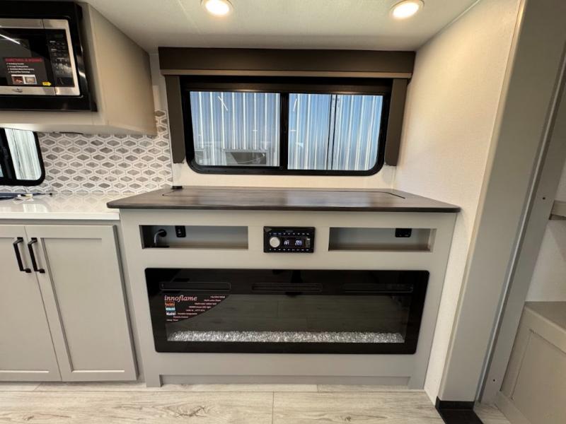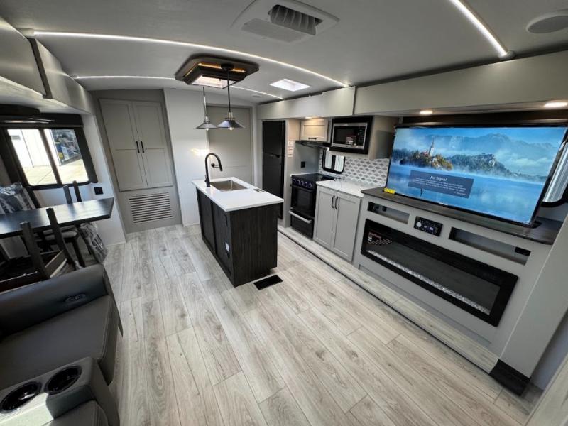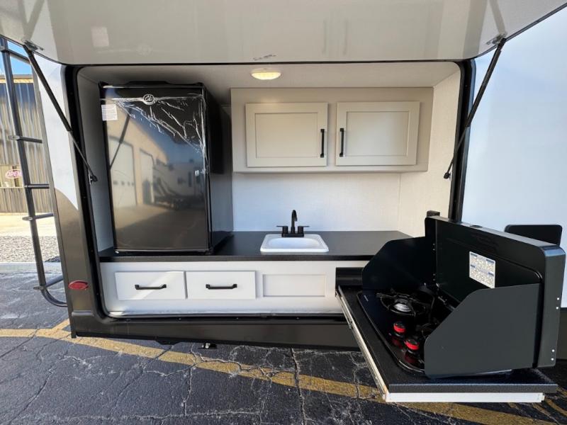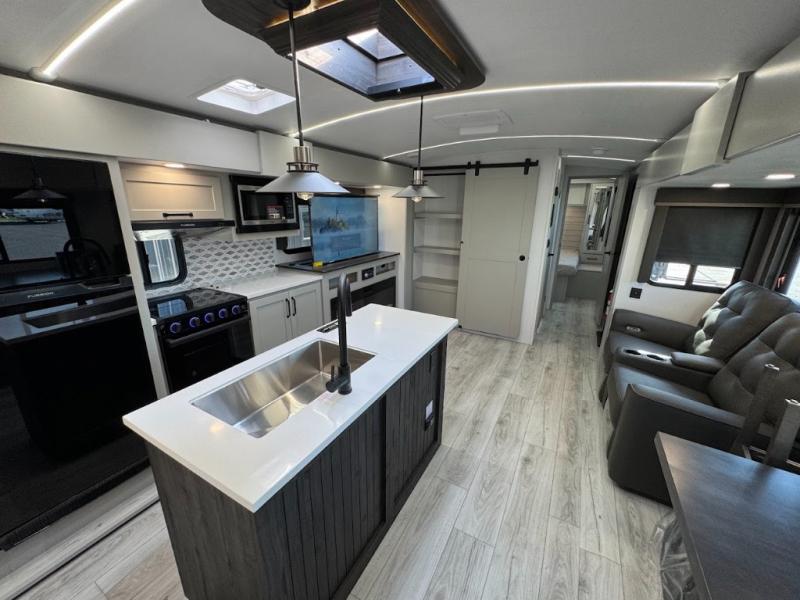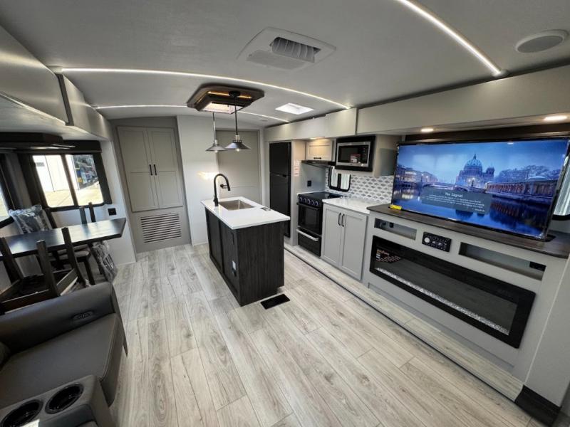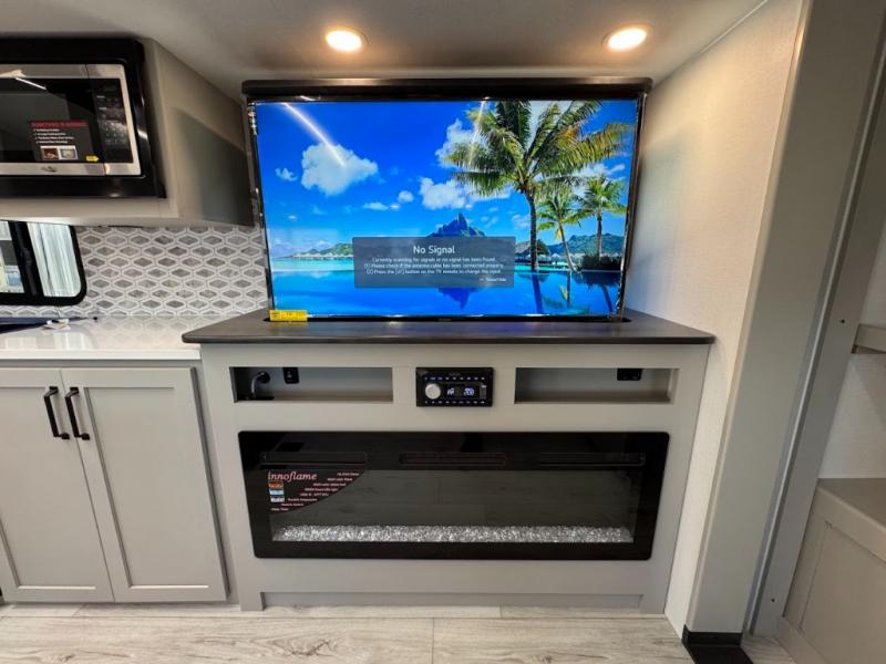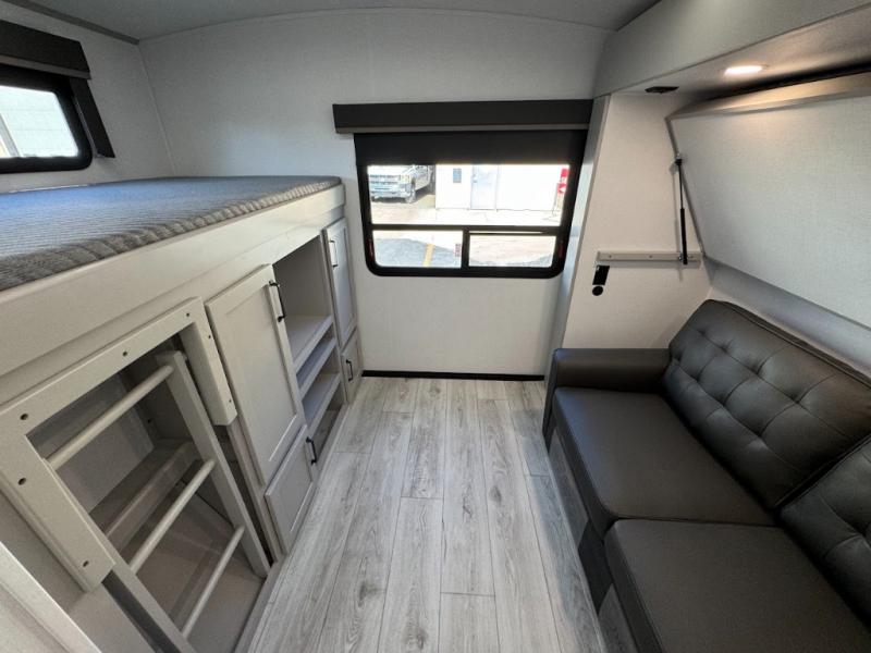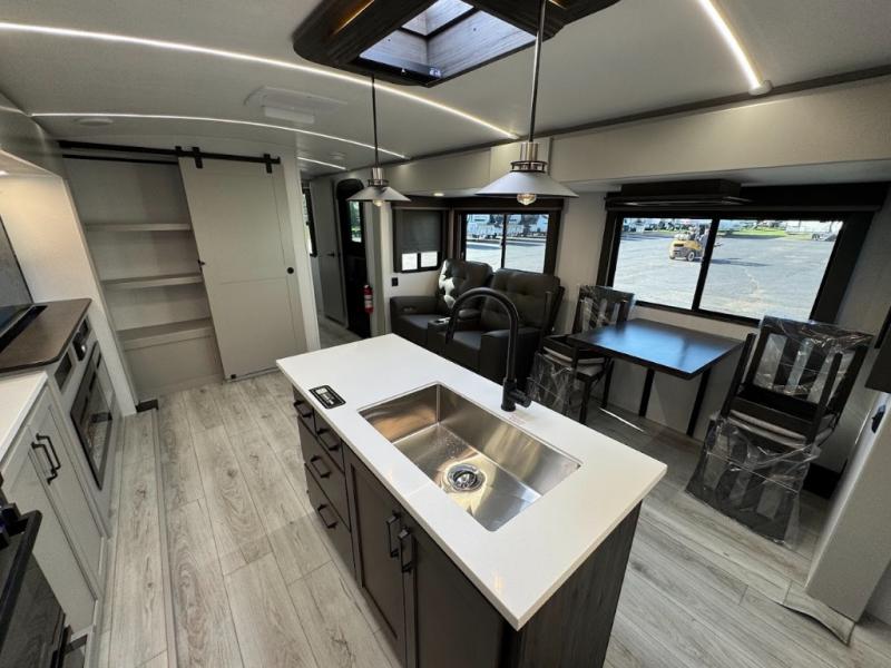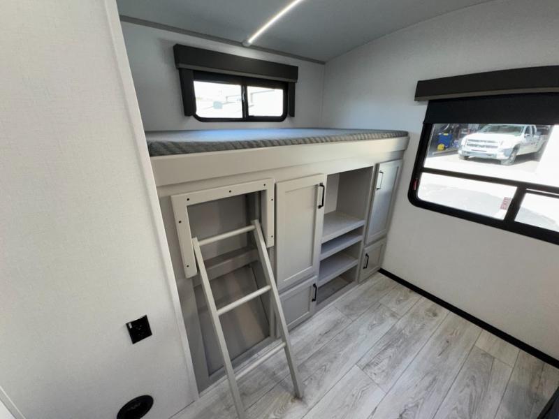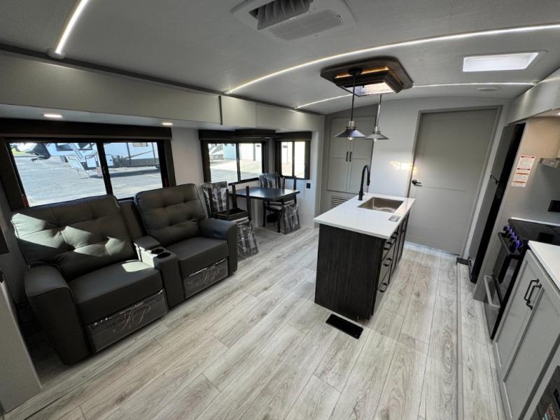When you enjoy entertaining guests and relaxing both inside and outside at the campgrounds, this trailer has you covered! There is a 20' awning along the exterior, a drop frame pass-through storage to carry larger gear like camping chairs, outdoor tables, fishing poles and such, plus an outside kitchen to make a few meals. The inside is spacious with dual opposing slides in the main living and kitchen area, and the private bunkhouse has a slide out with a sofa sleeper and bunk above. There is a second bunk above an entertainment center that your guests will surely appreciate. You will have a queen bed in the front bedroom, and the full bathroom will keep everyone refreshed. The kitchen has full amenities, plus a kitchen island with a skylight for more natural lighting, a sofa sleeper and booth dinette.